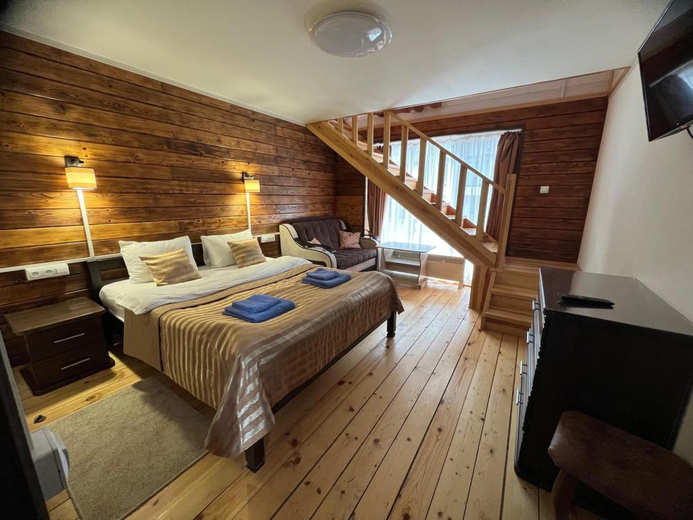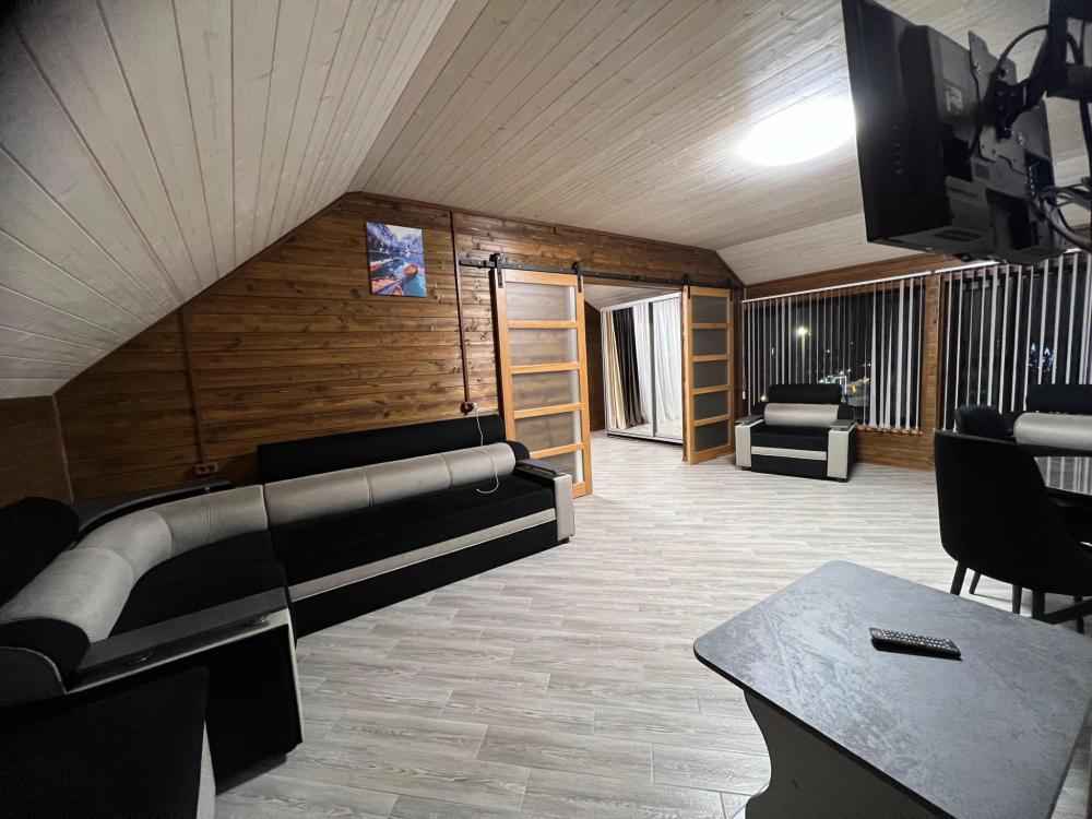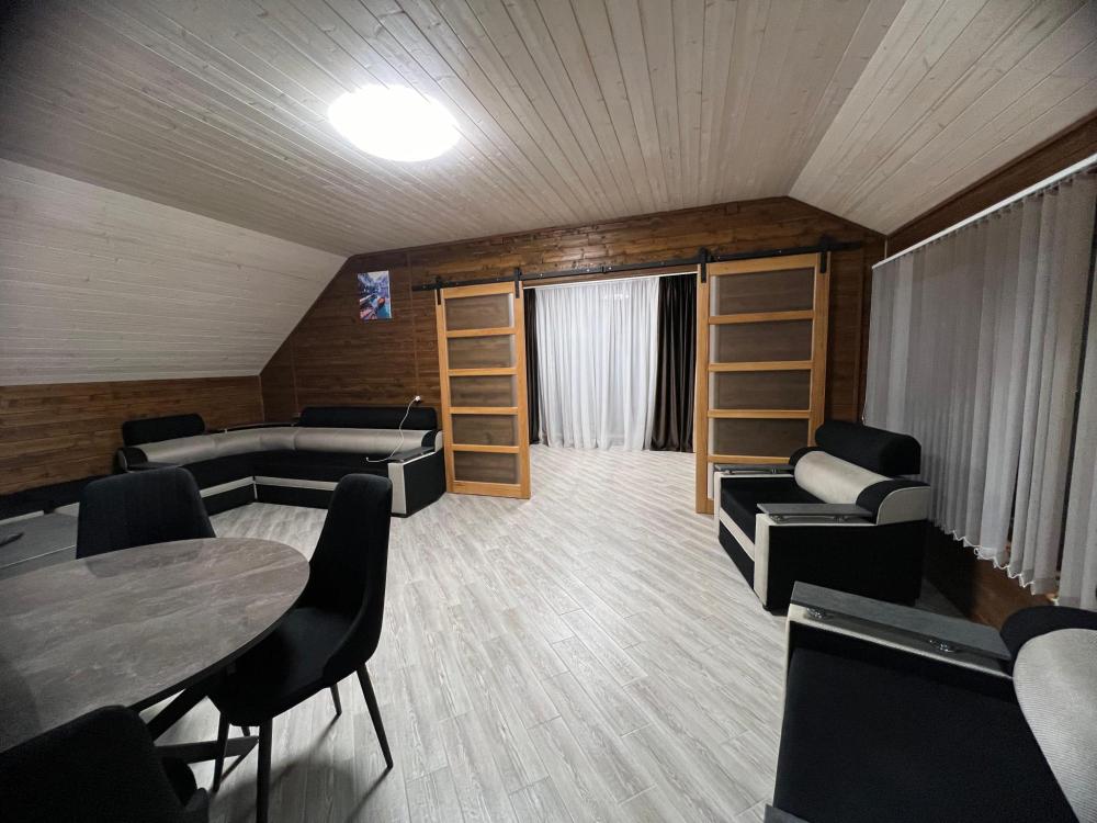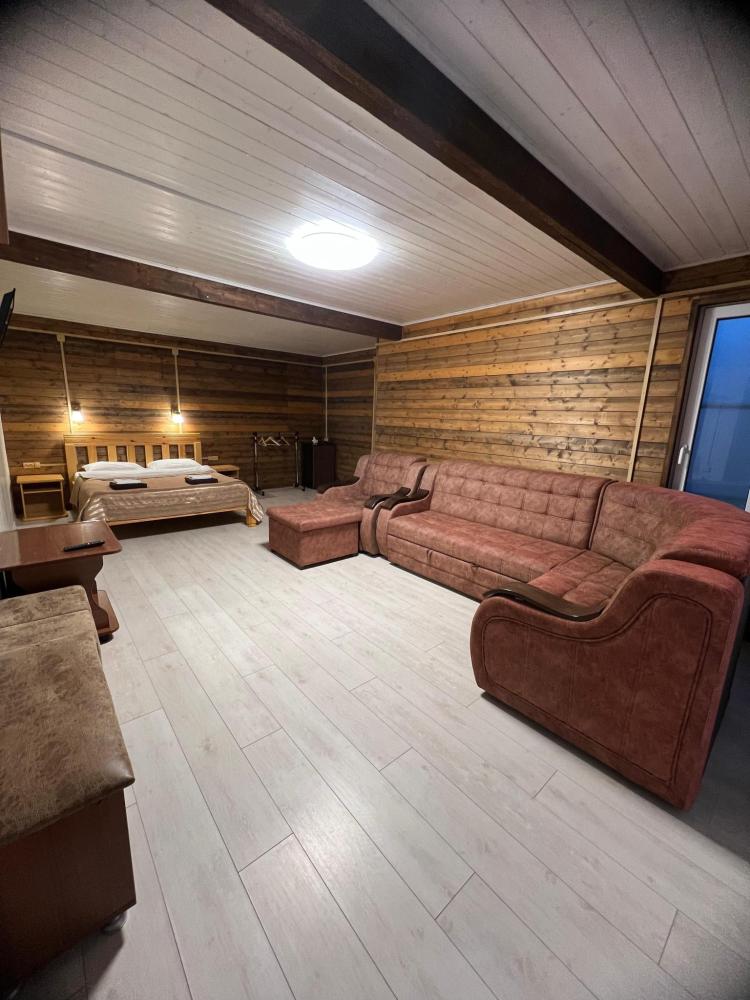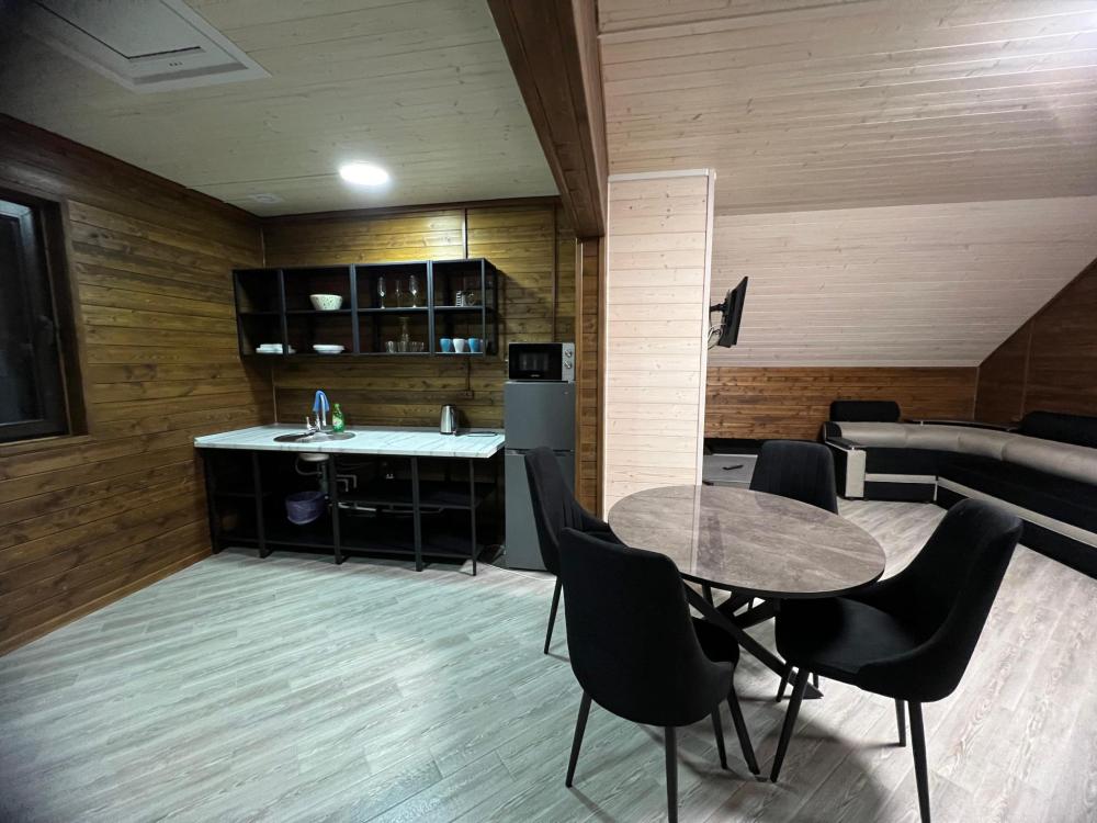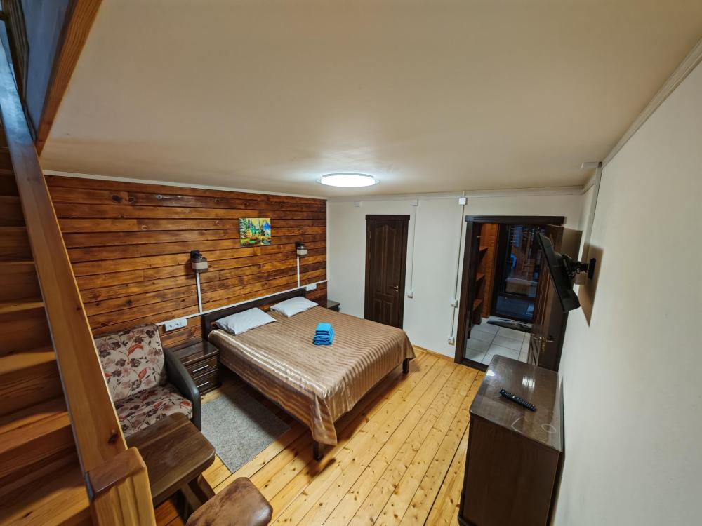 Пятиместный номер комфорт, расположен на втором этаже, в номере большая двуспальная кровать, большой угловой диван, ТВ, холодильник, душ и туалет, WiFi, тёплый пол, кухня-столовая на первом этаже со всем необходимым для готовки и ТВ