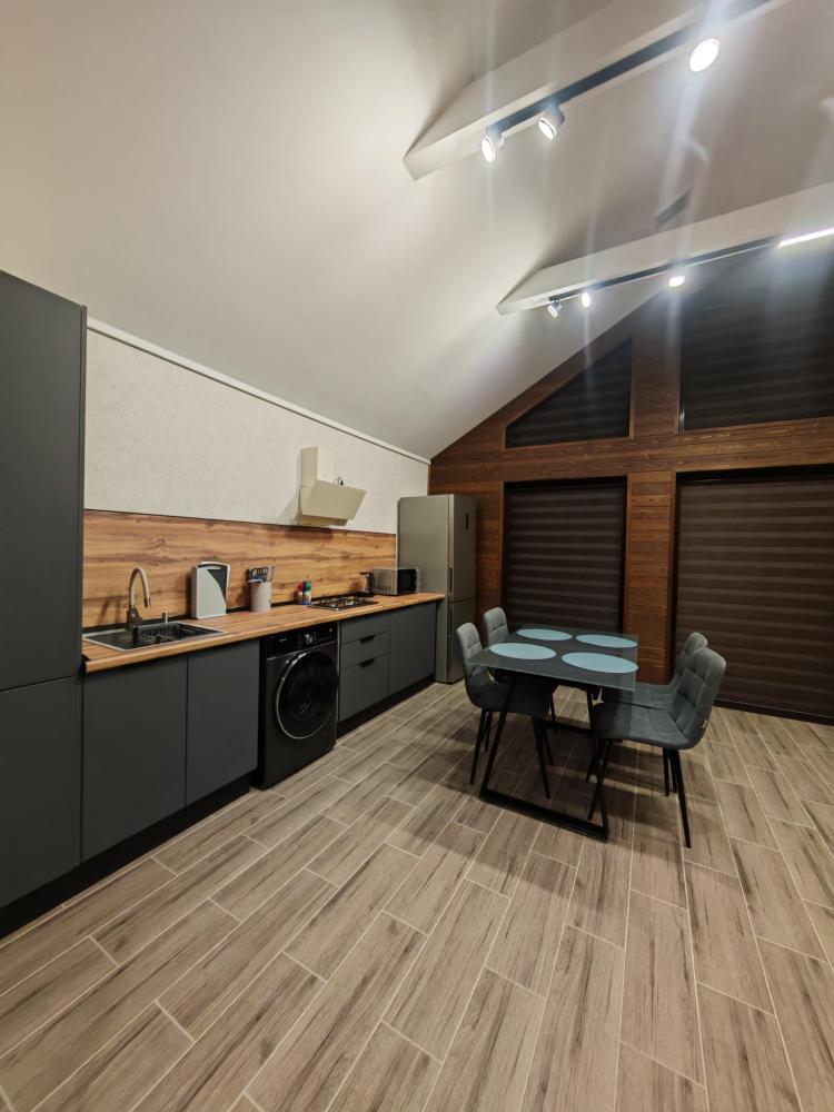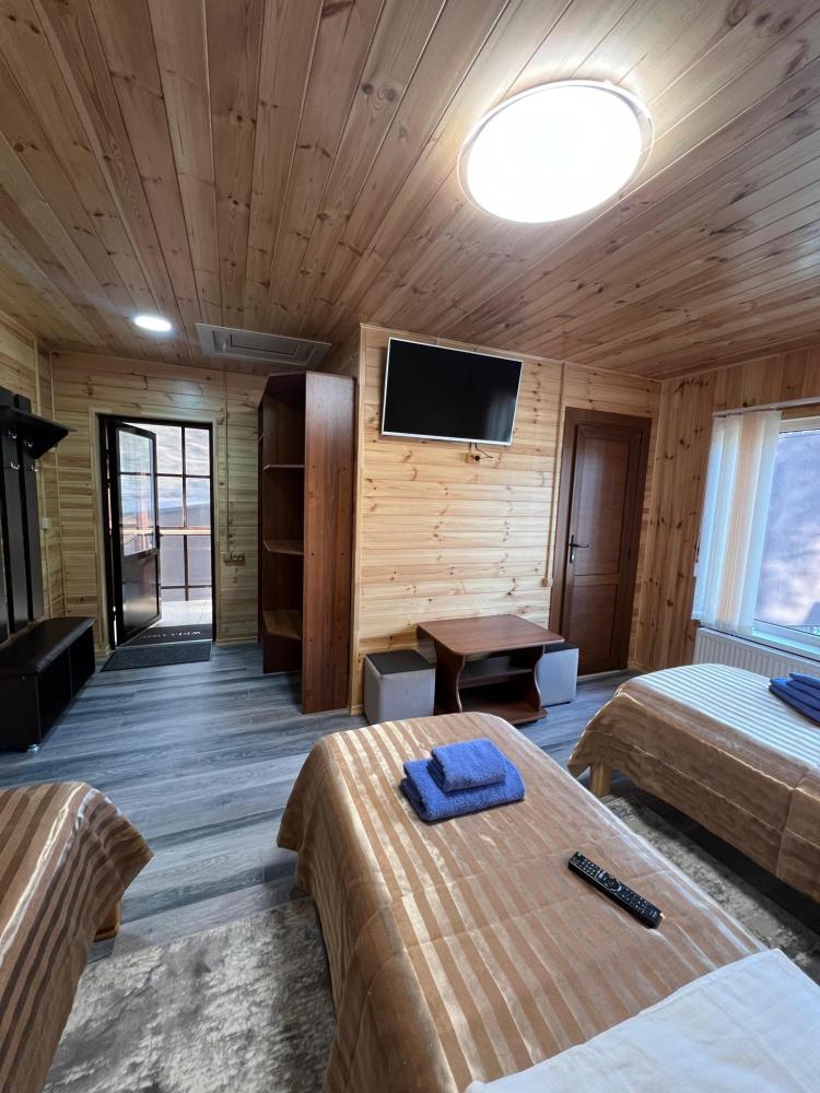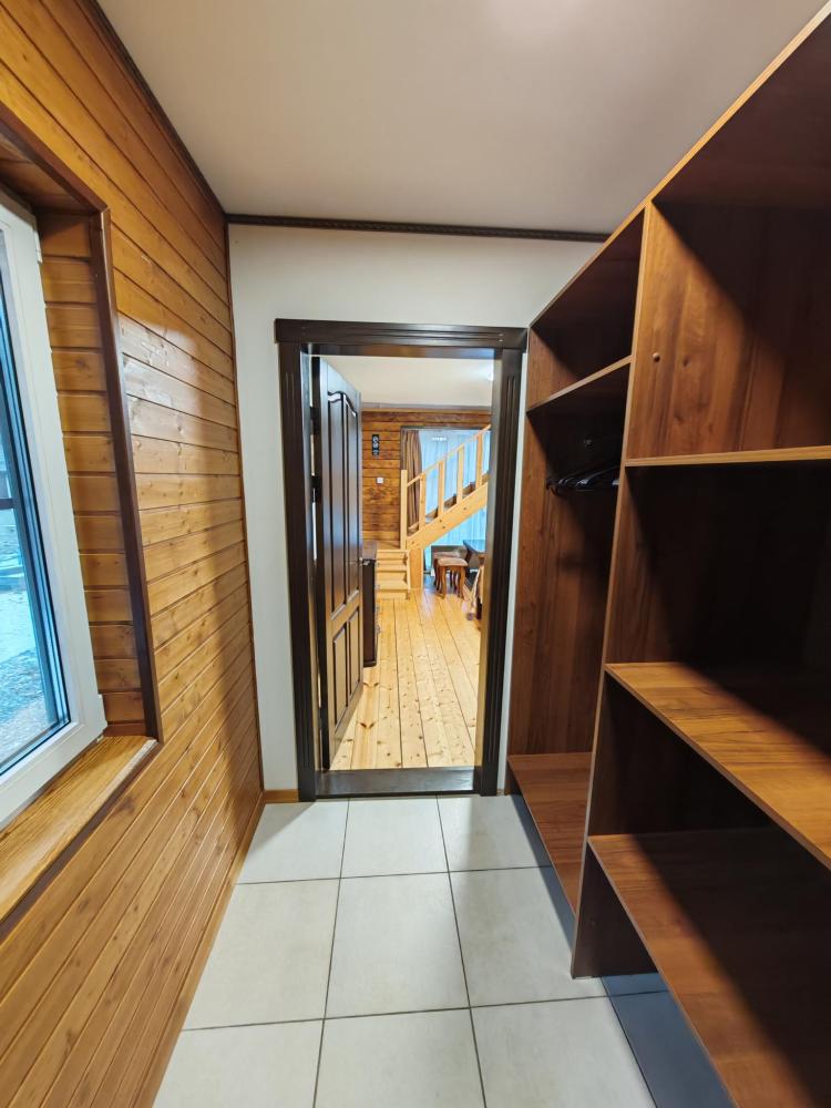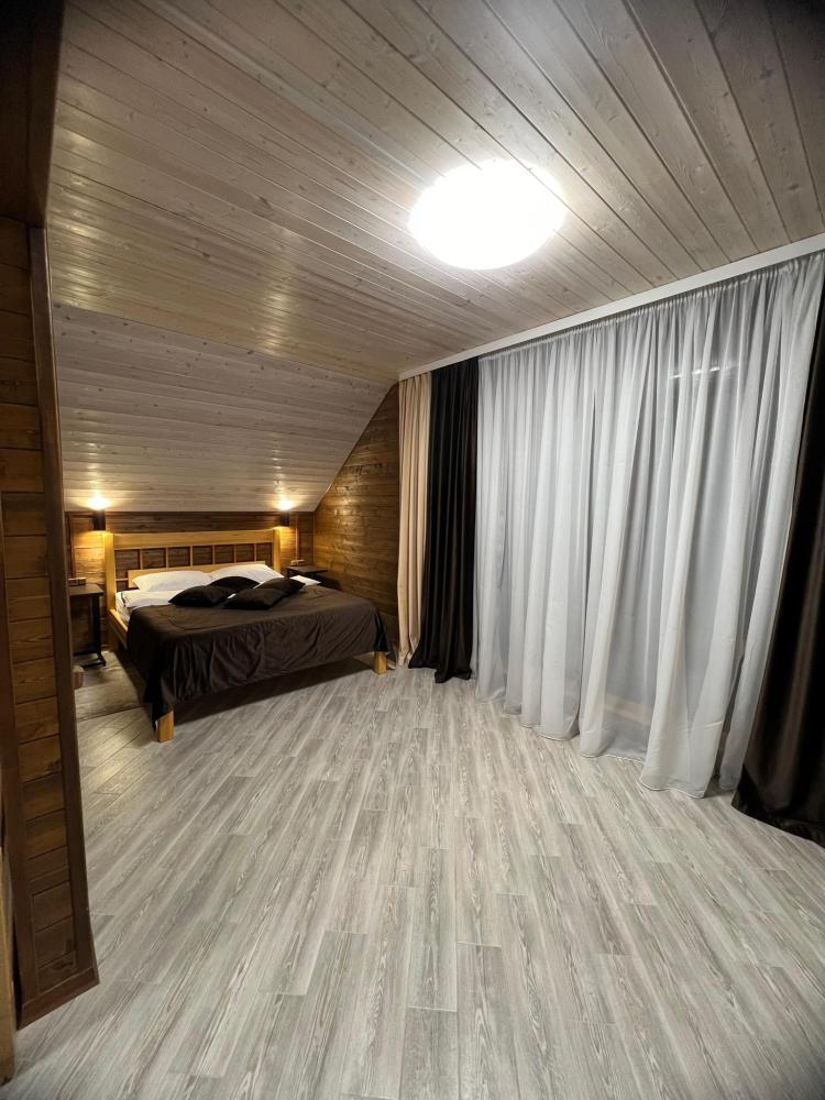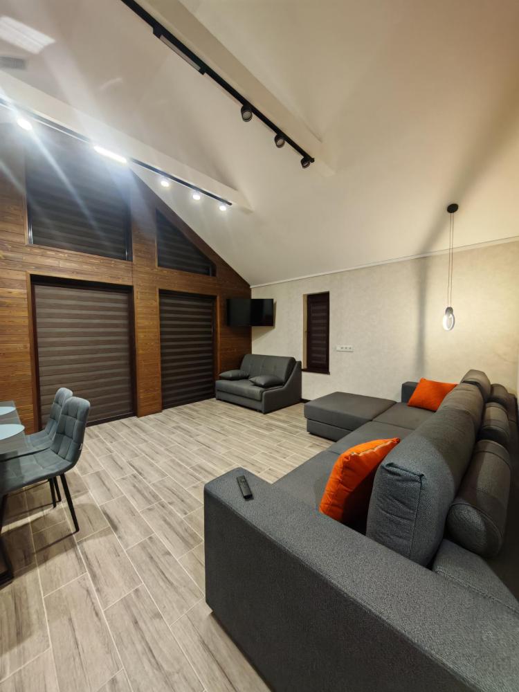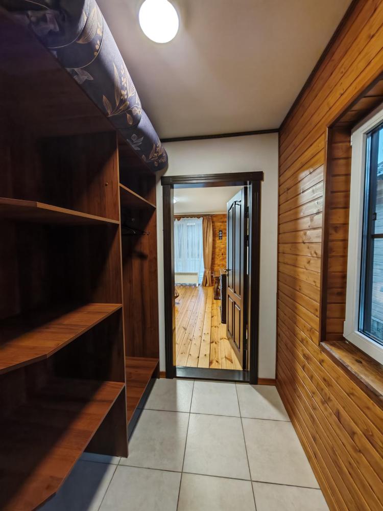 Пятиместный номер комфорт, расположен на втором этаже, в номере большая двуспальная кровать, большой угловой диван, ТВ, холодильник, душ и туалет, WiFi, тёплый пол, кухня-столовая на первом этаже со всем необходимым для готовки и ТВ