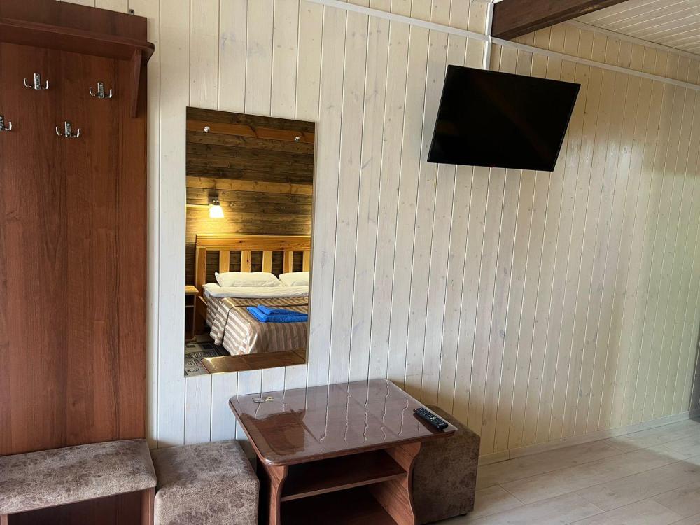 Трехместный номер в домике с отдельным входом, в номере большая двуспальная кровать, удобный диванчик, ТВ, холодильник,чайник, душ и туалет, WiFi, тёплый пол, кухня-столовая в соседнем здании со всем необходимым для готовки и ТВ