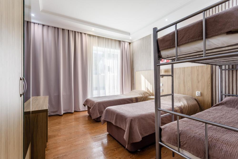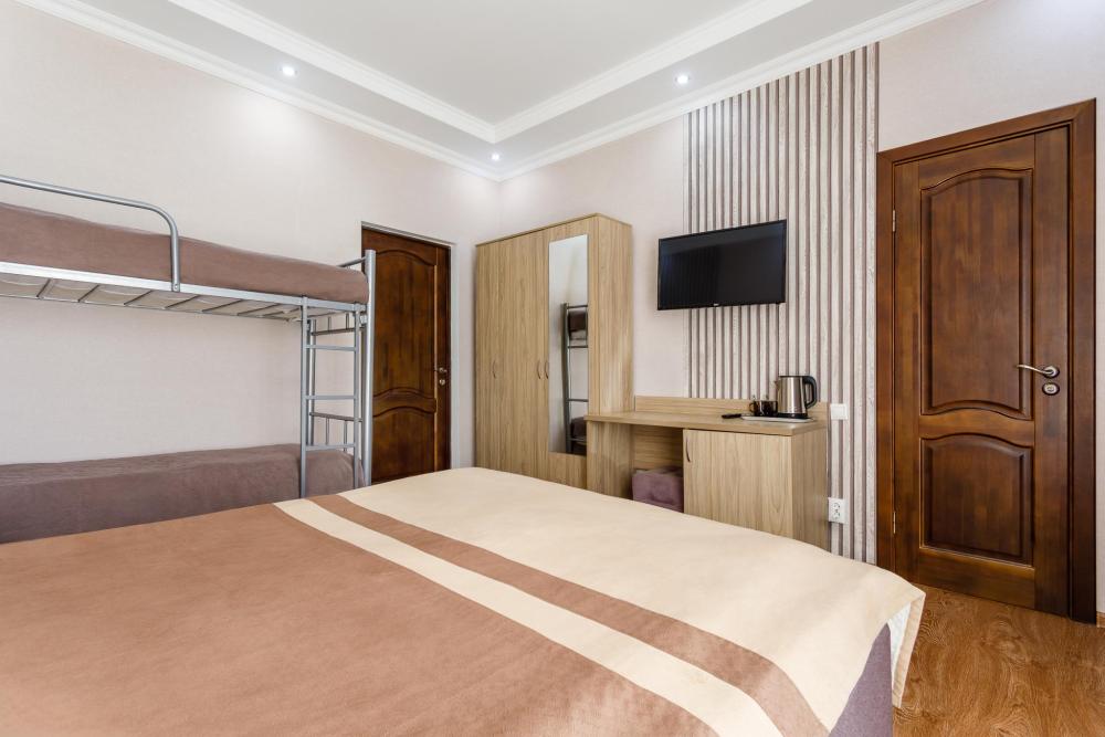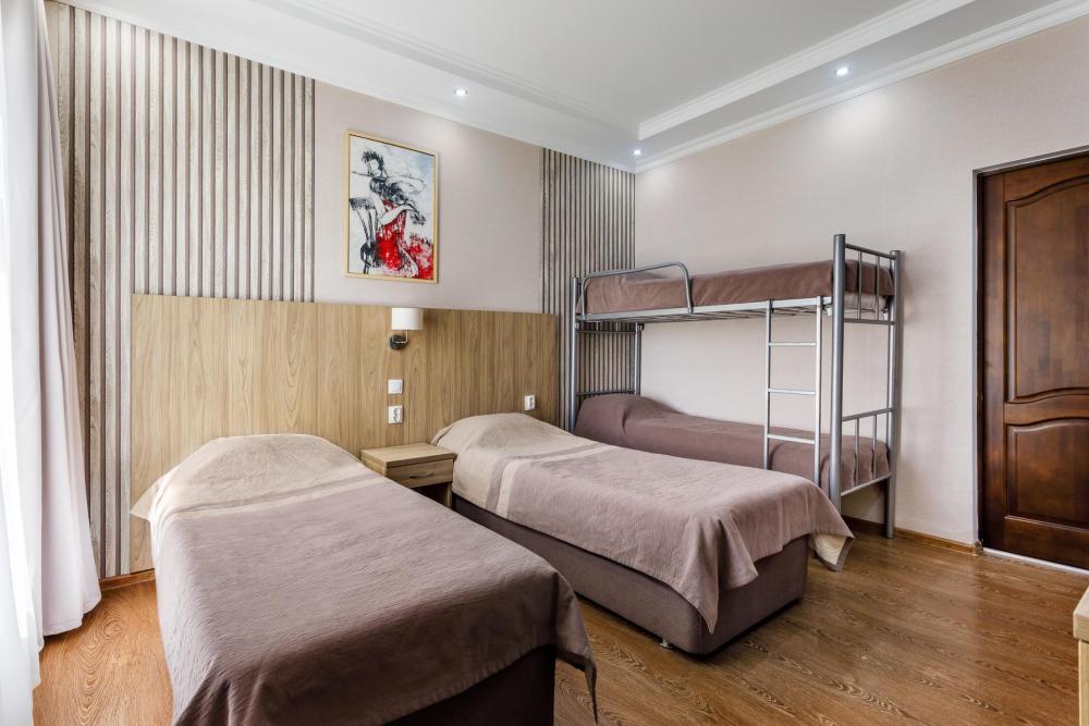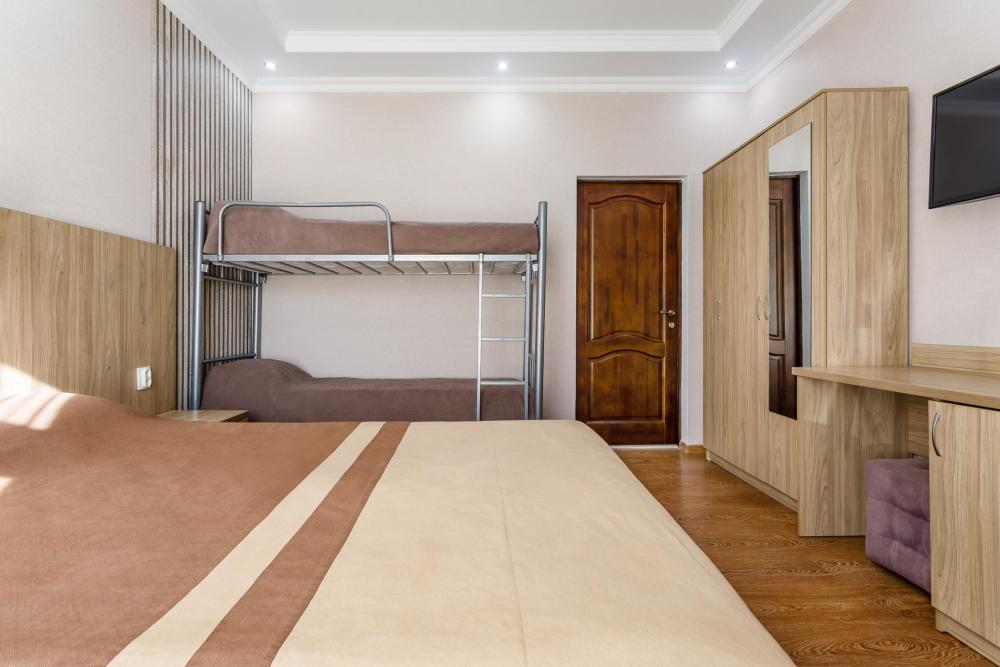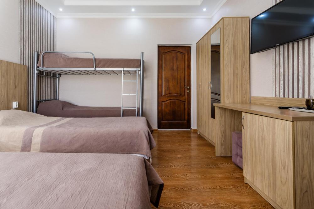 Четырёхместный номер с двухъярусной кроватью — удобный вариант для семьи или небольшой компании. В номере установлены две односпальные кровати и одна двухъярусная кровать, что обеспечивает комфортное размещение до четырёх человек. Гостям доступны телевизор, рабочая зона и шкаф для одежды. В ванной комнате — душ, а также одноразовые туалетные принадлежности: шампунь, гель для душа, зубная щётка и паста. Интерьер выполнен в светлых, нейтральных тонах, создающих приятную и спокойную атмосферу. Идеален для активного отдыха в горах и непринуждённого проживания.