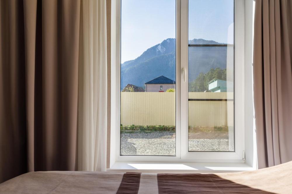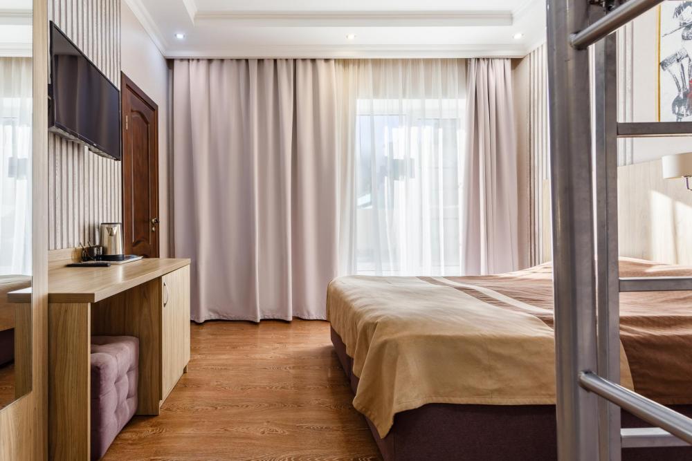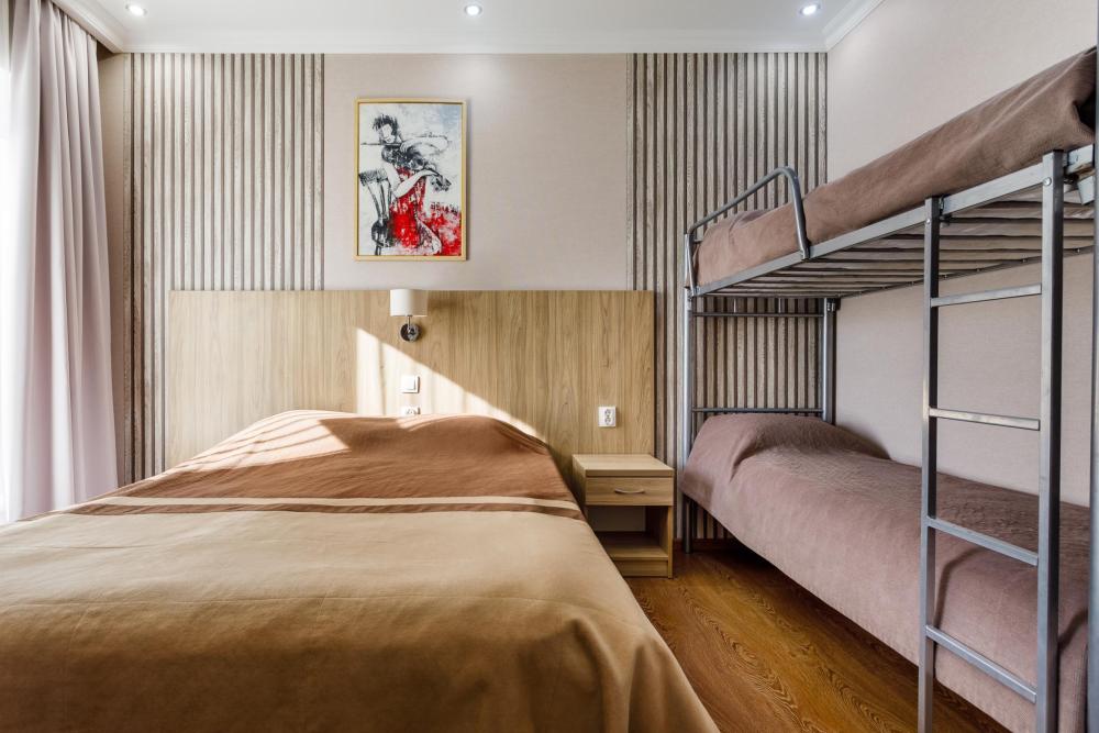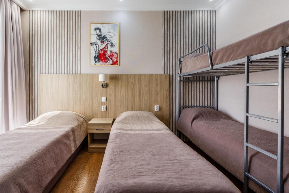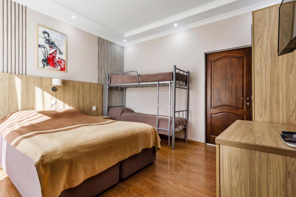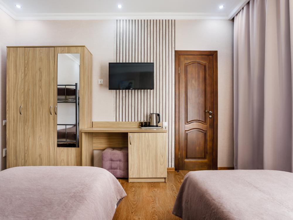 Четырёхместный номер с двухъярусной кроватью — удобный вариант для семьи или небольшой компании. В номере установлены две односпальные кровати и одна двухъярусная кровать, что обеспечивает комфортное размещение до четырёх человек. Гостям доступны телевизор, рабочая зона и шкаф для одежды. В ванной комнате — душ, а также одноразовые туалетные принадлежности: шампунь, гель для душа, зубная щётка и паста. Интерьер выполнен в светлых, нейтральных тонах, создающих приятную и спокойную атмосферу. Идеален для активного отдыха в горах и непринуждённого проживания.