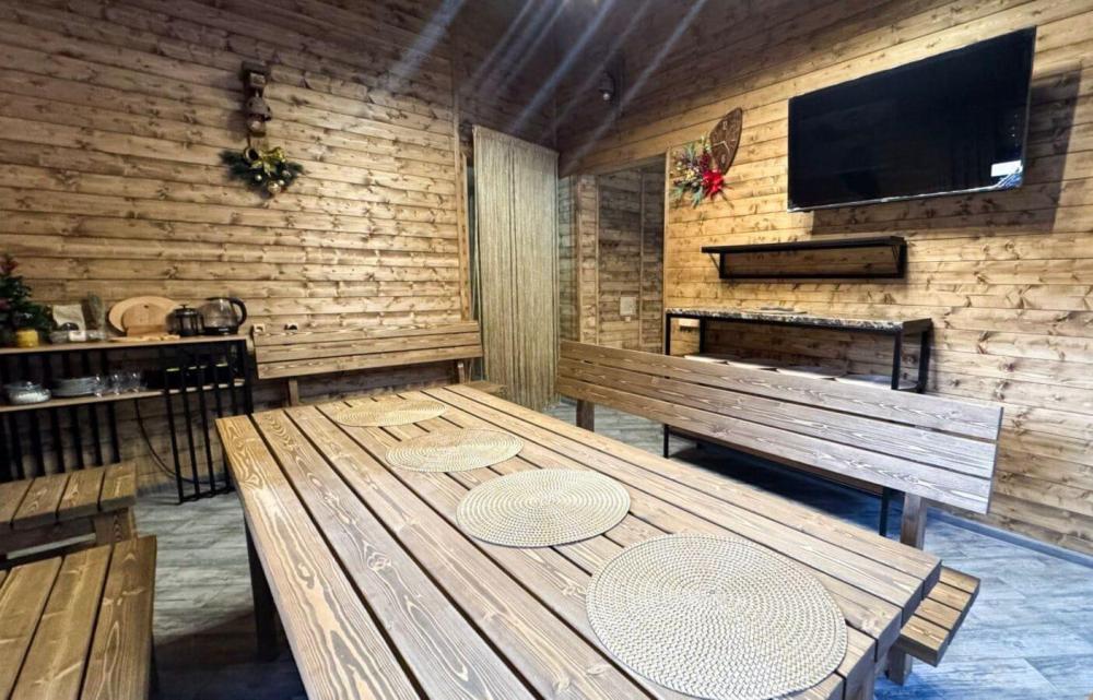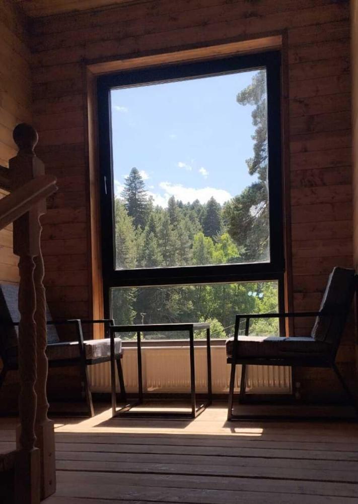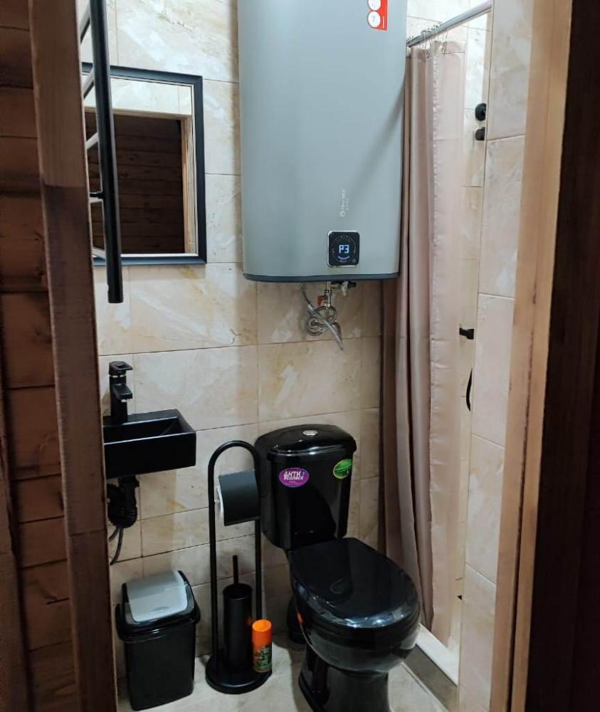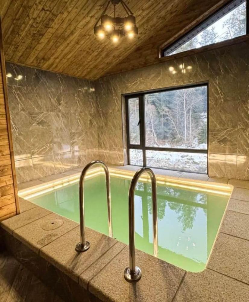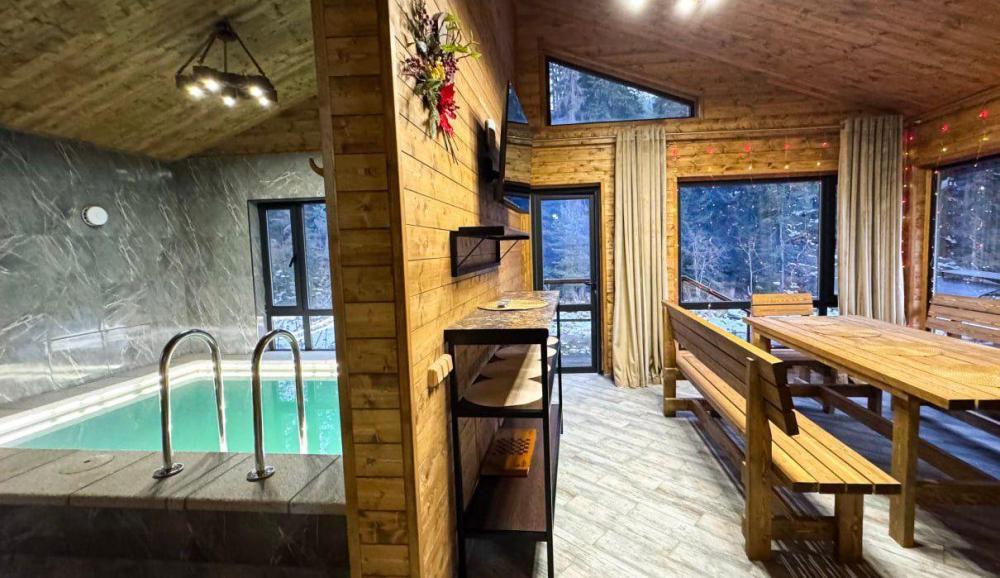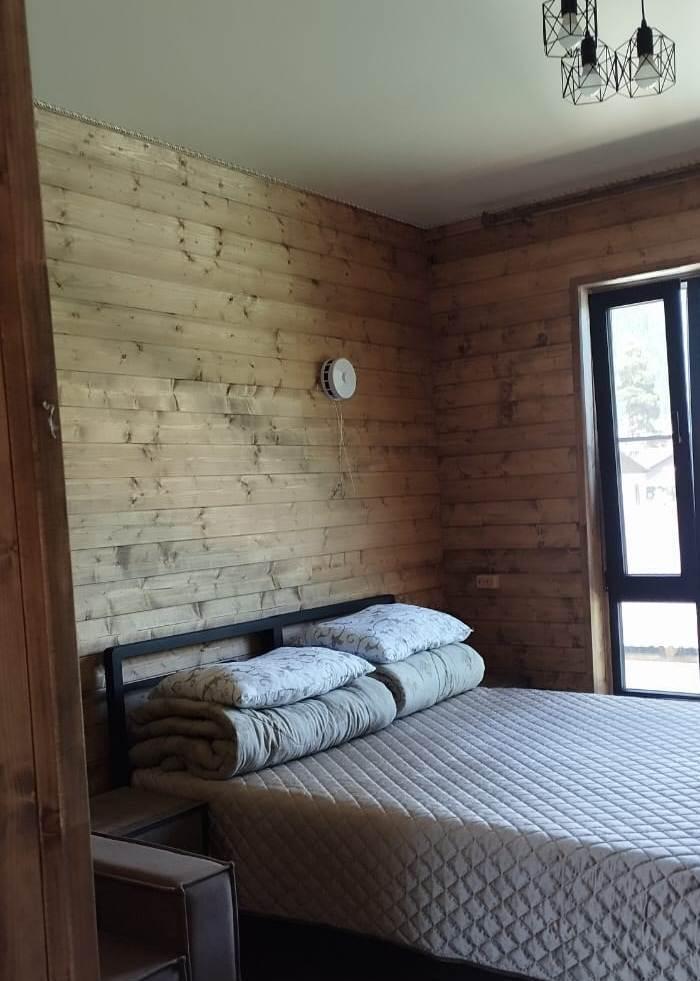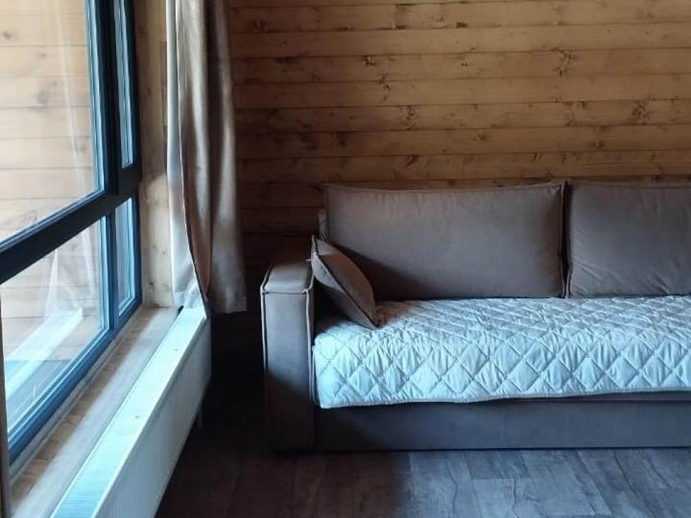 Просторный двухкомнатный номер с балконом .С балкона открывается шикарный вид на горную реку. Для отдыха в номере двуспальная кровать, две односпальных кровати-трансформера и два раскладных кресла. Санузел со всем необходимым. На первом этаже гостевого дома есть общая кухня, баня с бассейном.