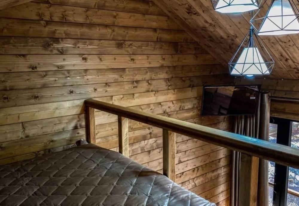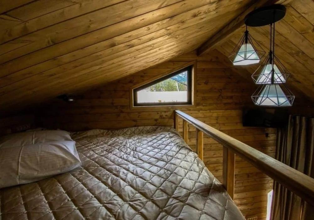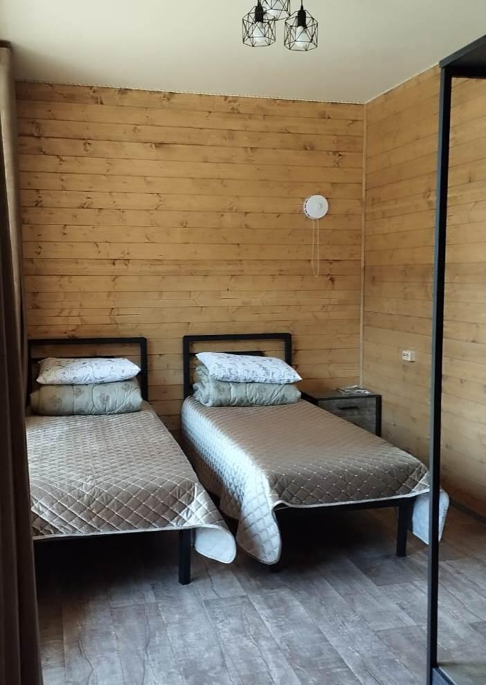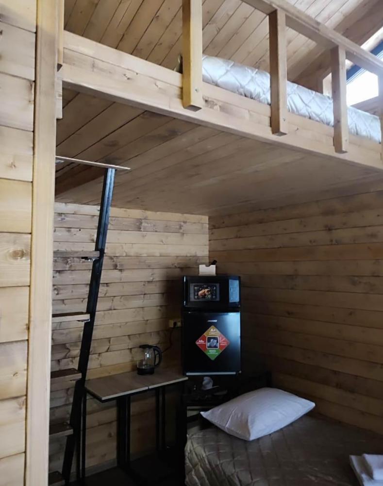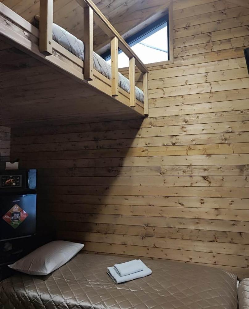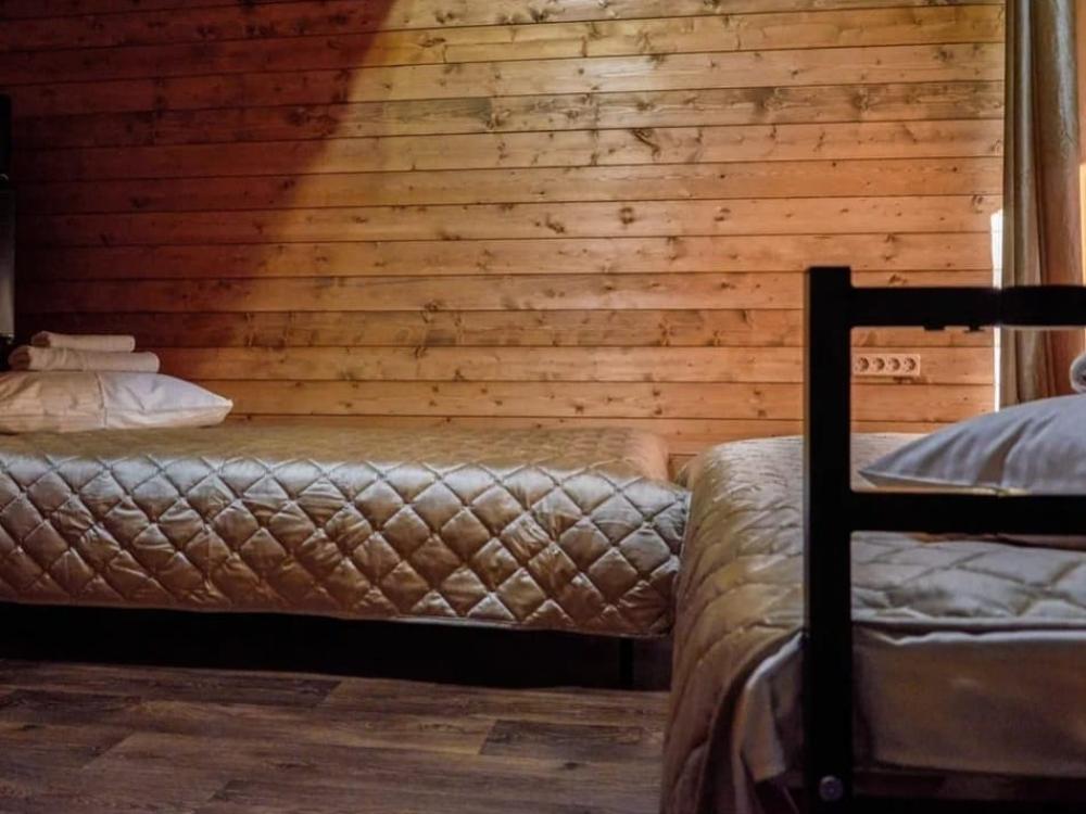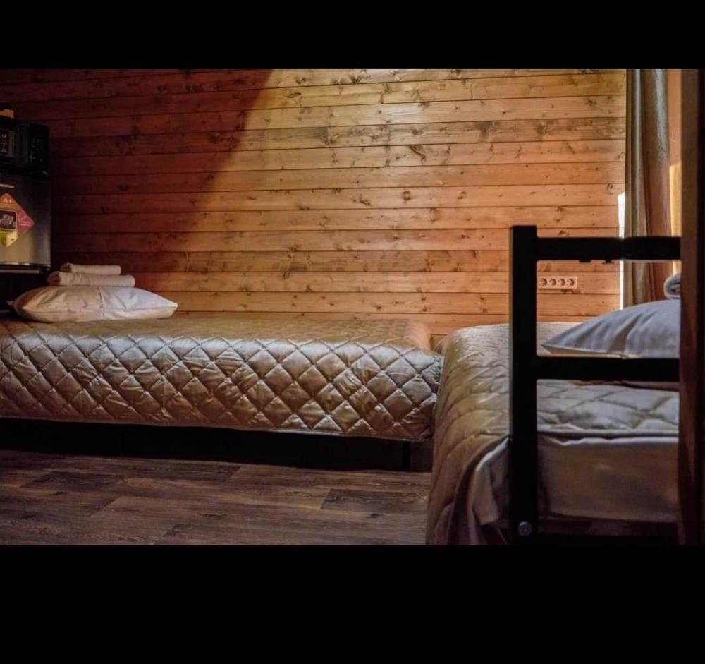 Двухуровневый четырёхместный номер. Для отдыха гостей предлагаем две односпальных кровати и двухместный матрас-кровать на втором уровне номера. Современный санузел оснащенный всем необходимым . Рядом с номером, на этаже есть оборудованная кухня , баня с бассейном.