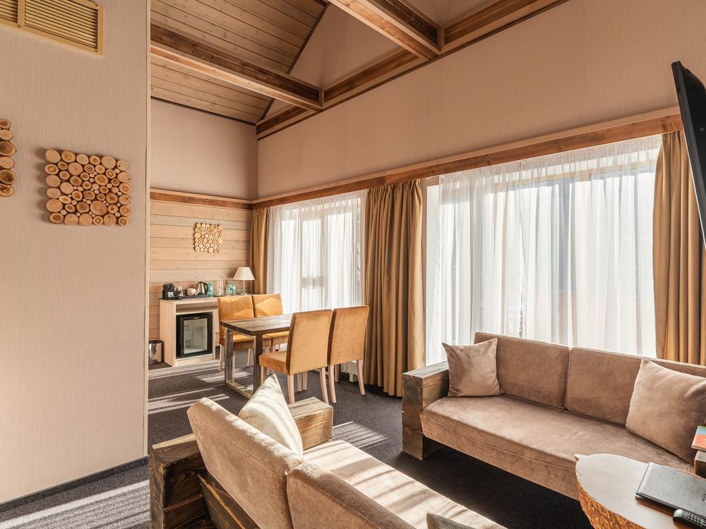 Просторный номер площадью 35 кв.м с одной двухспальной кроватью размера кинг-сайз и с обособленной зоной отдыха с диваном. Номер с панорамными окнами или с балконом оборудован зеркальным LED телевизором диагональю 42 дюйма, чайной зоной, мини баром, раскладным диваном со столиком и письменным столом в зоне отдыха, эргономичной группой шкафов с зеркалом в пол и вместительной гардеробной в зоне спальни, комфортной ванной комнатой с душем. Пространство номера спроектировано с зонированием, что дает ощущение обособленности и дополнительного комфорта. Номер оформлен в стиле современного горного шале из натуральных материалов, с природными элементами декора и мягким ковровым покрытием. Отделка номера выполнена в теплых древесных тонах, с яркими акцентами золотистого текстиля и гобеленов. Номер оснащен: одной кроватью размера кинг-сайз с декоративным изголовьем с подсветкой, диваном с раздвижным механизмом размером квин-сайз, прикроватными тумбочками, индивидуальным прикроватным освещением, LED телевизором диагональю 42 дюйма, сейфом, телефоном, мини-баром, чайным набором с горным чаем и кофе с посудой для двоих, журнальным столиков, письменным столом и стулом с информационными материалами и канцелярскими принадлежностями, зеркалом и настольной лампой, зоной для размещения чемоданов, феном, косметикой для ванной и гигиеническими принадлежностями, комплектом полотенец, одноразовыми тапочками и банными халатами, наборами для шиться, чистки и ухода за обувью, набором для химчистки. Подходит для проживания 2-4 взрослых. Возможно поставить дополнительную кровать за дополнительную плату, при максимальном количество гостей не более 4 человек.