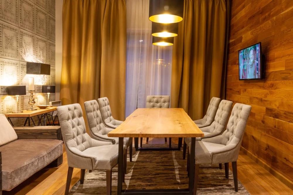 Апартаменты с одной спальней 46 кв.м.Апартаменты оснащены всем необходимым для комфортного отдыха:двуспальная или две односпальные кровати,есть место для хранения вещей, работает WI-FI,сейф,мини-бар,кухня. Гостям предоставляются принадлежности для душа, халаты,полотенца.Семейный Люкс площадью 54 кв.м с двумя отделенными спальнями с двумя двухспальными кроватями размера кинг-сайз, полностью оборудованной кухней с зоной отдыха с диваном и телевизором. Номер полностью приспособлен для проживания всей семьей или компанией до 5 человек, имеет полностью укомплектованную кухню, обеденный стол на 4 человека, комфортную зону отдыха с раздвижным диваном. Две отдельные спальни с собственными ванными комнатами обеспечат поистине домашний уют и максимальный комфорт. Номер оформлен в стиле современного горного шале из натуральных материалов, с природными элементами декора и мягким ковровым покрытием. Отделка номера выполнена в теплых древесных тонах, с яркими акцентами золотистого текстиля и гобеленов. Размер номера: 54м² • Бесплатный WiFi • Бесплатная парковка • Круглосуточная охрана