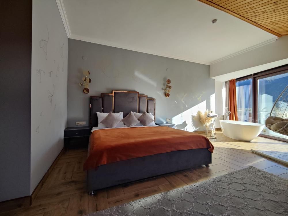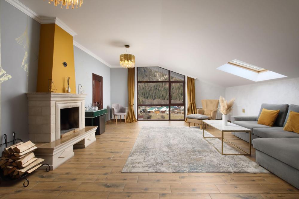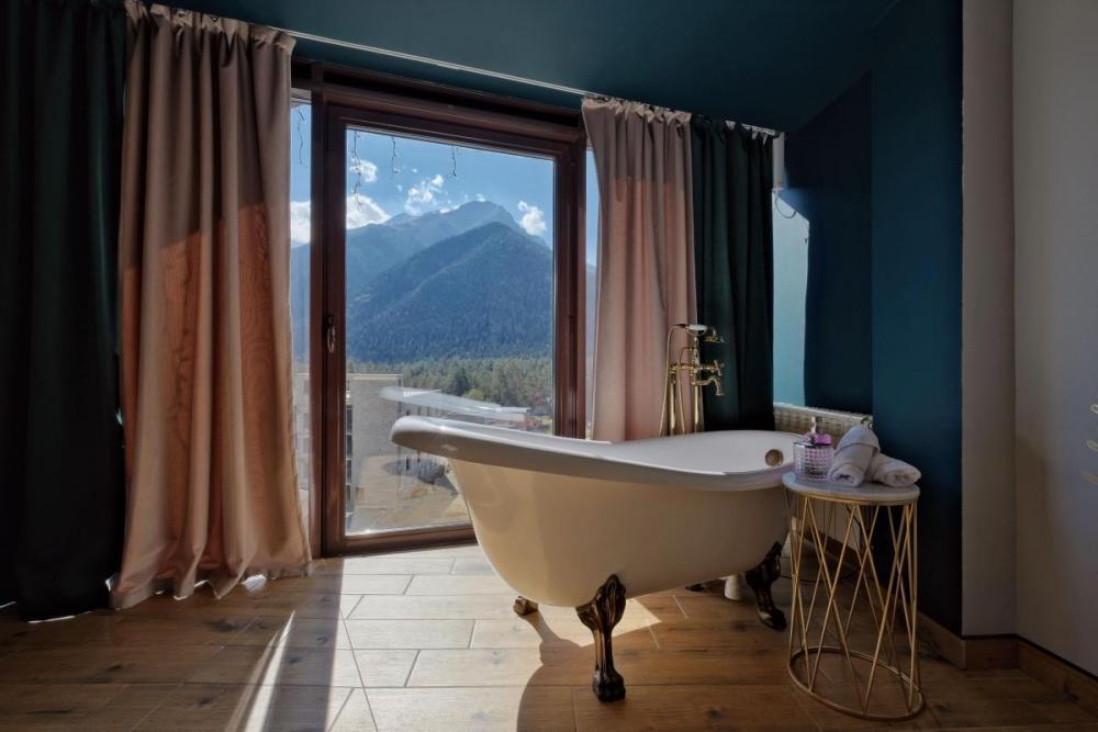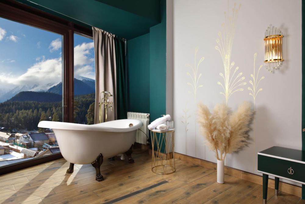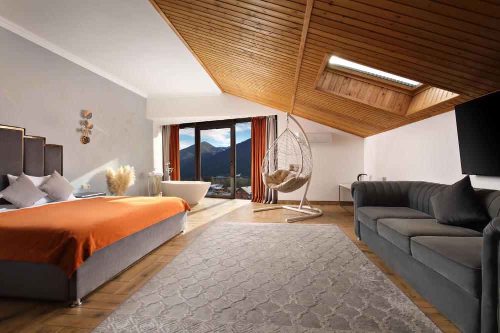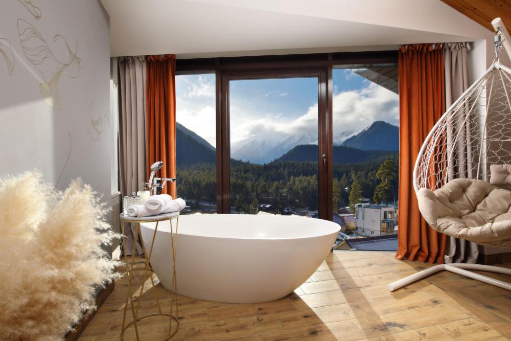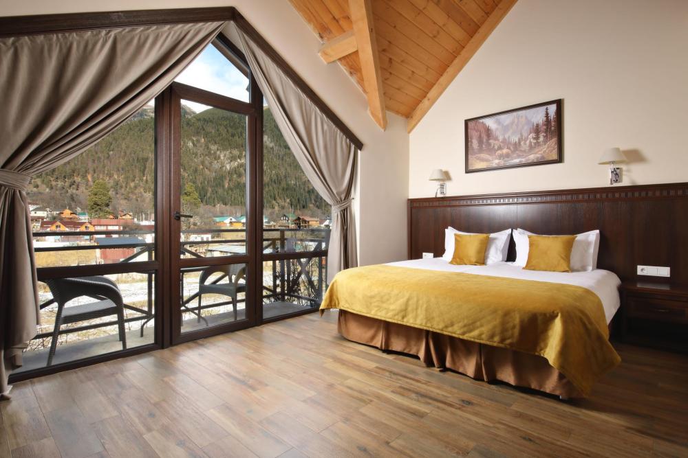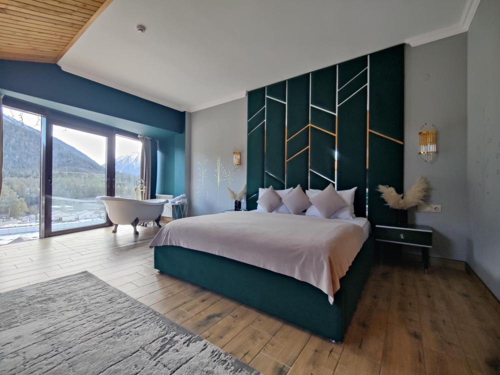 Двухкомнатный номер расположен в основном корпусе на пятом этаже. Номер с ванной у окна в спальне и французским балконом, с красивым видом на горы, также в номере есть двуспальная кровать и раскладной диван. Гостиная с камином, для уютных вечеров. В гостиной также имеется раскладной диван и панорамные окна с красивым видом на горы. Есть возможность установки детской кроватки либо еще одного дополнительного места. В номере есть набор полотенец, халаты, средства личной гигиены (шампунь, гель для душа, жидкое мыло, зубные наборы), тапочки, электрочайник, мини-холодильник, чайный сервиз, телевизор. Уборка номеров ежедневная, смена белья раз в три дня.