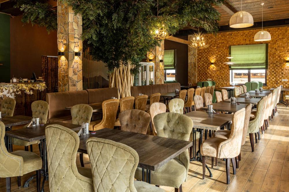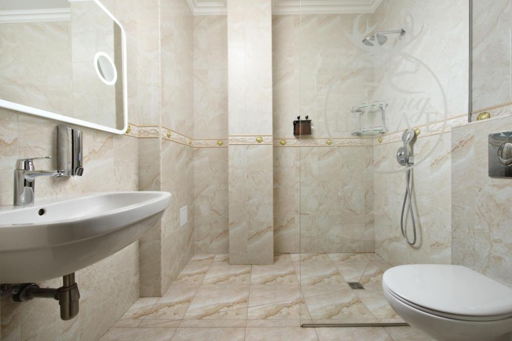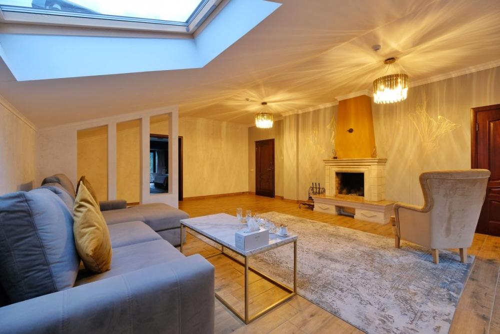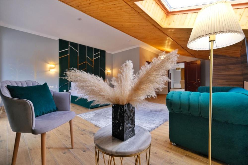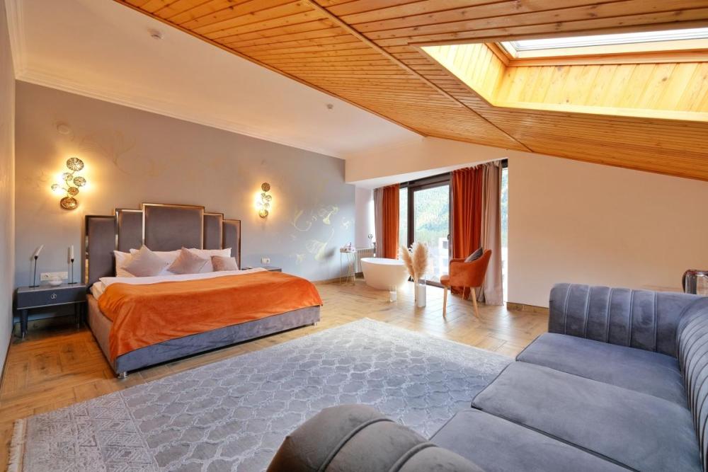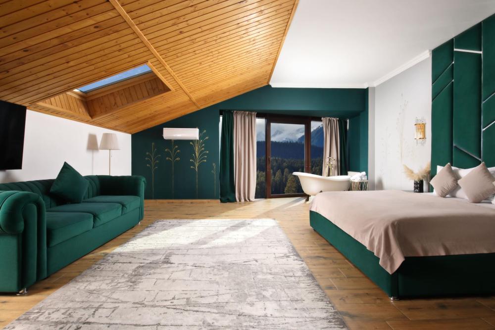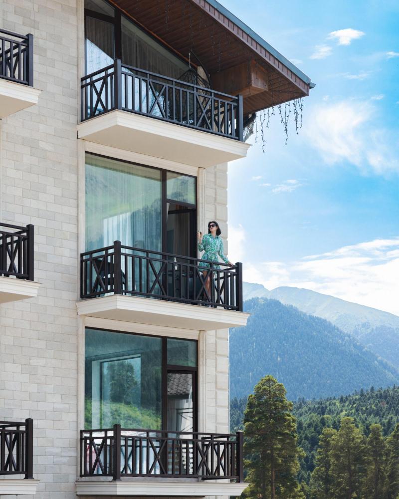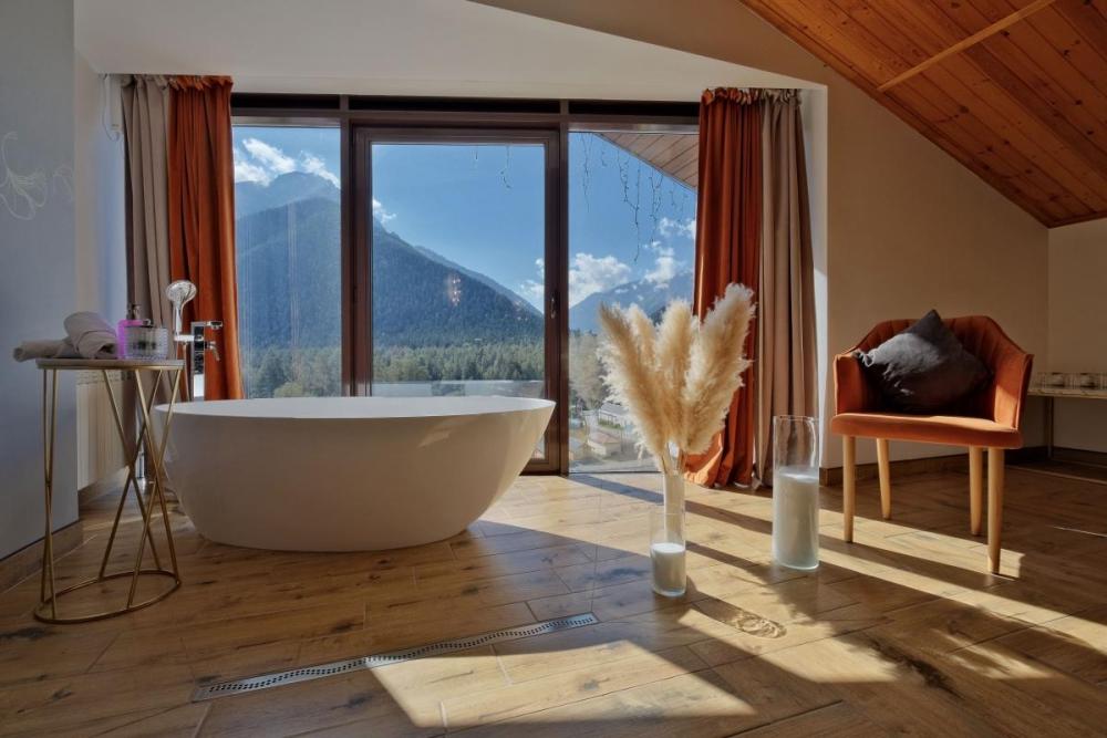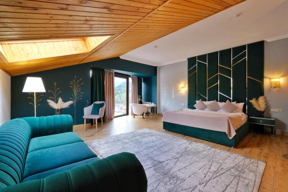 Двухкомнатный номер расположен в основном корпусе на пятом этаже. Номер с ванной у окна в спальне и французским балконом, с красивым видом на горы, также в номере есть двуспальная кровать и раскладной диван. Гостиная с камином, для уютных вечеров. В гостиной также имеется раскладной диван и панорамные окна с красивым видом на горы. Есть возможность установки детской кроватки либо еще одного дополнительного места. В номере есть набор полотенец, халаты, средства личной гигиены (шампунь, гель для душа, жидкое мыло, зубные наборы), тапочки, электрочайник, мини-холодильник, чайный сервиз, телевизор. Уборка номеров ежедневная, смена белья раз в три дня.