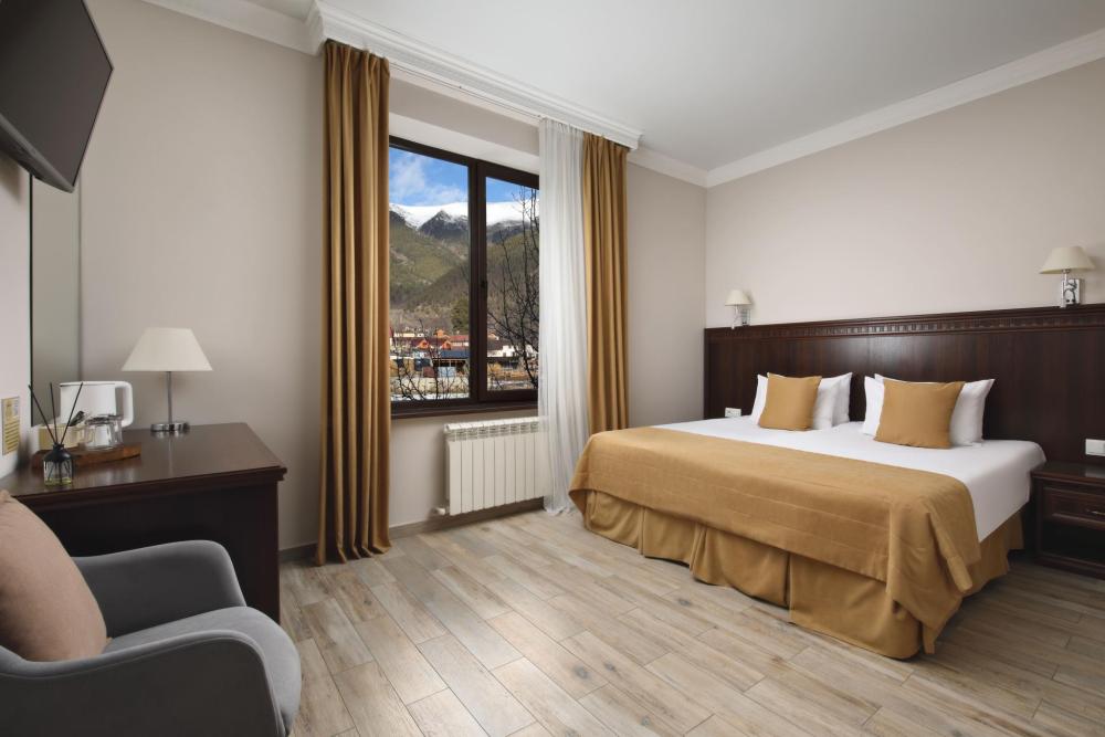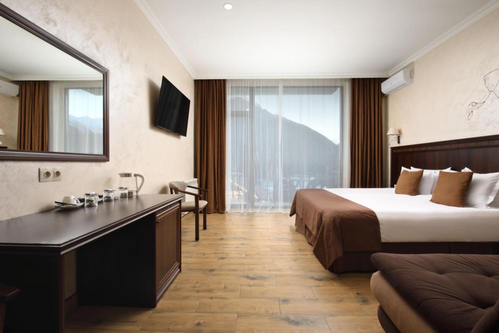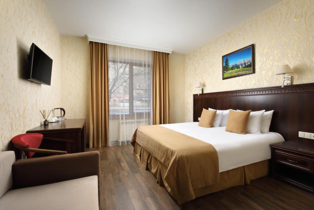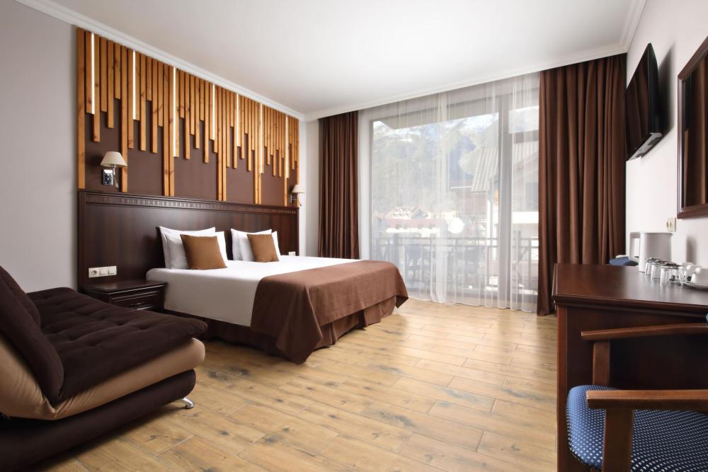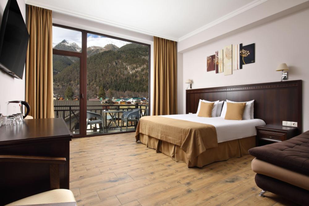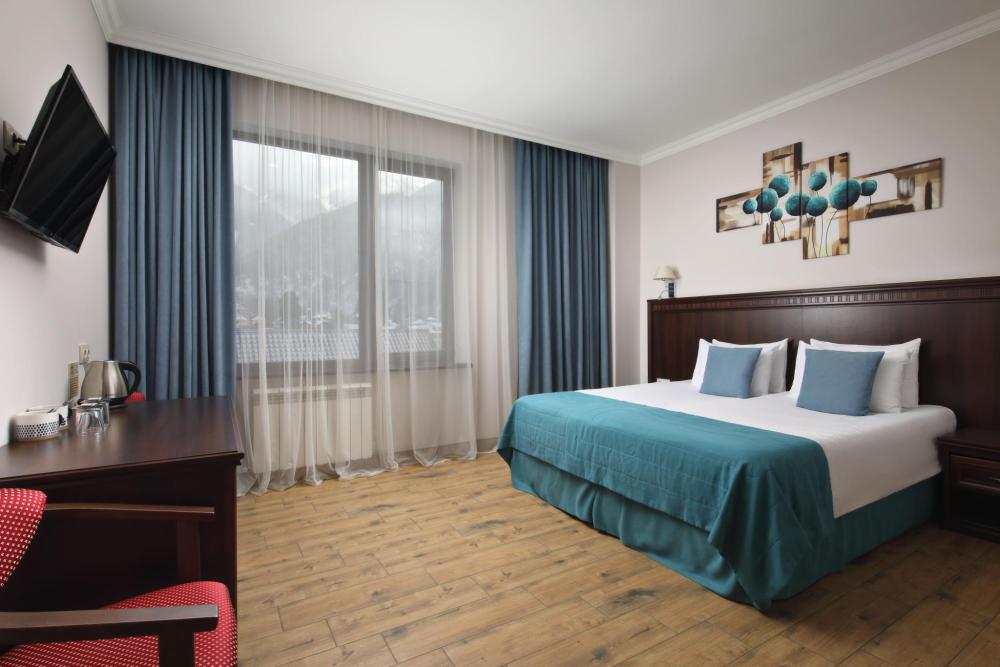 Однокомнатный номер Делюкс расположен в основном корпусе на пятом этаже. Номер с ванной у окна, французским балконом и панорамным окном, с красивым видом на горы. В номере двуспальная кровать и раскладной диван. Есть возможность установки детской кроватки либо еще одного дополнительного места. В номере есть набор полотенец, халаты, средства личной гигиены (шампунь, гель для душа, жидкое мыло, зубные наборы), тапочки, электрочайник, мини-холодильник, чайный сервиз, телевизор. Уборка номеров ежедневная, смена белья раз в три дня.