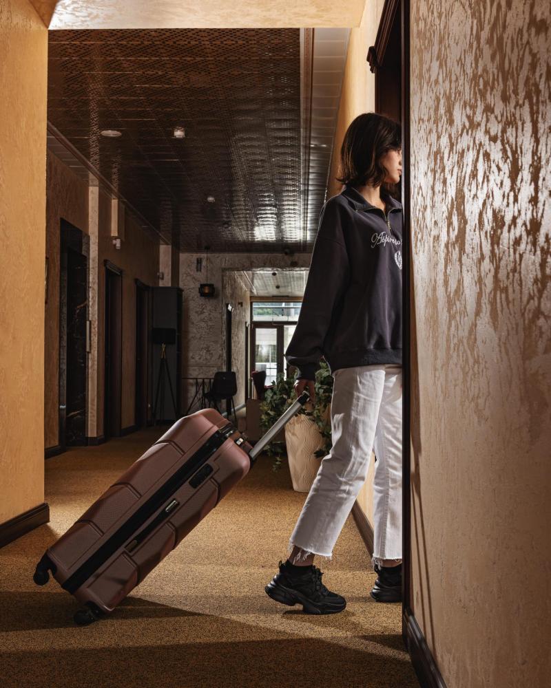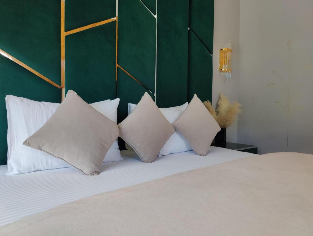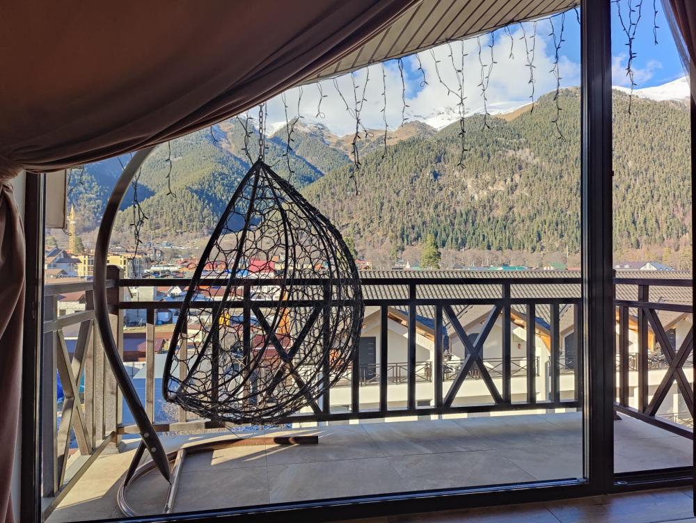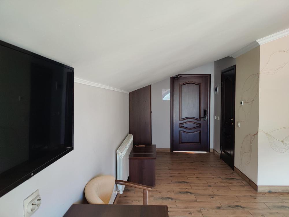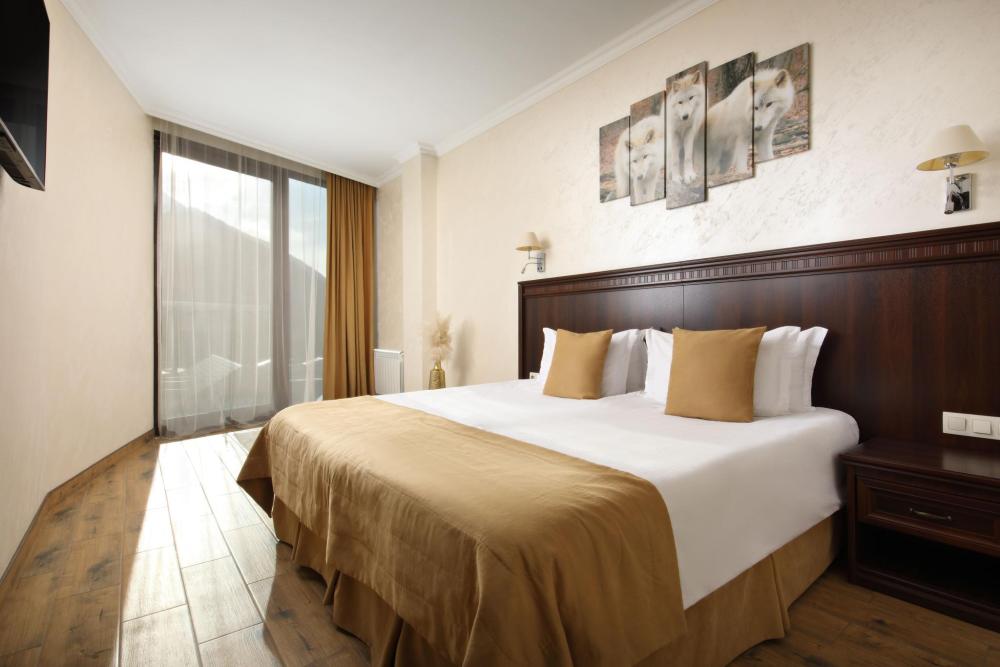 Однокомнатный номер Делюкс расположен в основном корпусе на пятом этаже. Номер с ванной у окна, французским балконом и панорамным окном, с красивым видом на горы. В номере двуспальная кровать и раскладной диван. Есть возможность установки детской кроватки либо еще одного дополнительного места. В номере есть набор полотенец, халаты, средства личной гигиены (шампунь, гель для душа, жидкое мыло, зубные наборы), тапочки, электрочайник, мини-холодильник, чайный сервиз, телевизор. Уборка номеров ежедневная, смена белья раз в три дня.