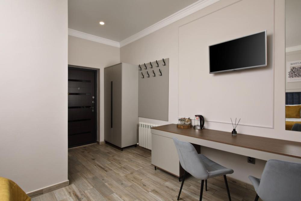 Улучшенный двухместный номер с одной двуспальной или двумя односпальными кроватями. Комфортабельный номер со всеми удобствами. Расположен на 4 этаже. Номер с балконом и панорамным окном. В номерах имеется все, что необходимо для комфортного отдыха: халаты, тапочки, косметика, мини холодильник, чайник, чайные принадлежности, минимальный комплект посуды.
