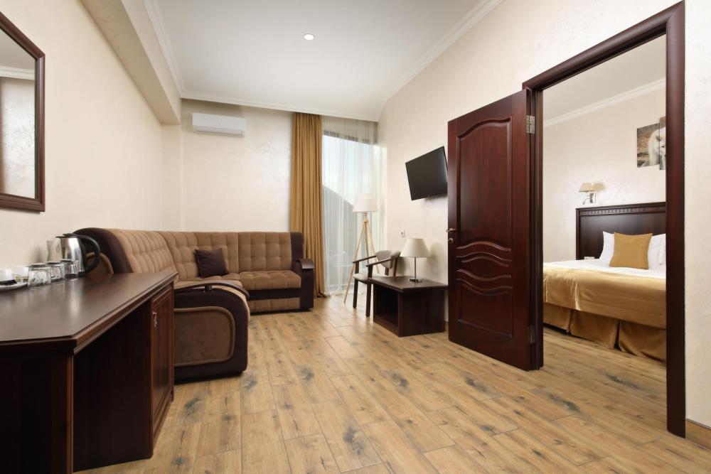 Двухкомнатный номер с двумя смежными комнатами. В одной комнате - гостиная с раскладным диваном, во второй комнате - спальня с одной двуспальной или двумя односпальными кроватями. Комфортабельный номер со всеми удобствами. Расположен на 3, 4 этаже. Номер с панорамным окном. В номерах имеется все, что необходимо для комфортного отдыха: халаты, тапочки, косметика, мини холодильник, чайник, чайные принадлежности, минимальный комплект посуды.