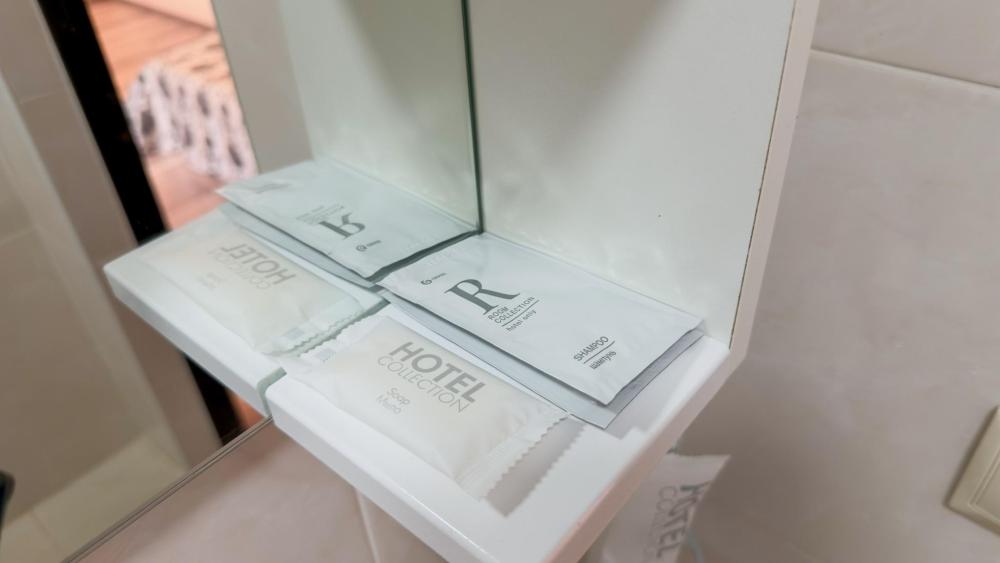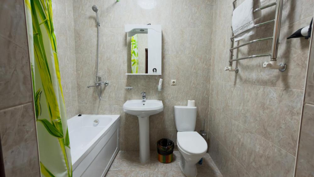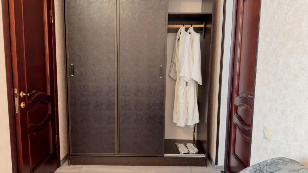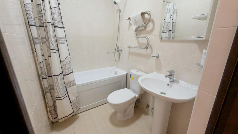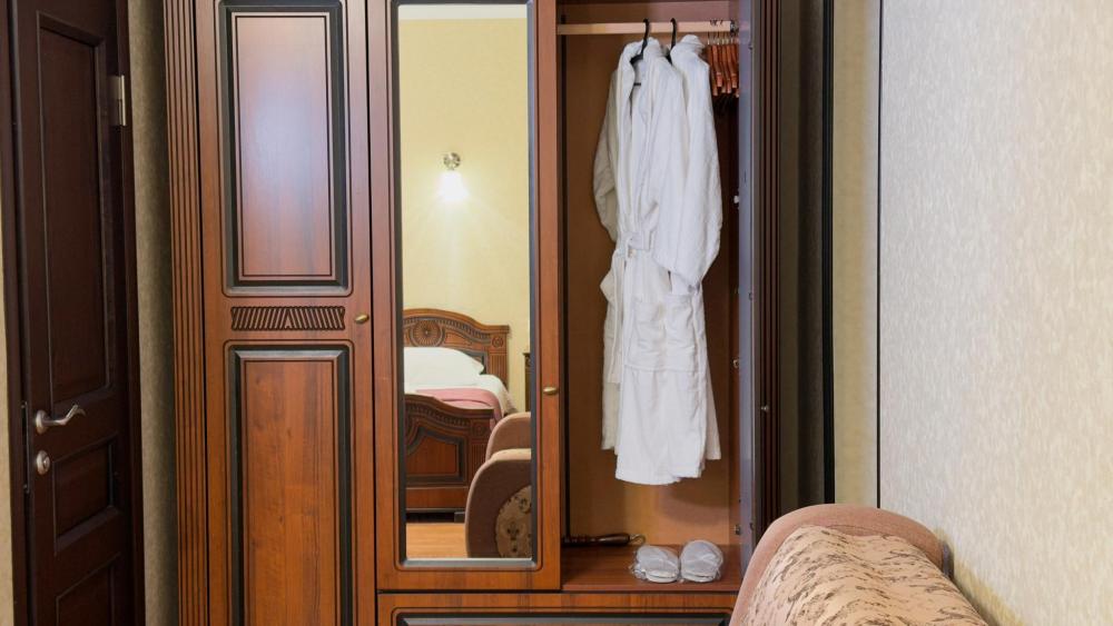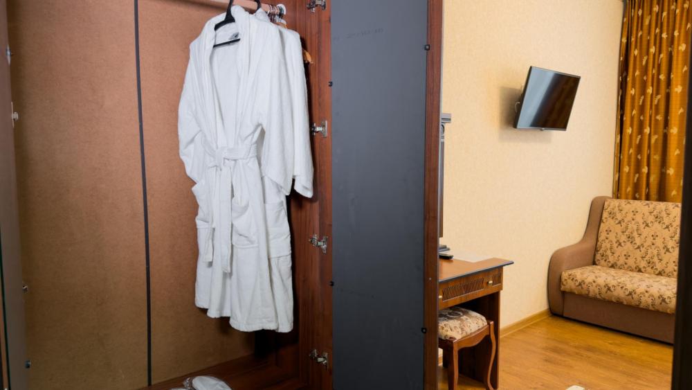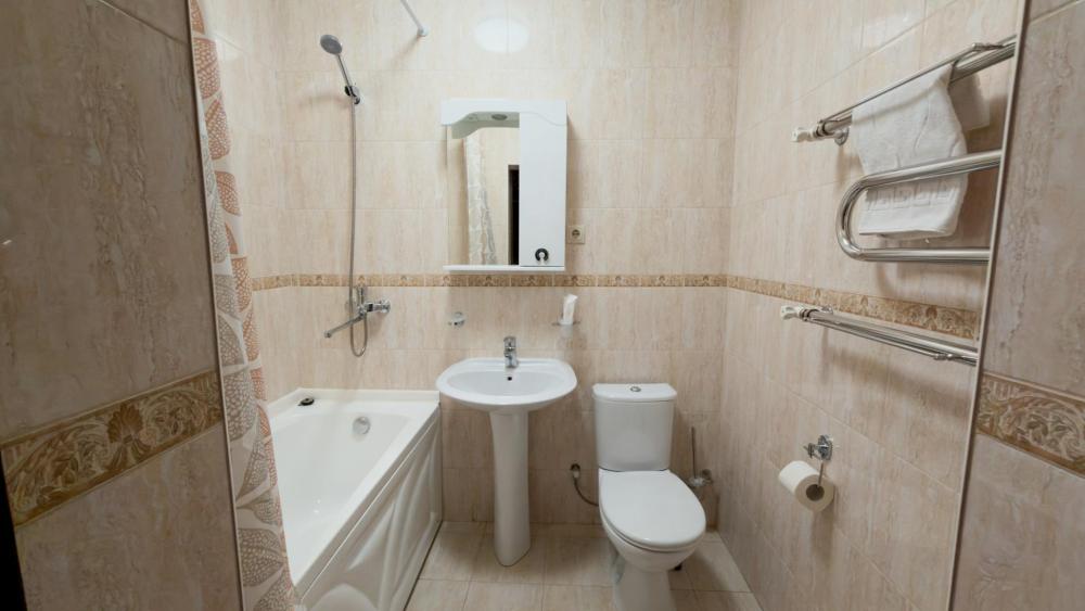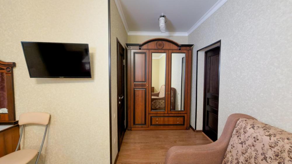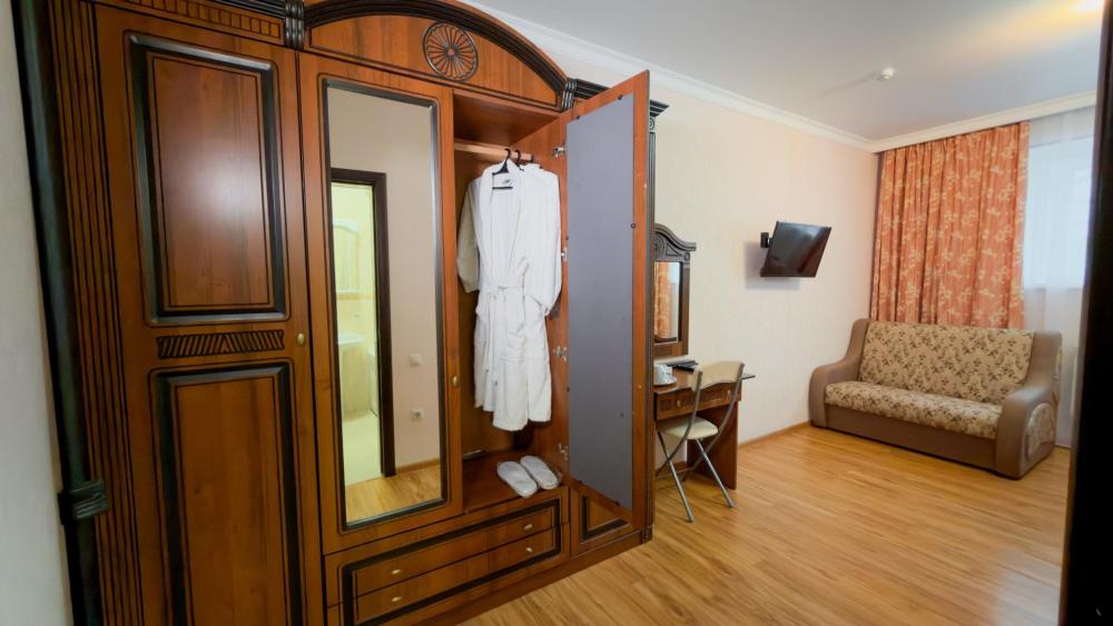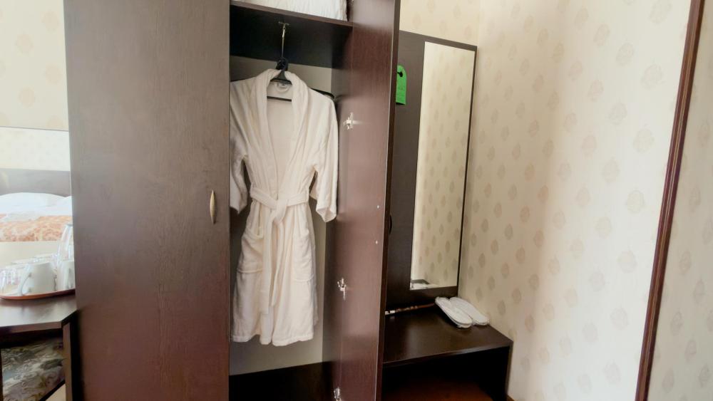 В номере: прикроватные тумбочки, светильники, туалетный столик, стул, телевизор, шкаф для одежды, электрочайник, набор посуды. Санузел: туалет, раковина, ванна, набор полотенец, туалетные и мыльные принадлежности, тапочки.