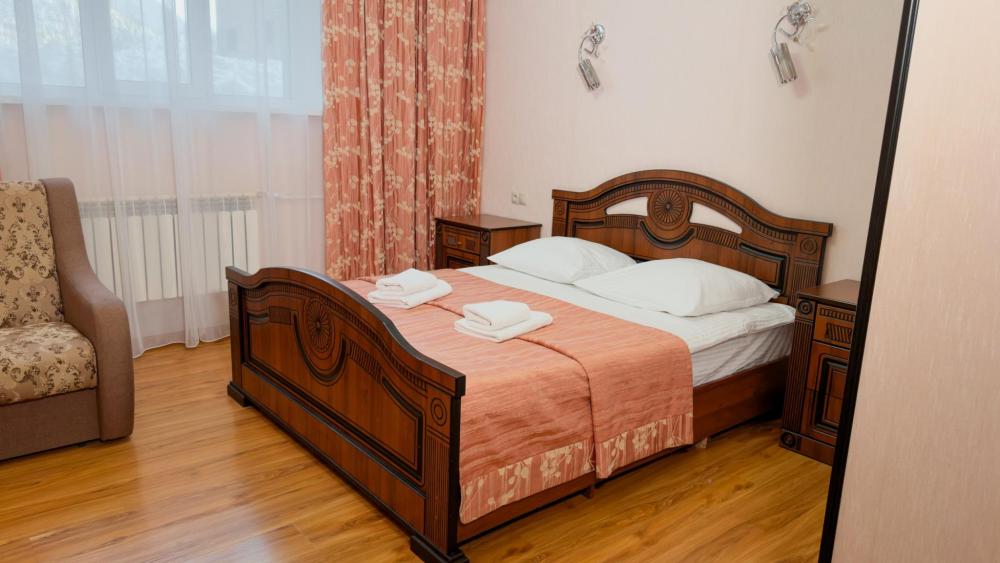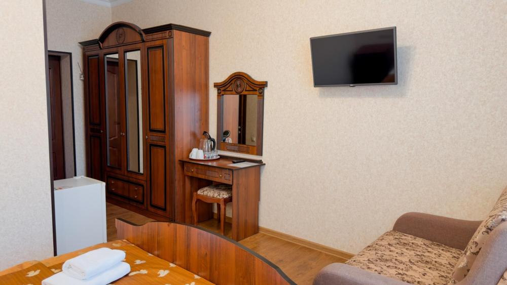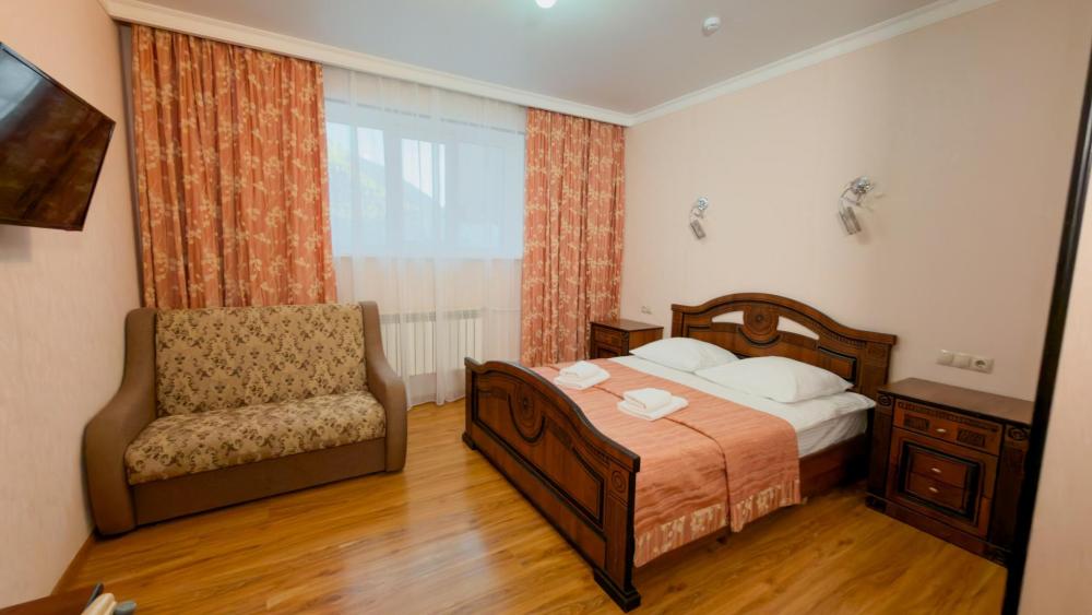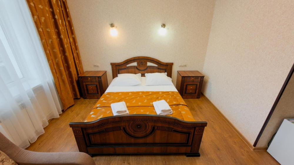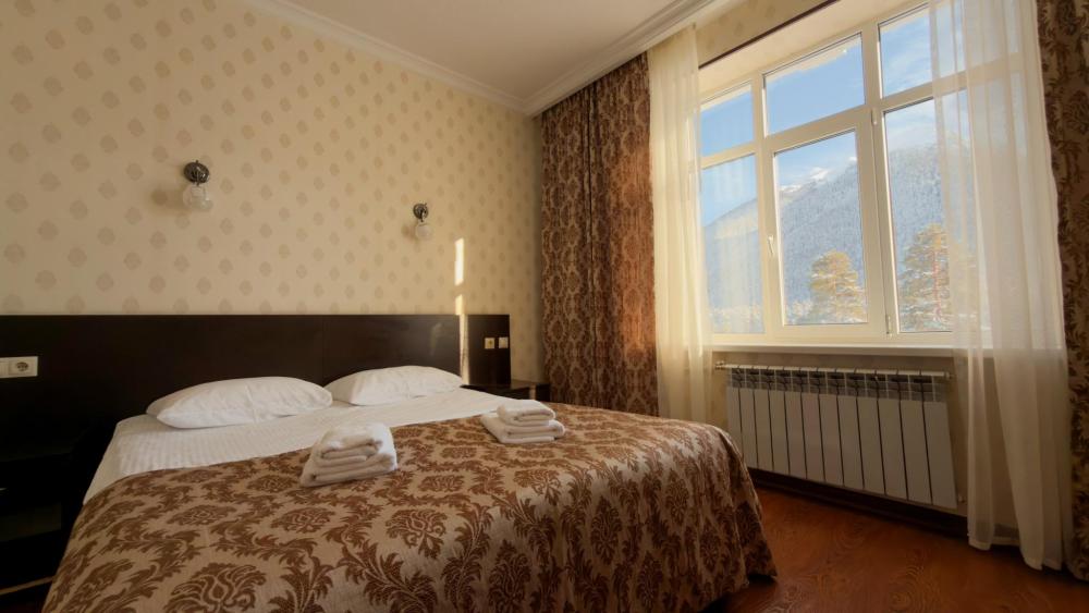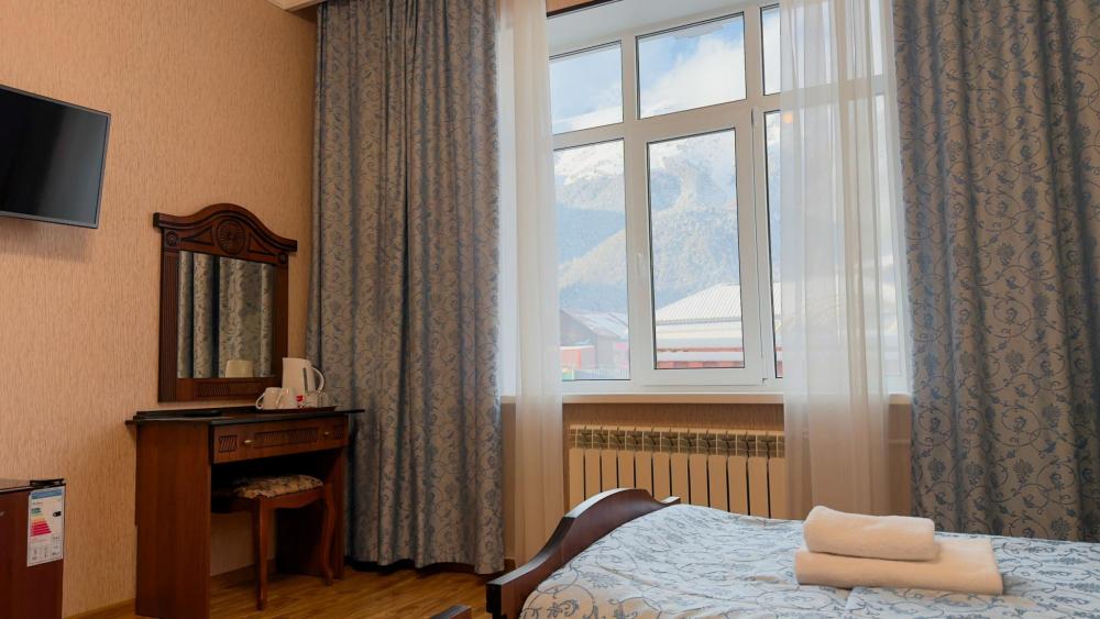 Без вида на цокольном этаже (маленькое окно), на 2-3 этаже вид на горы и поселок. В номере: одна двуспальная кровать, прикроватные тумбочки, светильники, туалетный столик, стул, телевизор, шкаф для одежды, электрочайник, набор посуды. Санузел: туалет, раковина, ванна, набор полотенец, туалетные и мыльные принадлежности, тапочки.