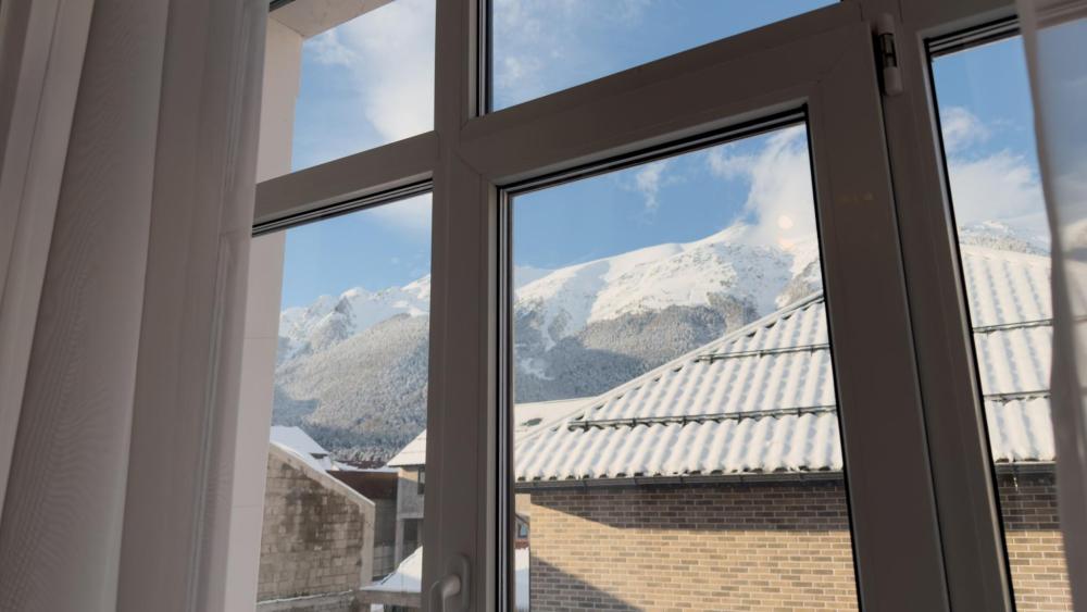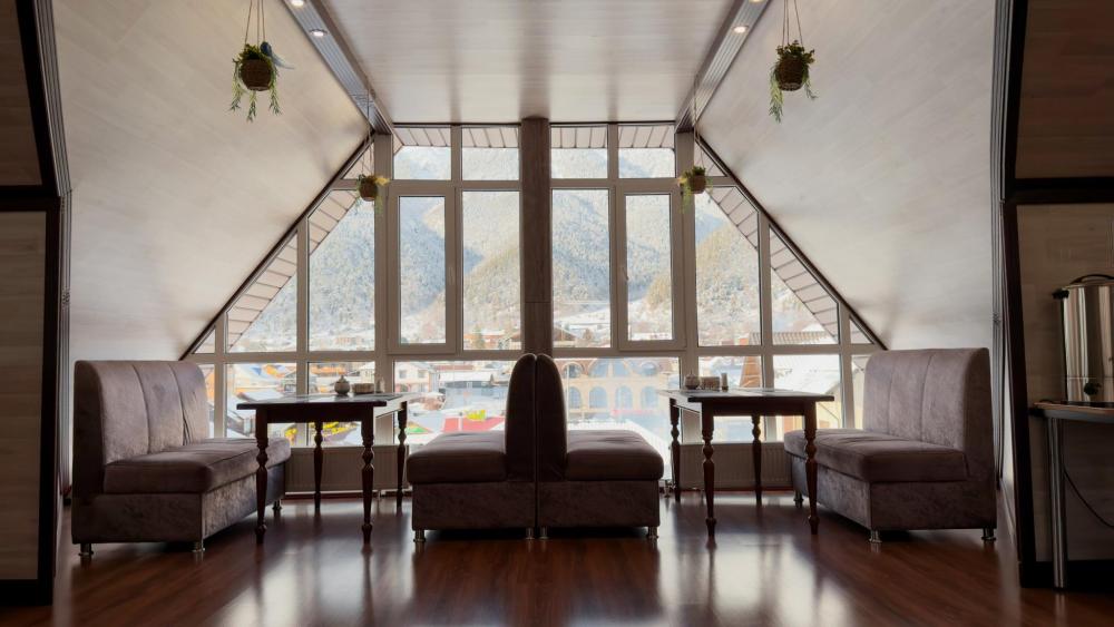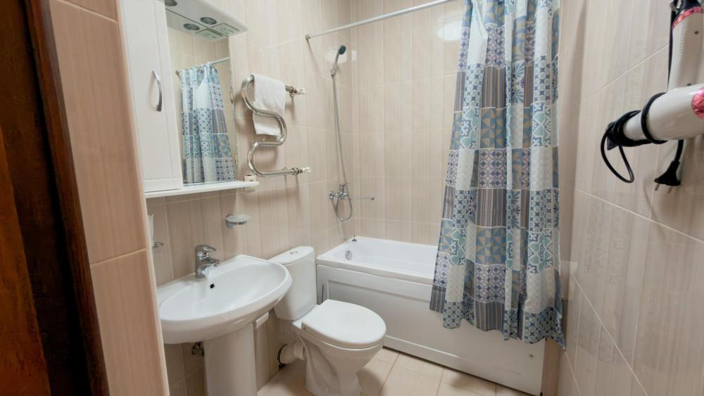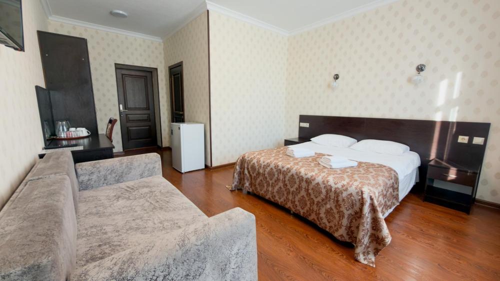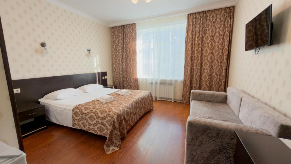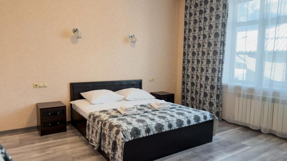 Без вида на цокольном этаже (маленькое окно), на 2-3 этаже вид на горы и поселок. В номере: одна двуспальная кровать, прикроватные тумбочки, светильники, туалетный столик, стул, телевизор, шкаф для одежды, электрочайник, набор посуды. Санузел: туалет, раковина, ванна, набор полотенец, туалетные и мыльные принадлежности, тапочки.