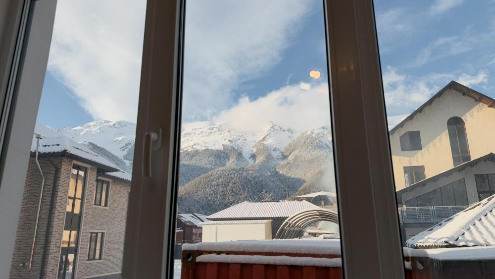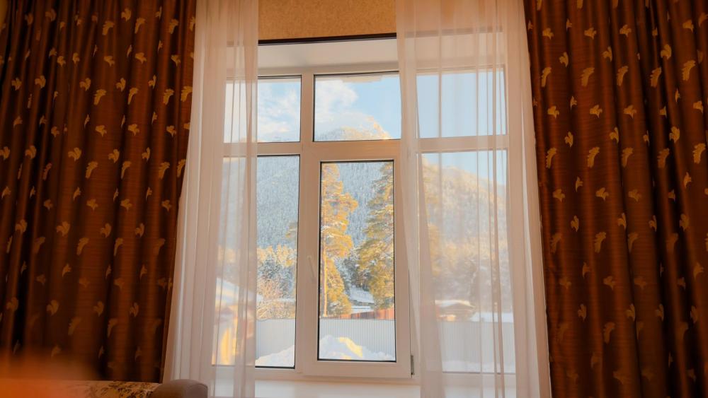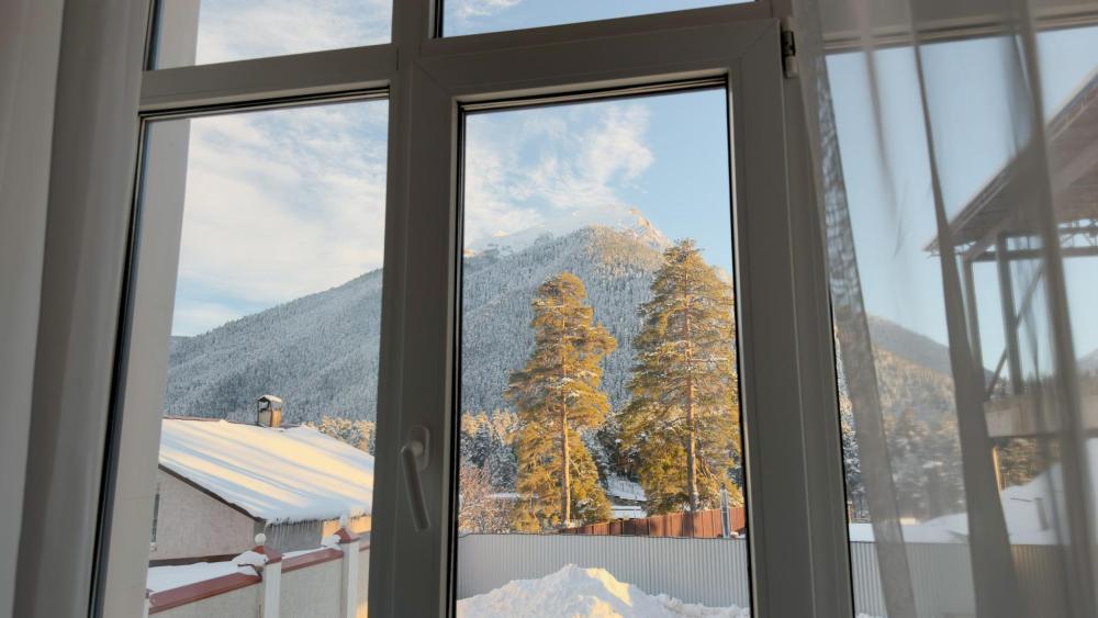 Без вида на цокольном этаже (маленькое окно), на 2-3 этаже вид на горы и поселок. В номере: 2 односпальные кровати, прикроватные тумбочки, светильники, туалетный столик, стул, телевизор, шкаф для одежды, электрочайник, набор посуды. Санузел: туалет, раковина, ванна, набор полотенец, туалетные и мыльные принадлежности, тапочки.