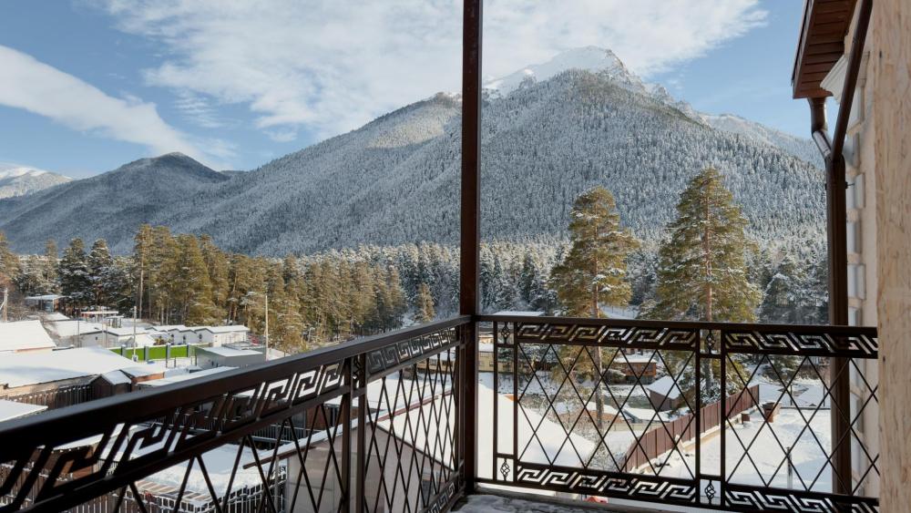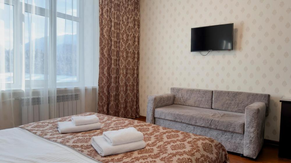 Номера с видом на горы и реку. В номере: двуспальная кровать, прикроватные тумбочки, светильники, туалетный столик, стул, телевизор, шкаф для одежды, электрочайник, набор посуды. Санузел: туалет, раковина, ванна, набор полотенец, туалетные и мыльные принадлежности, тапочки.