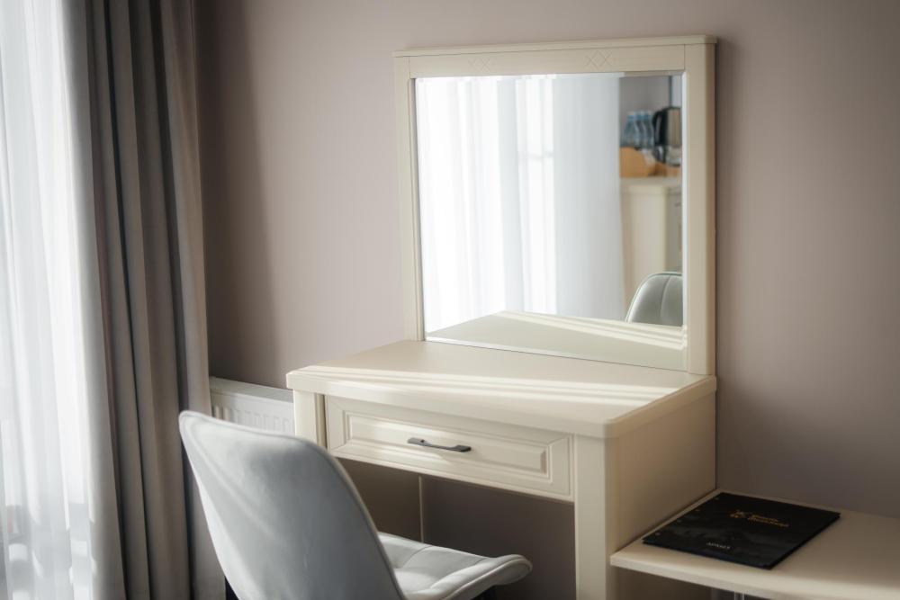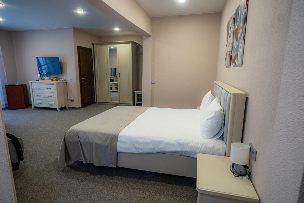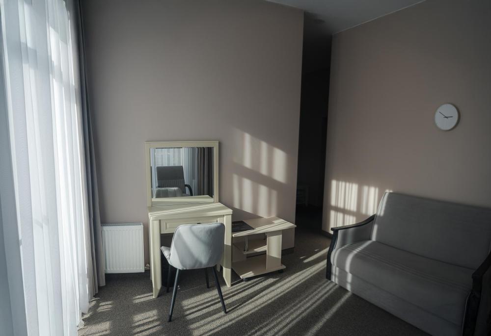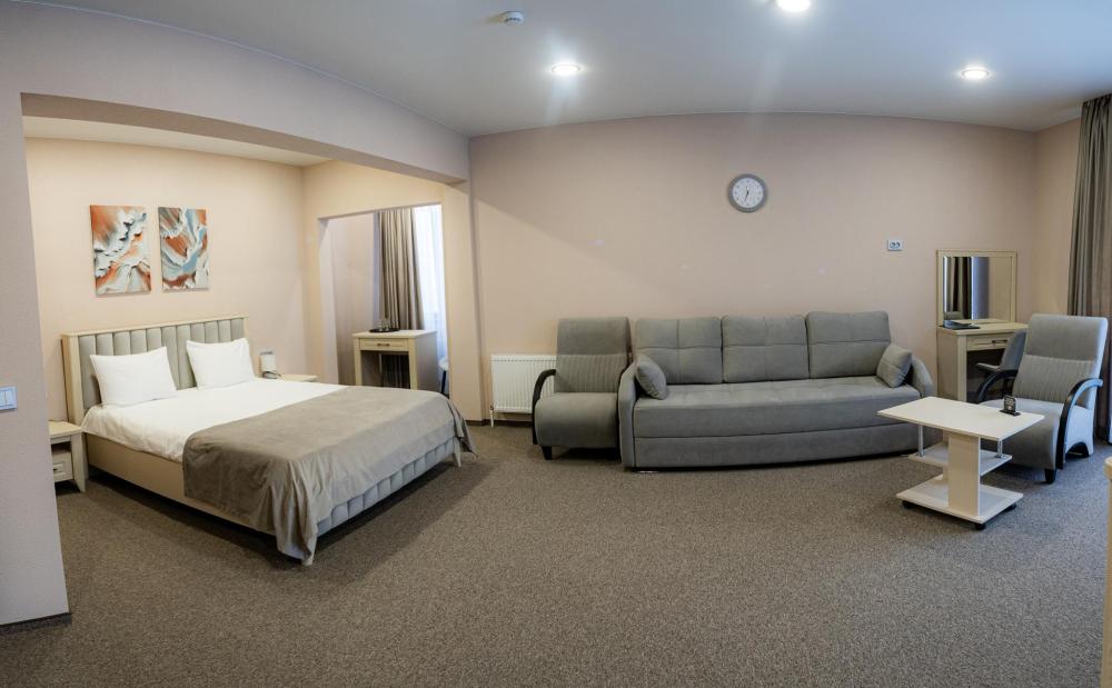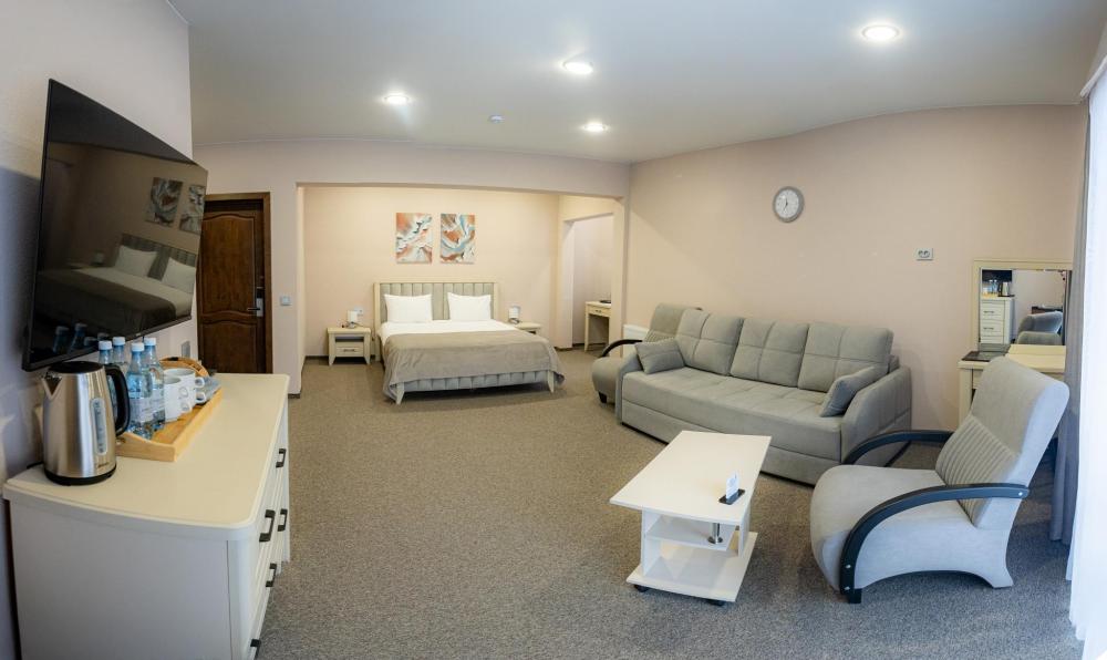 Номер с увеличенной площадью и эксклюзивной мебелью в классическом стиле подойдет для размещения до 4 гостей. Спальные места: двуспальная кровать, раскладной диван. Для комфортного проживания имеются: собственный санузел, телевизор Smart TV, проводной Wi-Fi, улучшенная мягкая мебель, сейф, фен, набор для гостей. Постельное белье, полотенца и ванные принадлежности предоставляются. Есть собственный балкон с видом на горы.