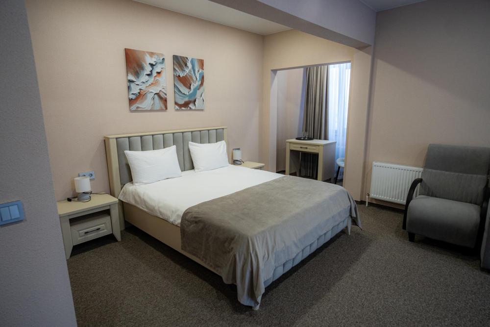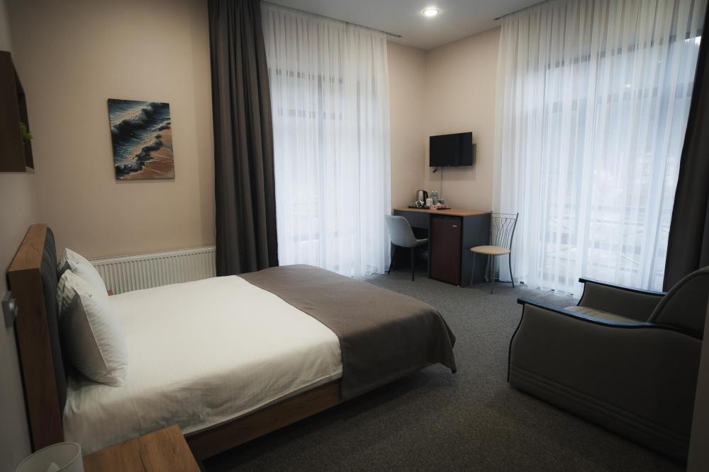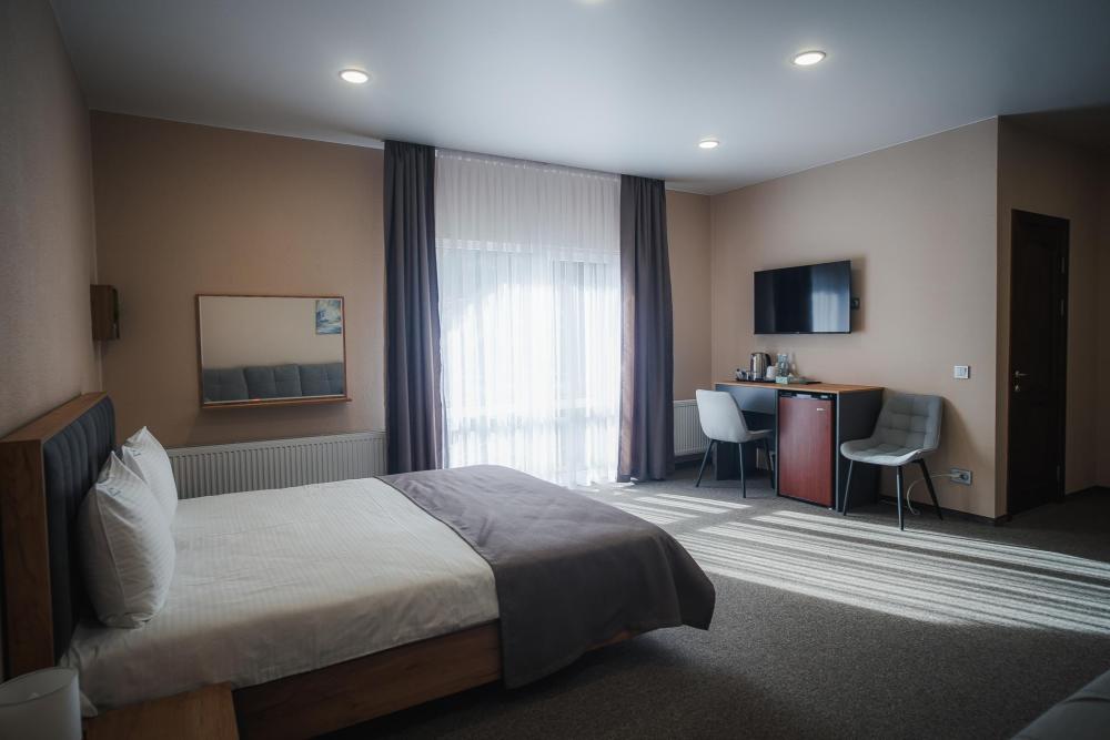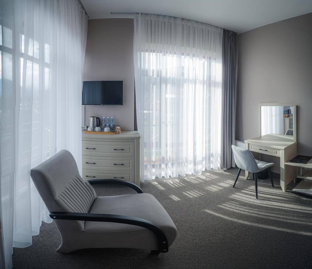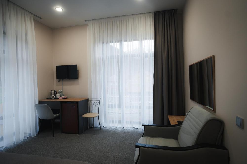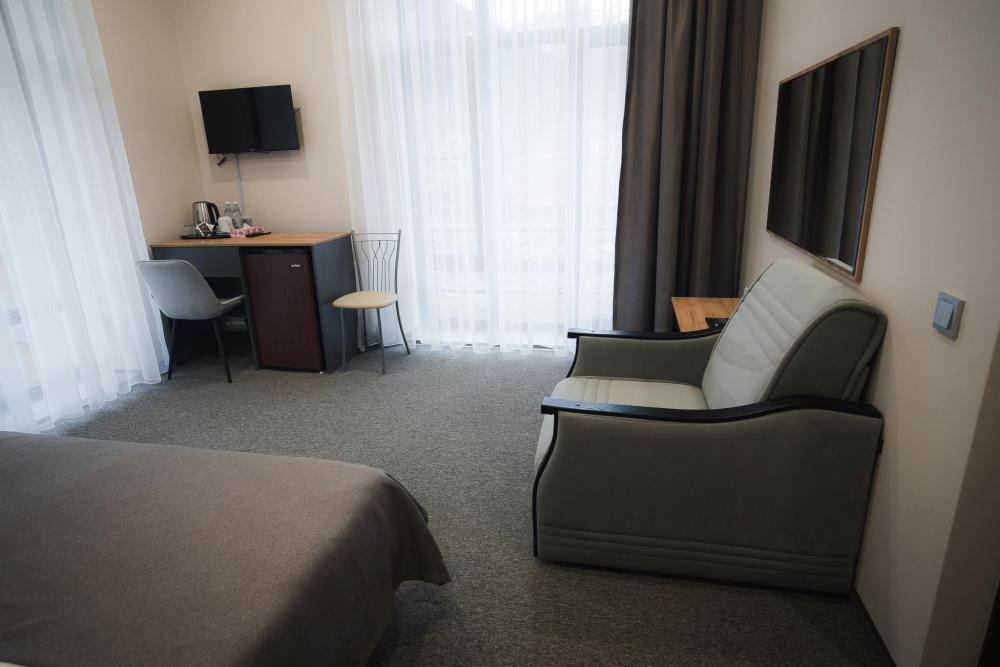 Номер подойдет для размещения до 3 гостей. Спальные места: двуспальная кровать, раскладное кресло-кровать в качестве дополнительного места. Для комфортного проживания имеются: собственный санузел, телевизор Smart TV, проводной Wi-Fi, улучшенная мягкая мебель, сейф, фен, набор для гостей. Постельное белье, полотенца и ванные принадлежности предоставляются. Есть собственный балкон с видом на горы.