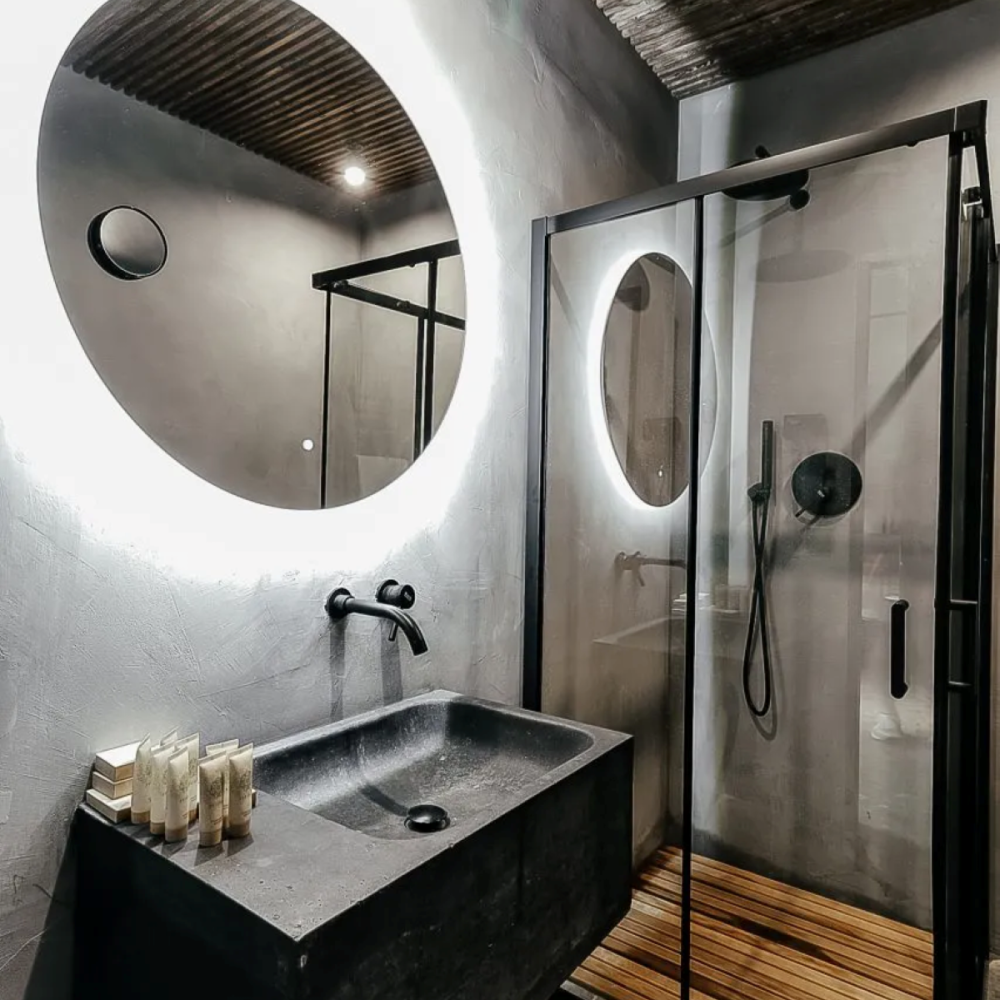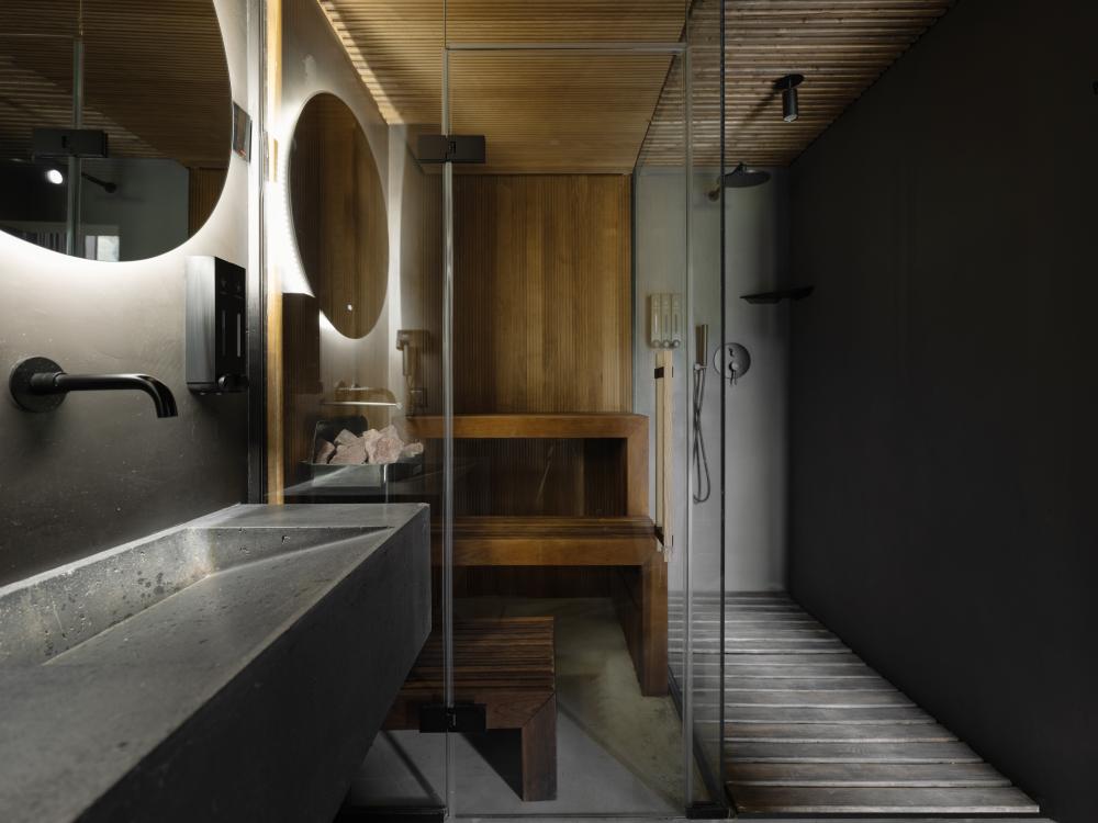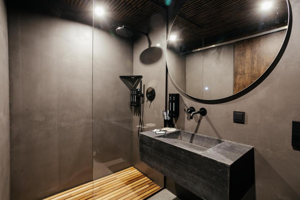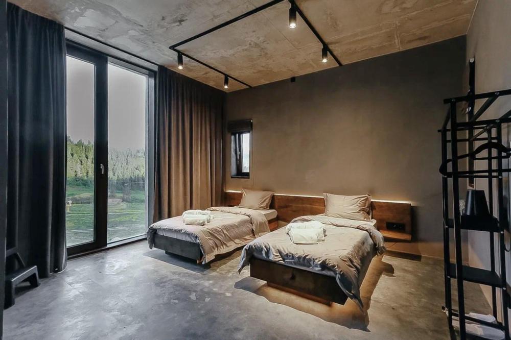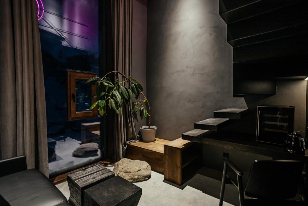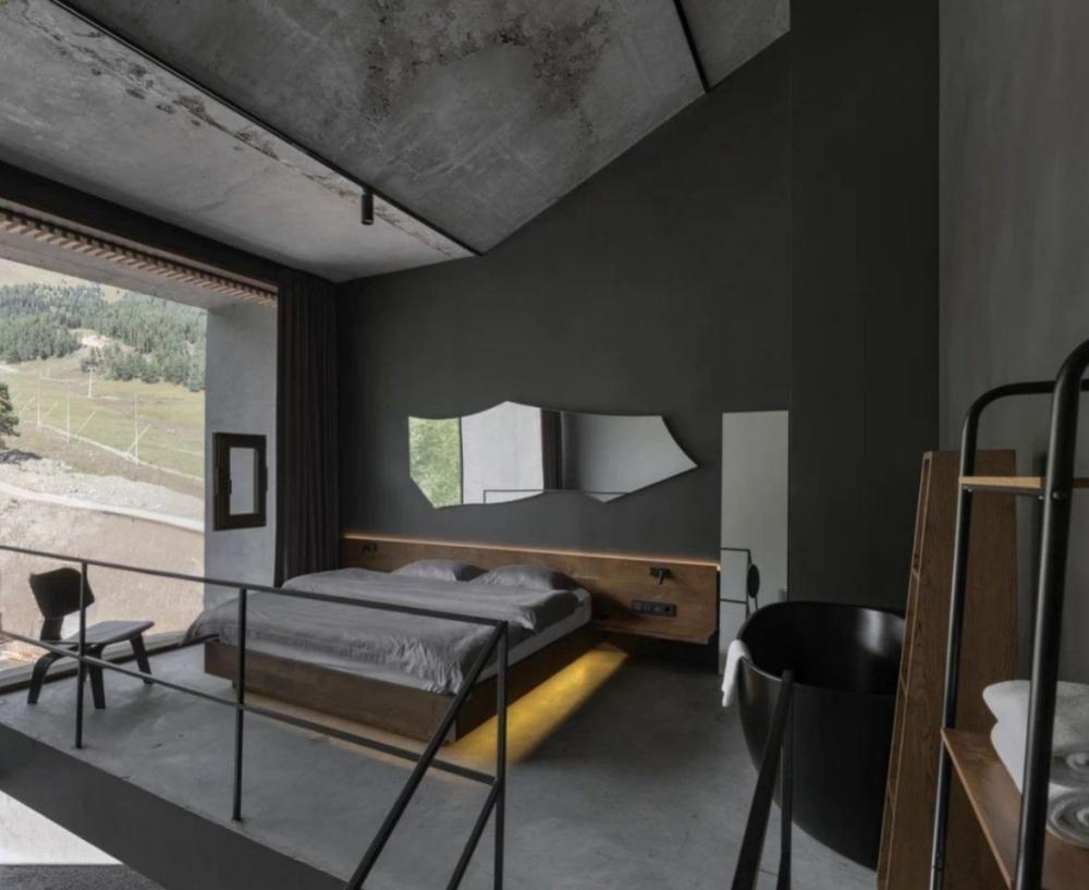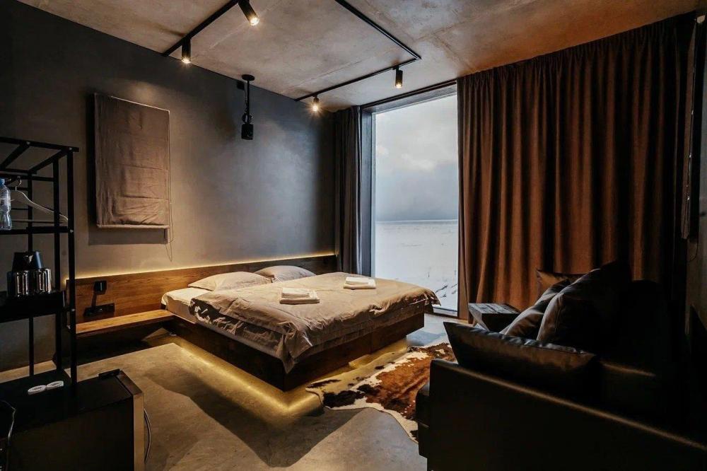 Двухуровневый люкс "Меркурий" предлагает гостям 2 комнаты и просторную гостиную с панорамным остеклением. Высота потолков до 9 метров. В номере есть собственная терраса с джакузи на улице.