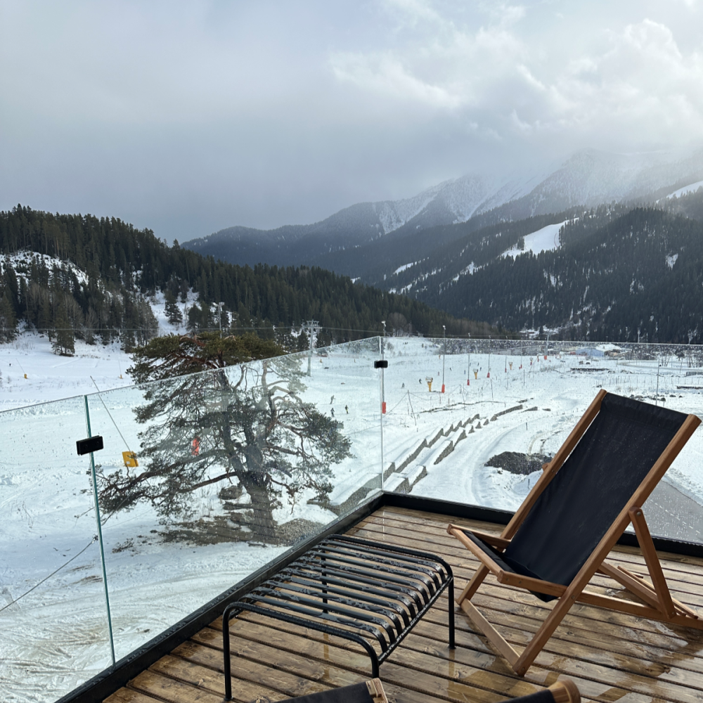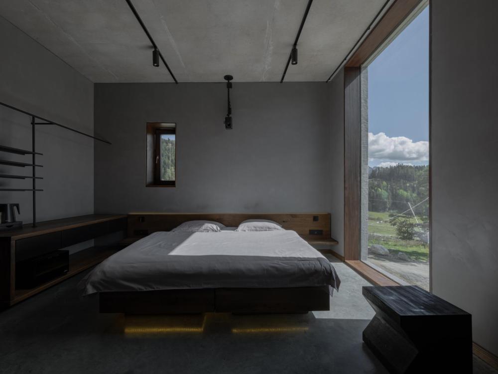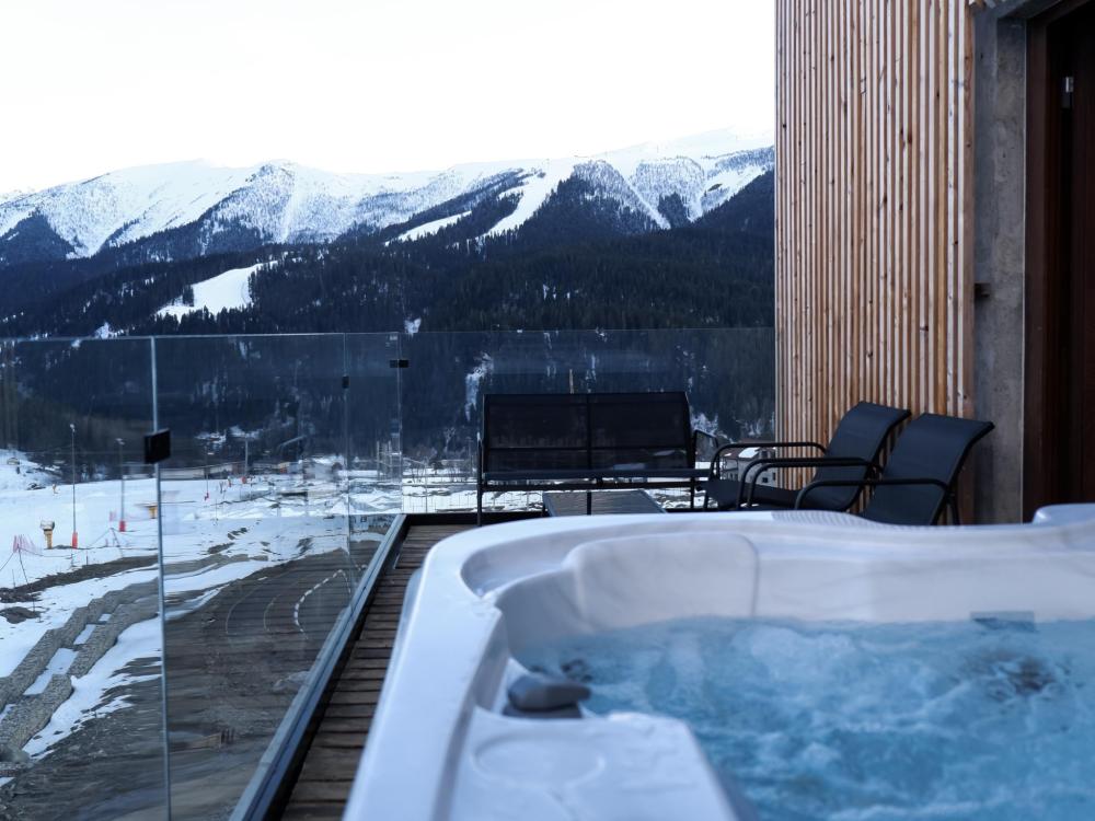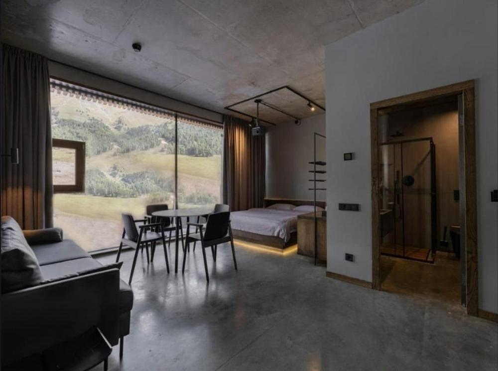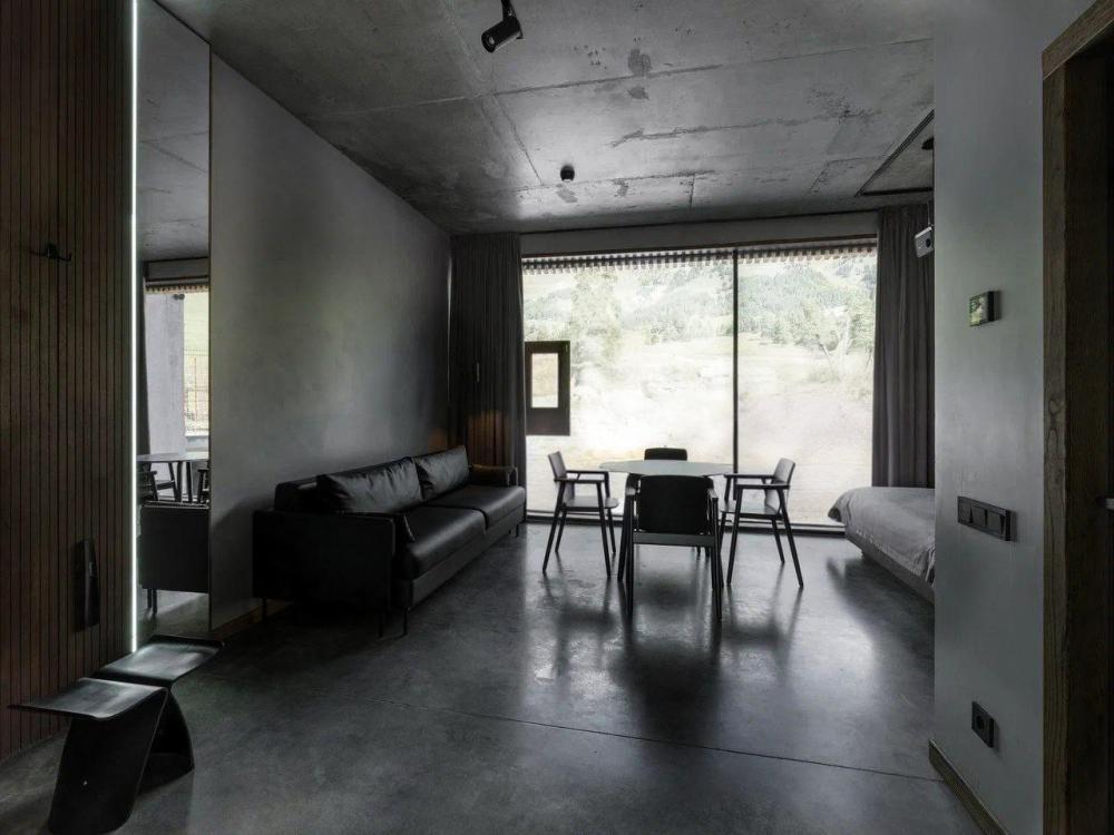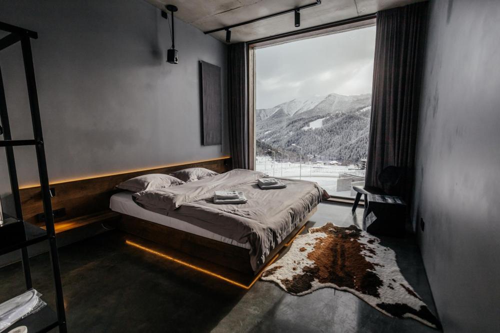Двухуровневый люкс "Каллисто" предлагает гостям 2 комнаты и гостиную с панорамным остеклением и видом на горы. В номере есть собственная терраса с джакузи на улице и панорамными окнами.