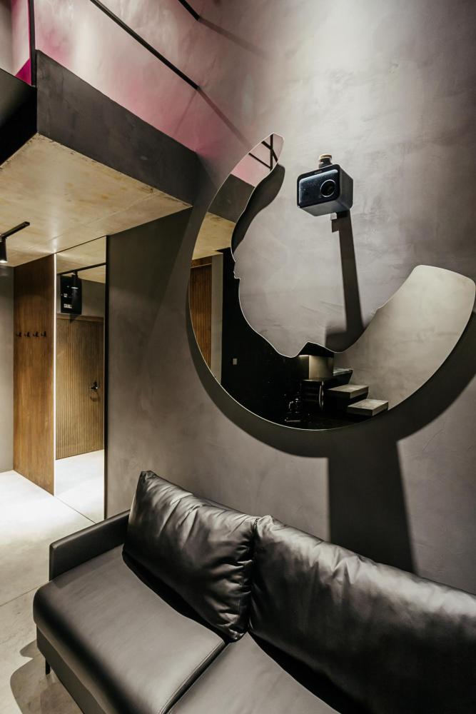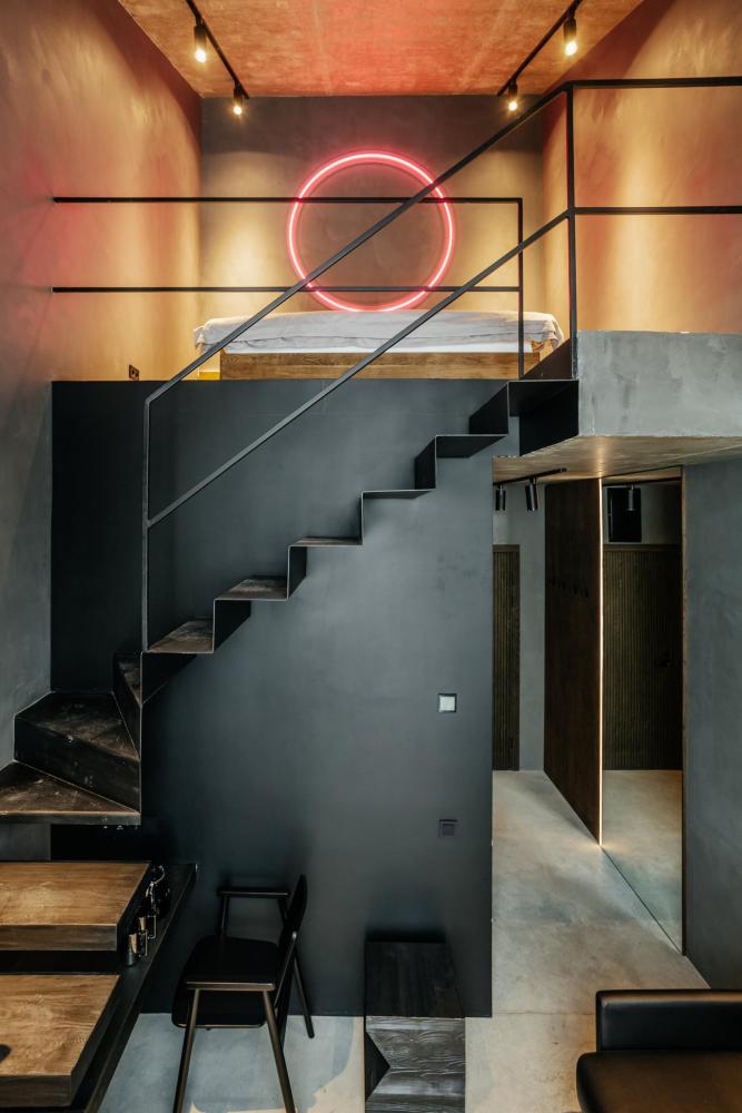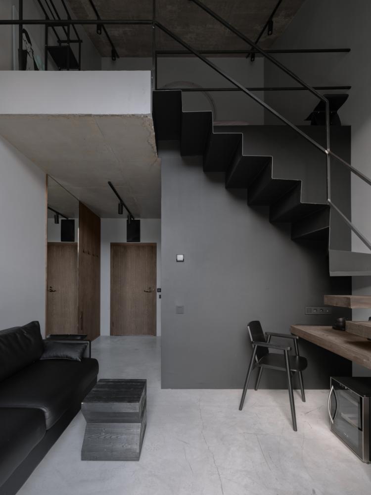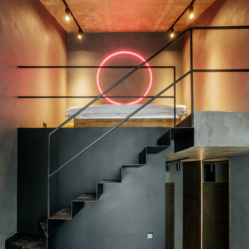 Двухуровневый номер, на первом этаже раскладной диван, на втором - двуспальная кровать.