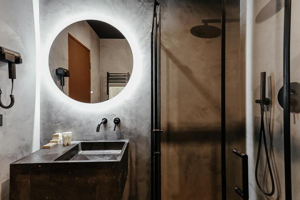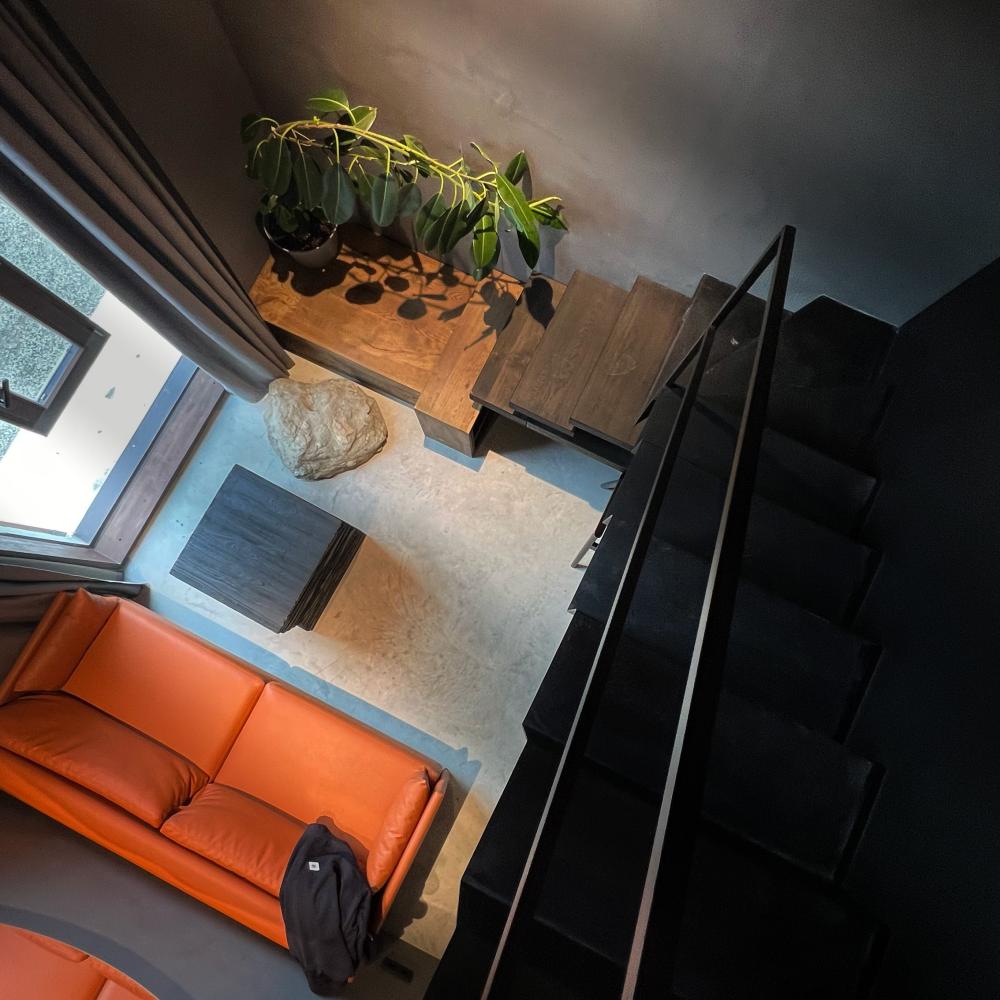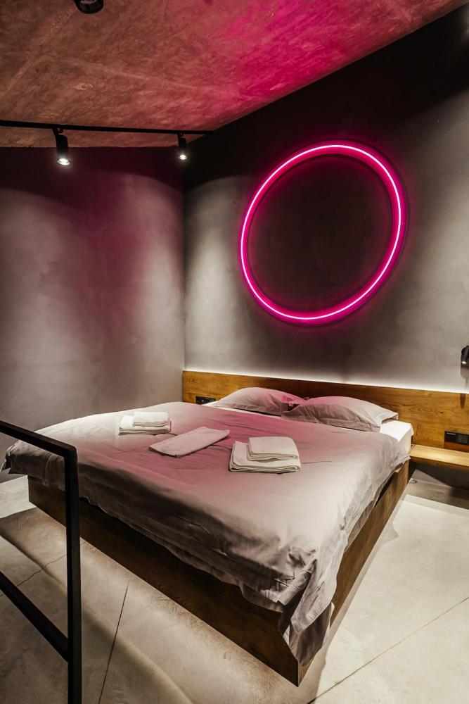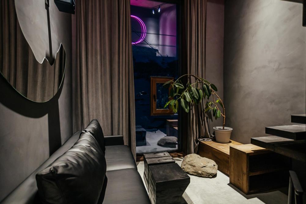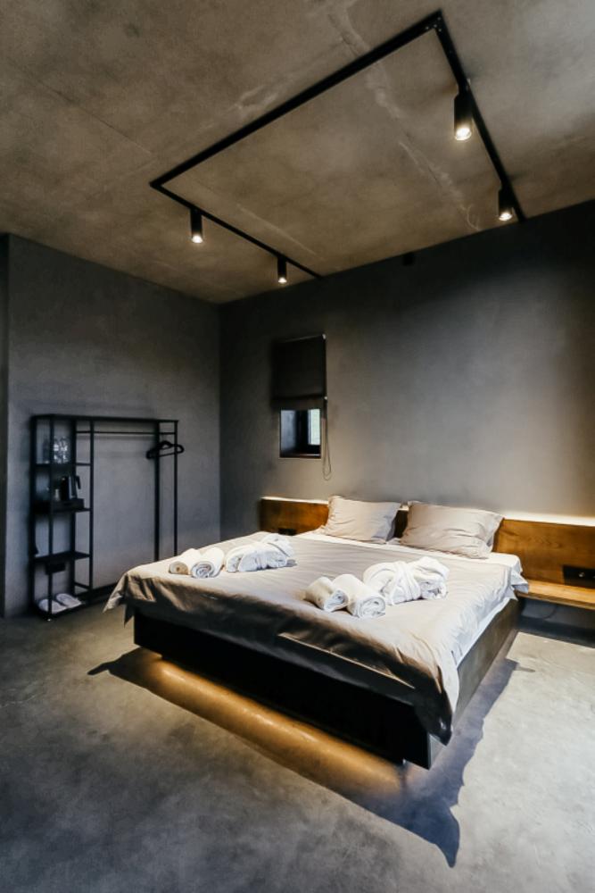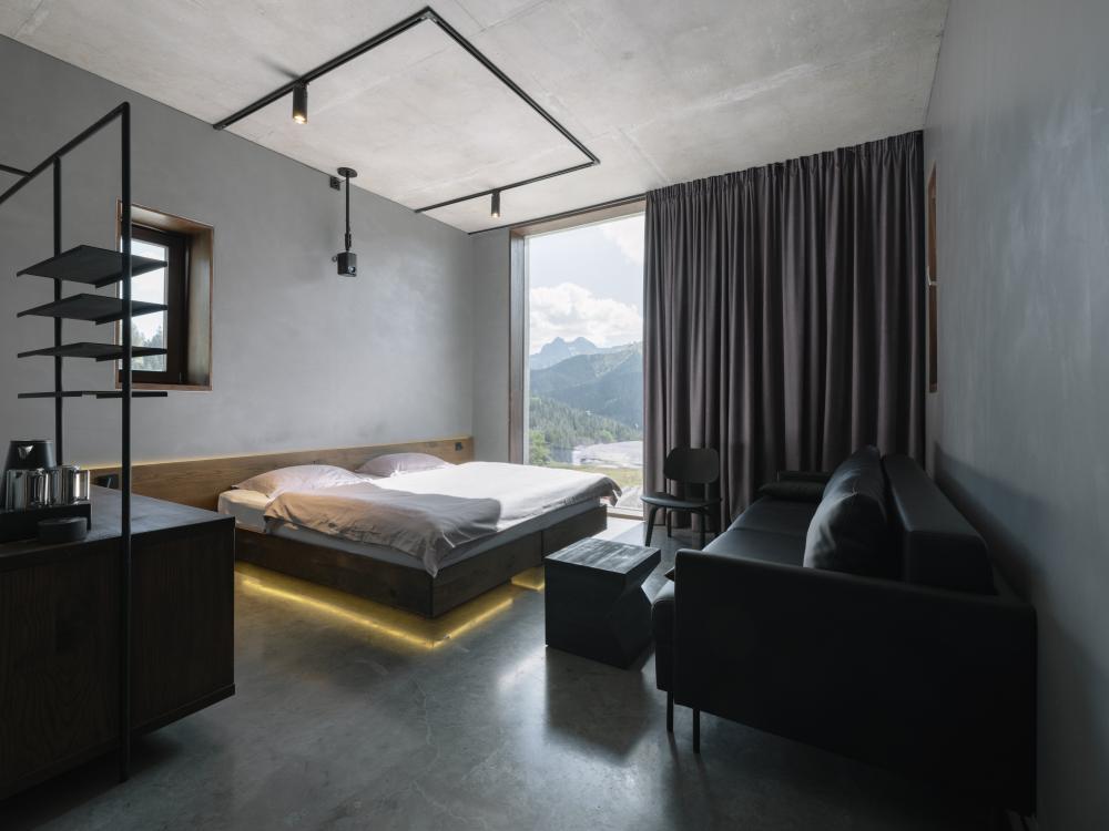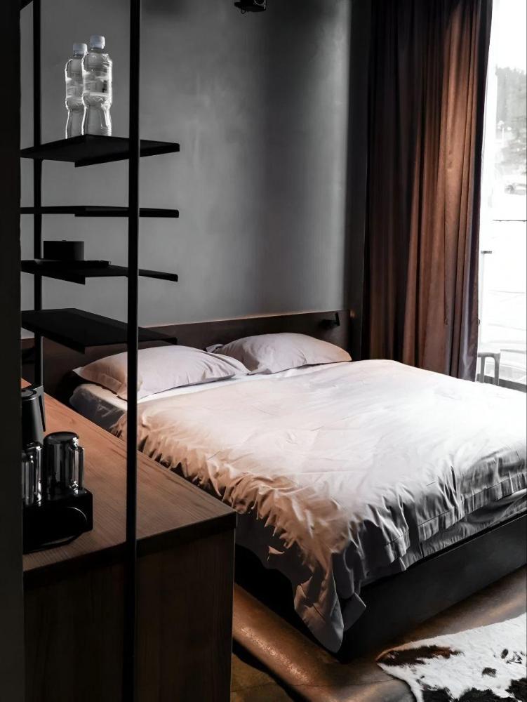Двухуровневый люкс "Ио" предлагает гостям просторную гостиную с панорамным, а также спальную комнату на 2м уровне.