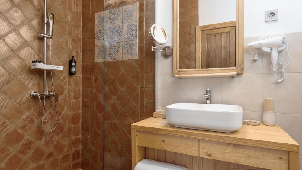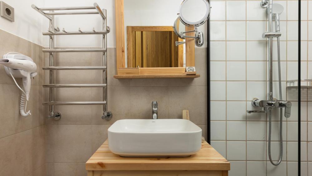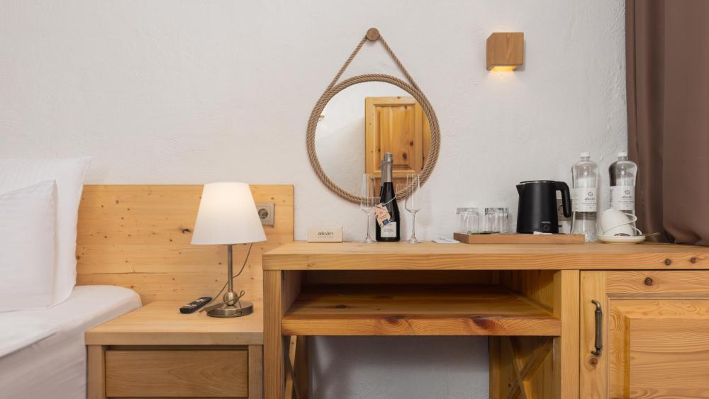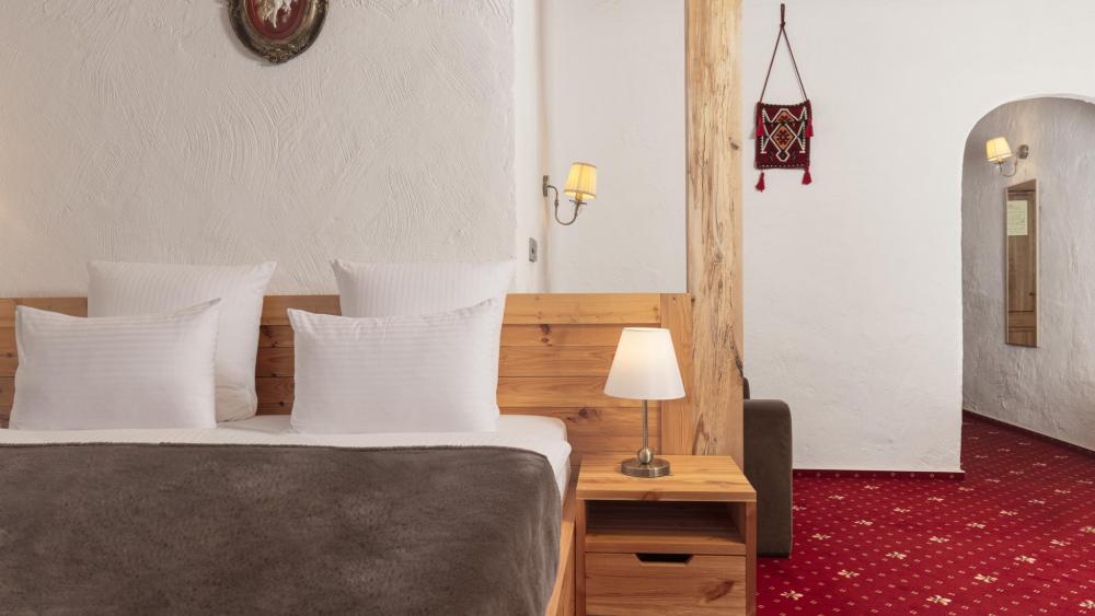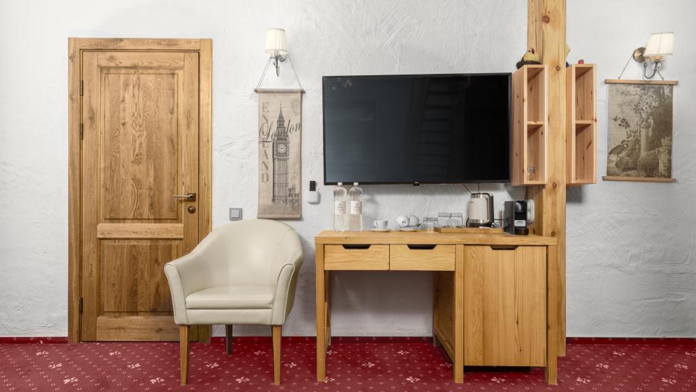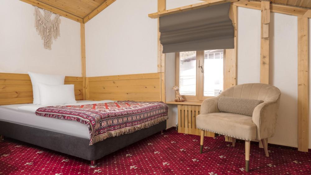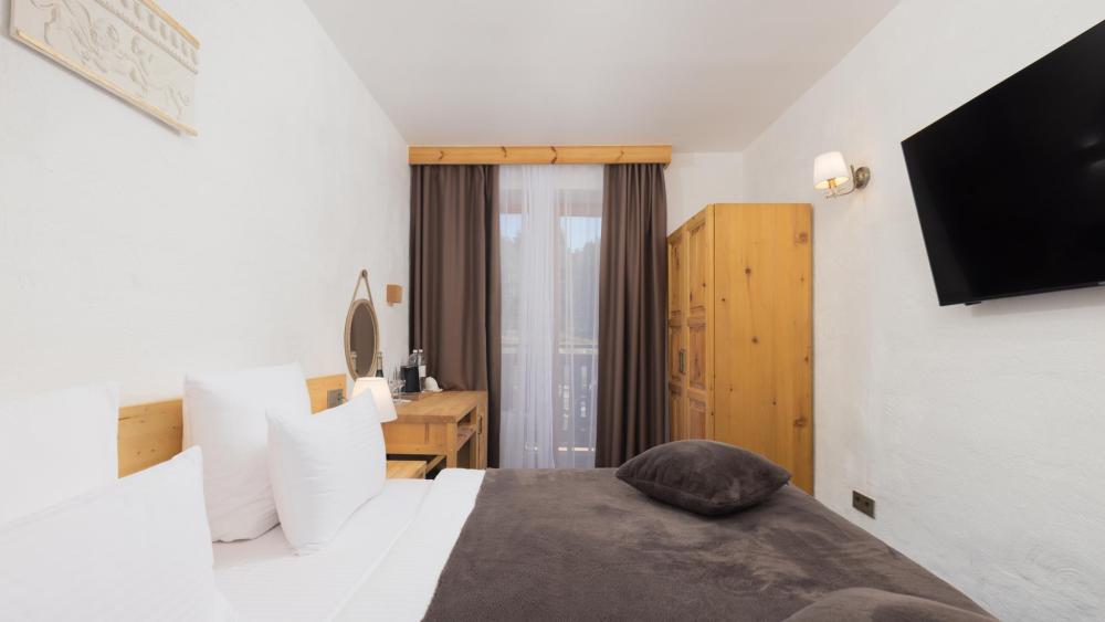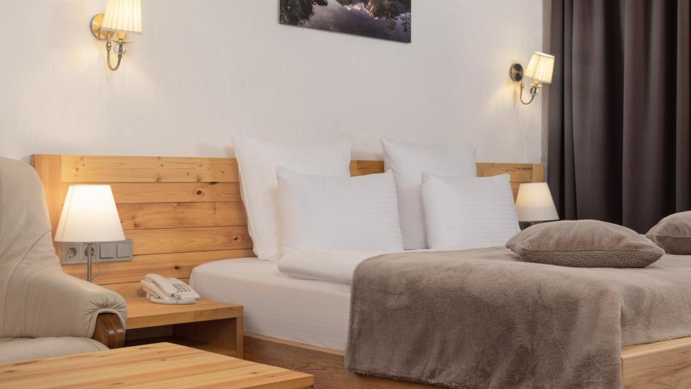 Улучшенный стандартный номер с двуспальной кроватью и раскладным креслом общей площадью 27 кв.м. для размещения до 2-х гостей. Оснащение номера: двуспальная кровать king-size с ортопедическим матрасом, раскладное кресло (допускается размещение ребенка до 14 лет), письменный стол и шкаф для одежды из натуральной сосны, телевизор, деревянные окна в пол из финской сосны, дубовые двери весом 90 кг и толщиной полотна 6 см обеспечивают максимальную шумоизоляцию, балкон с красивым видом, ванная комната с душем. Номера данной категории расположены со 2 по 5 этаж. На 5 этаже деревянные потолки.