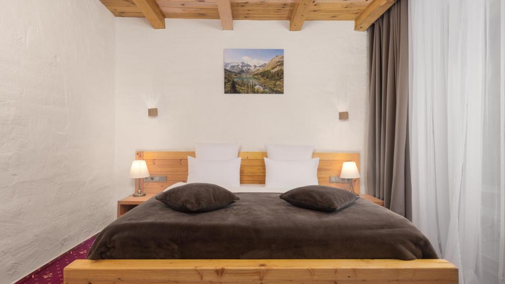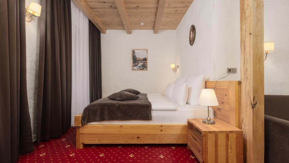 Номер де-люкс с двуспальной и полутораспальной кроватями. Оснащение номера: Просторная гардеробная комната Двуспальная кровать king size с ортопедическим матрасом Полутораспальная кровать с ортопедическим матрасом Межкомнатная перегородка из бруса сосны и доски хвои обработанные экологически чистым маслом Тяжелая и массивная мебель из натуральной сосны Деревянные окна в пол из финской сосны Дубовые двери весом 90 кг и толщиной полотна 6 см обеспечивают максимальную шумоизоляцию Балкон с красивым видом на горы Номера категории «Семейный номер» расположены со 2 по 5 этаж. На 5 этаже деревянные потолки.