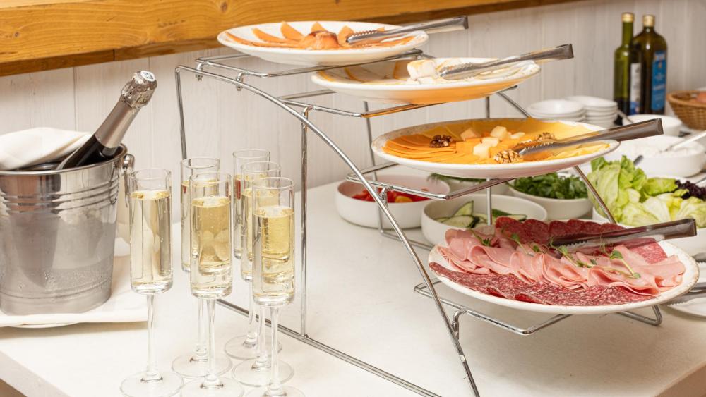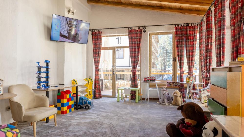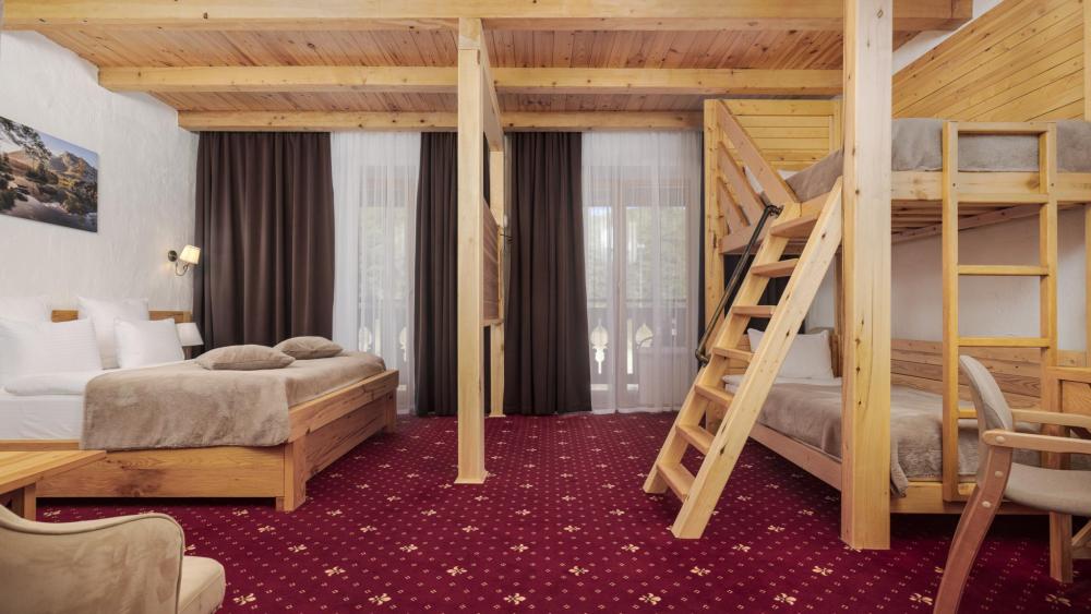 Номер де-люкс с двуспальной и двухъярусной кроватями. Оснащение номера: Просторная гардеробная комната Двуспальная кровать king size с ортопедическим матрасом Двухъярусная кровать ручной работы с ортопедическими матрасами Удобный раскладной диван Межкомнатная перегородка из бруса сосны и доски хвои обработанные экологически чистым маслом Тяжелая и массивная мебель из натуральной сосны Деревянные окна в пол из финской сосны Дубовые двери весом 90 кг и толщиной полотна 6 см обеспечивают максимальную шумоизоляцию Балкон с красивым видом на горы Номера категории «Семейный номер с двухъярусной кроватью» расположены только на 5 этаже.