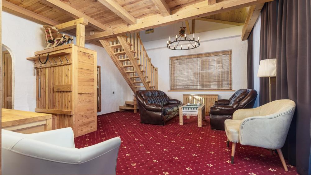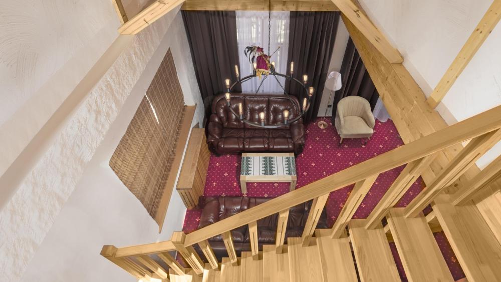 Двухкомнатный люкс с удлиненным балконом. Оснащение номера: Просторная гардеробная комната Двуспальная кровать king-size с ортопедическим матрасом Двухъярусная кровать ручной работы Письменный стол и шкаф для одежды из натуральной сосны Два телевизора Кожаные диваны и журнальный столик Деревянные окна в пол из финской сосны Дубовые двери весом 90 кг и толщиной полотна 6 см обеспечивают максимальную шумоизоляцию Балкон с красивым видом Номера категории «Люкс» расположены со 2 по 4 этаж.