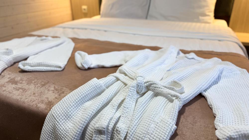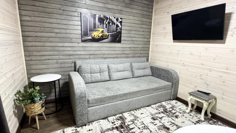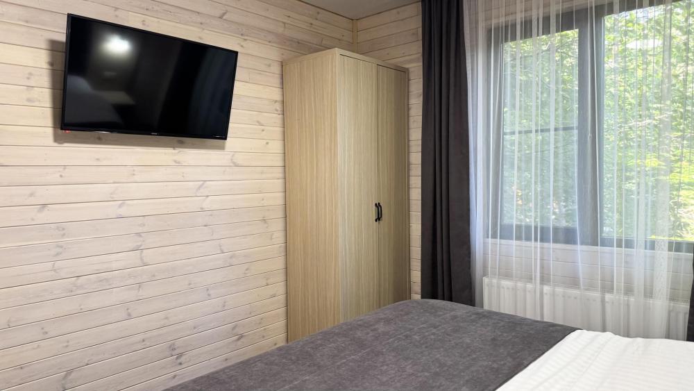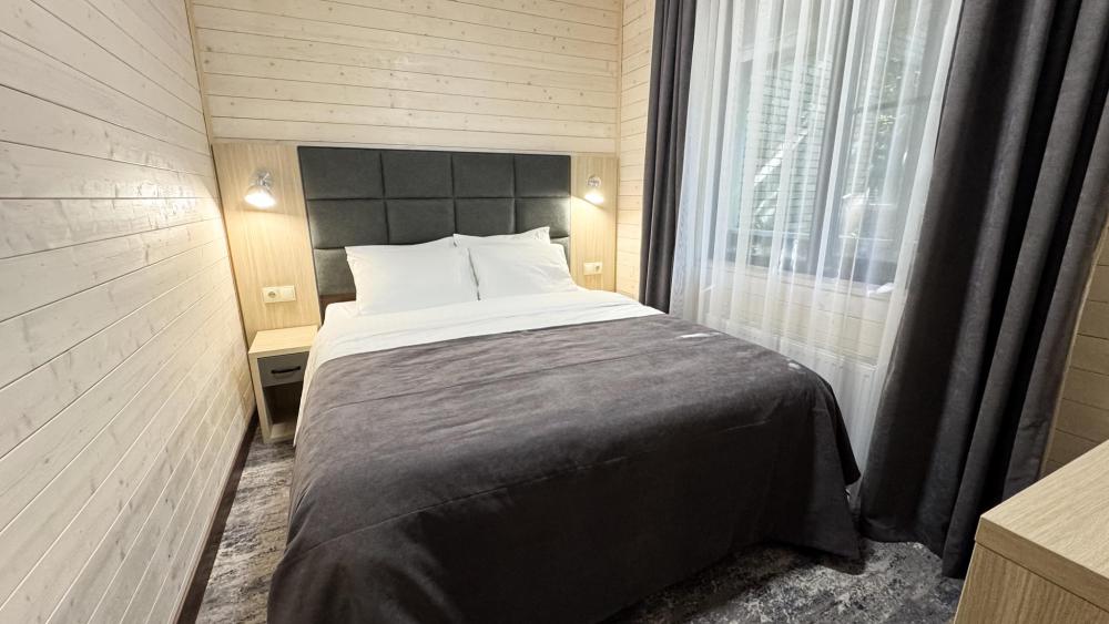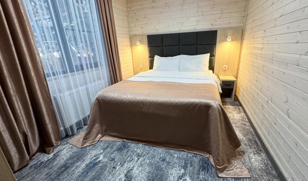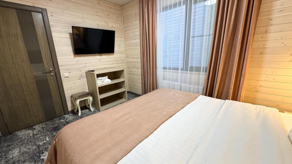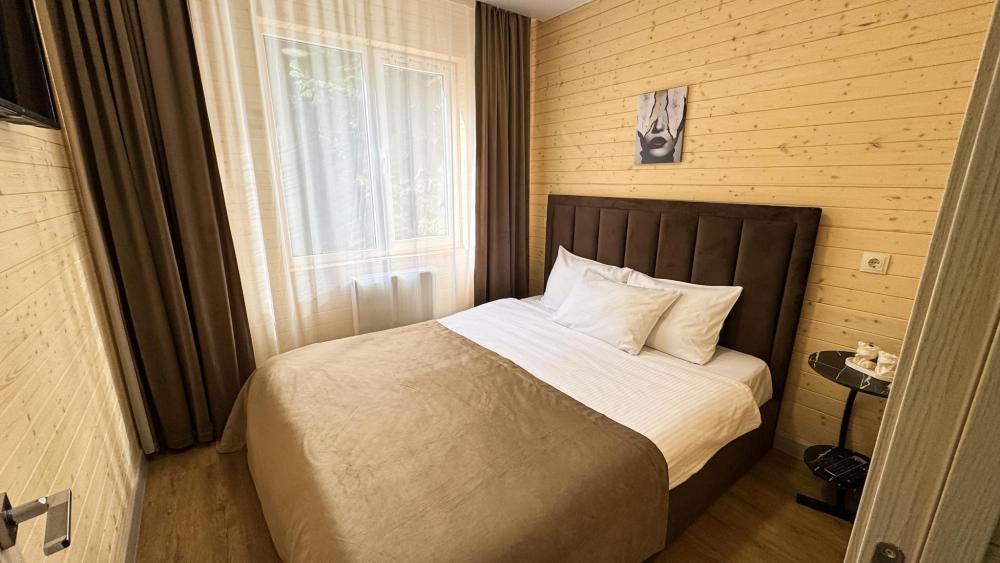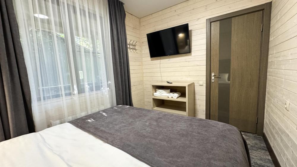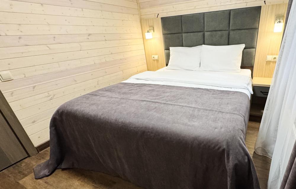 Двухкомнатный номер общей площадью 26 кв.м. (гостиная и спальня). Вместимость до 4 человек — (2 доп. места диван-кровать). Номер оборудован одной двуспальной кроватью и диваном. Сан. узел с душем, фен, косметические принадлежности (1 раз на заезд-шампунь, гель для душа). ЖК телевизор, СВЧ-печь, холодильник, чайник, набор посуды, прикроватные лампы. Предоставляется набор полотенец – банное, лицевое, для ног по количеству лиц, проживающих в номере. Предоставляется сейф по запросу.