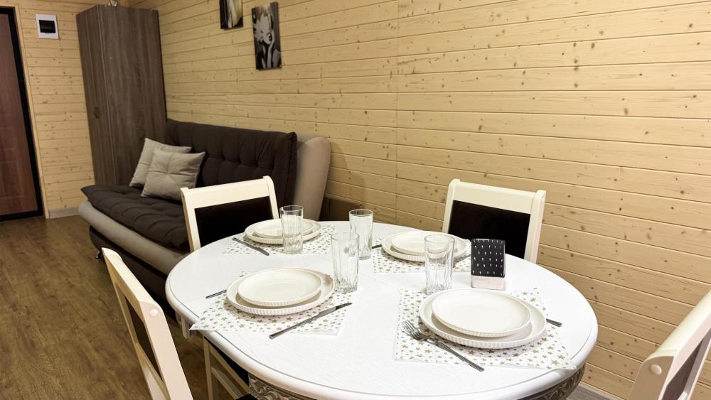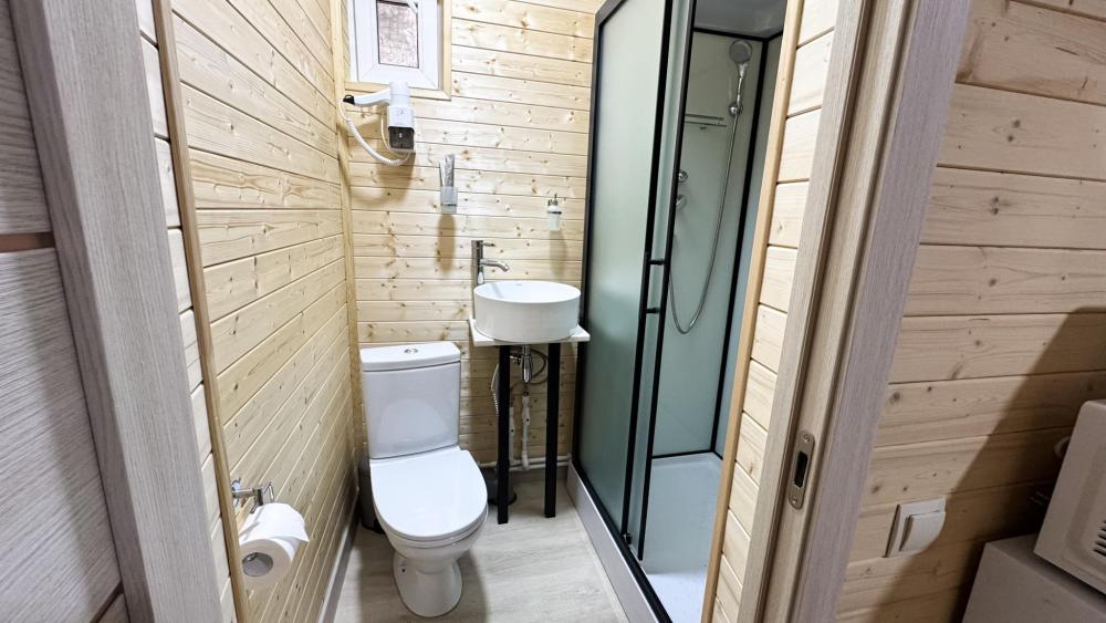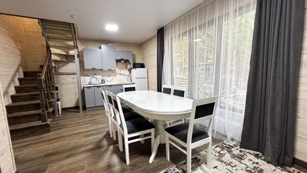 Двухэтажный коттедж состоит из 2 спален, оборудованной кухни –гостиной, прихожей и двух санузлов на каждом этаже. На втором этаже имеется просторный балкон с уличной мебелью. Спальни оснащены двуспальной кроватью, комодами, ТВ, прикроватными тумбами и лампами. Кухня-гостиная оборудована всем необходимым: кухонный гарнитур, плита, раковина, набор посуды и столового инвентаря, холодильник, чайник, СВЧ-печь. Диван-кровать и ТВ, большой стол и стулья по количеству проживающих лиц. Отопление автономное. Сейф. Площадь коттеджа – 66 кв.м.
