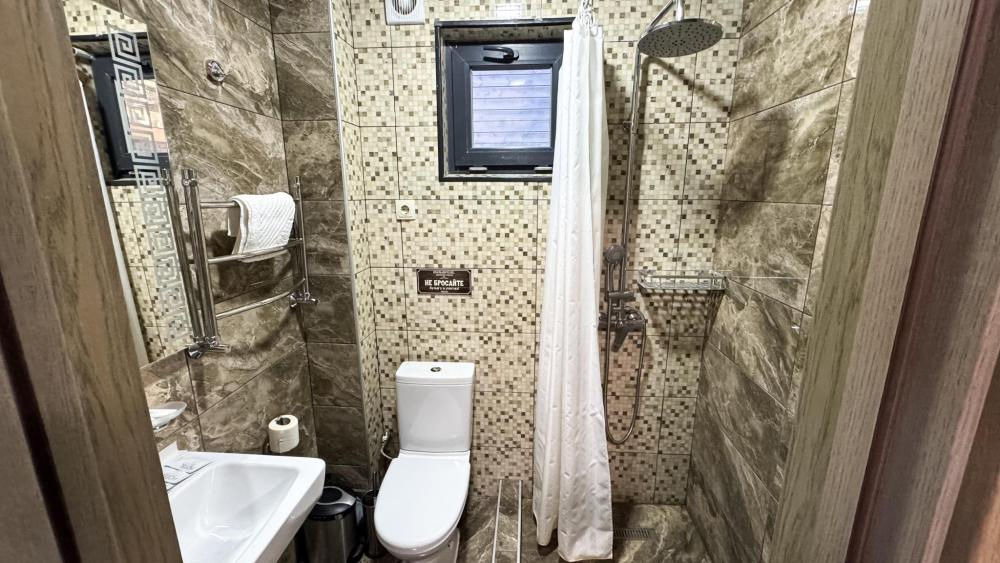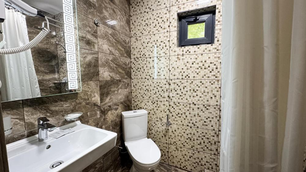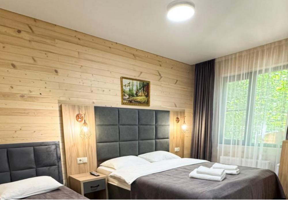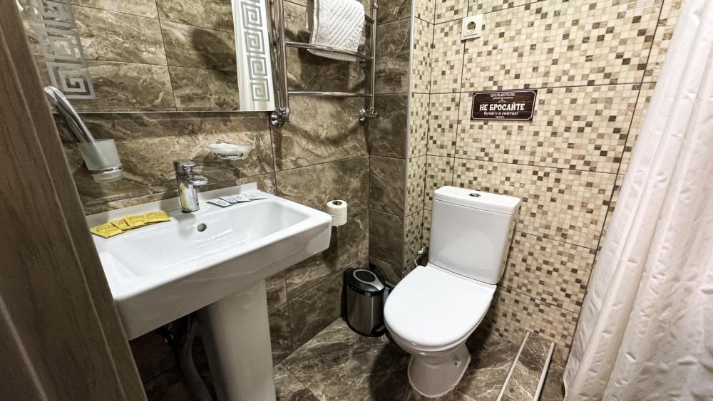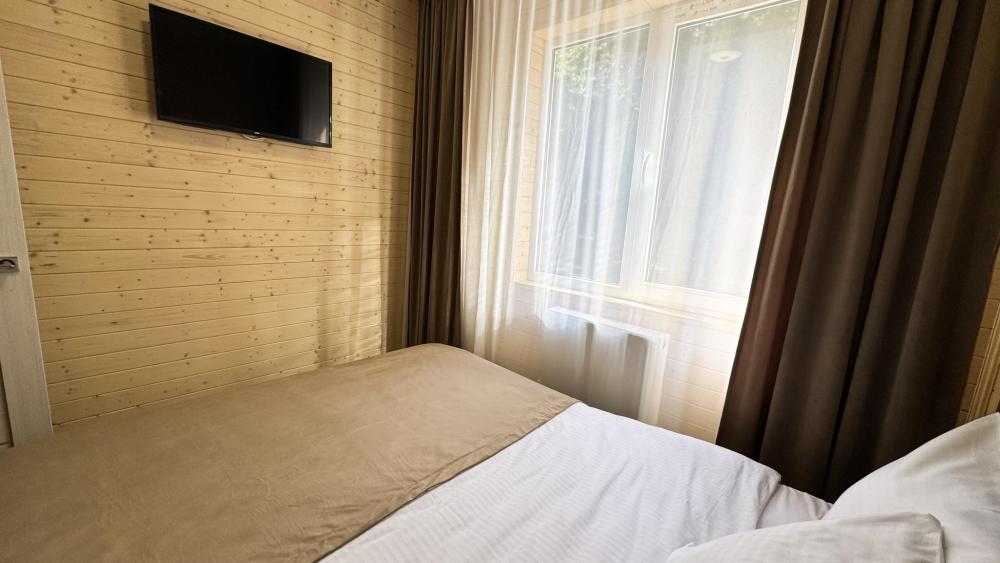 Уютный однокомнатный номер предназначен для комфортного проживания трех человек. Двуспальная кровать или две односпальных кровати. Сан. узел (с душевой кабиной), фен, косметические принадлежности (1 раз на заезд-шампунь, гель для душа). ЖК телевизор, холодильник, чайник, набор посуды, прикроватные лампы. Предоставляется набор полотенец – банное, лицевое, для ног по количеству лиц, проживающих в номере. Площадь номера – 17 кв.м. Предоставляется сейф по запросу.