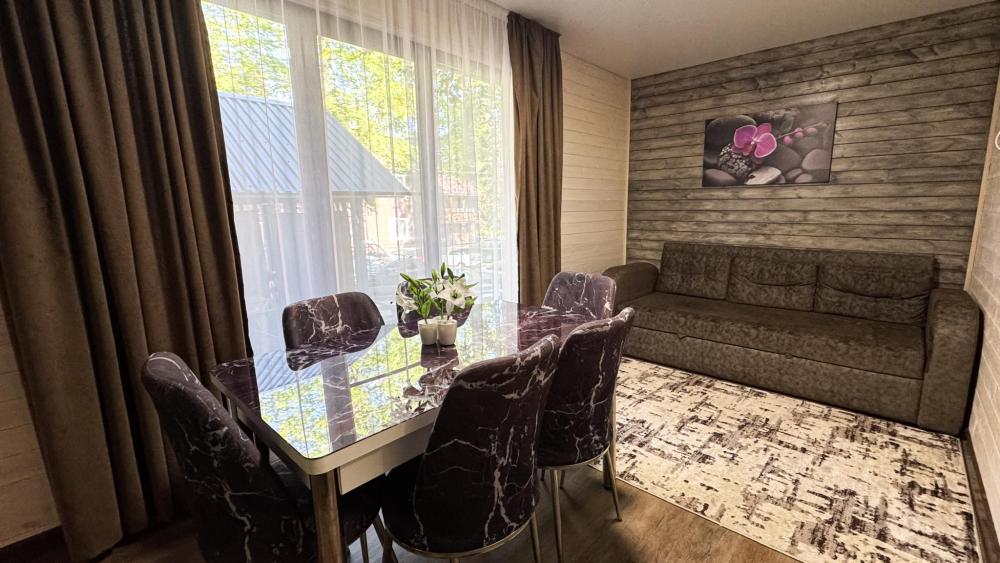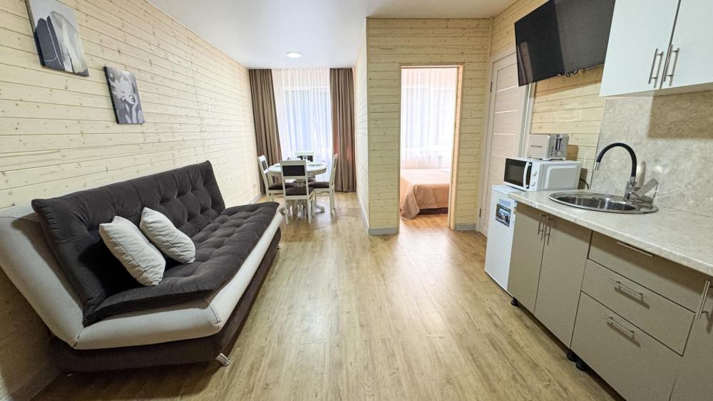 Двухкомнатные апартаменты с отдельным входом имеют спальню с двуспальной кроватью и кухню-гостиную. Вместимость до 4 человек — (2 доп. места диван-кровать). Номер оборудован одной двуспальной кроватью и диваном. Сан. узел с душевой кабиной, фен, косметические принадлежности (1 раз на заезд: шампунь, гель для душа). ЖК телевизор, СВЧ-печь, холодильник, чайник, набор посуды. Предоставляется набор полотенец – банное, лицевое, для ног по количеству лиц, проживающих в номере. Предоставляется сейф по запросу. Площадь – 45 кв.м.