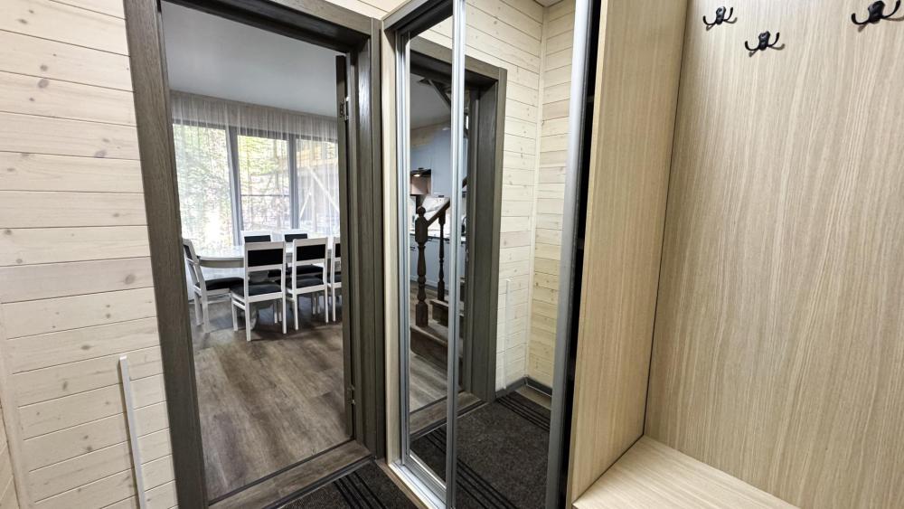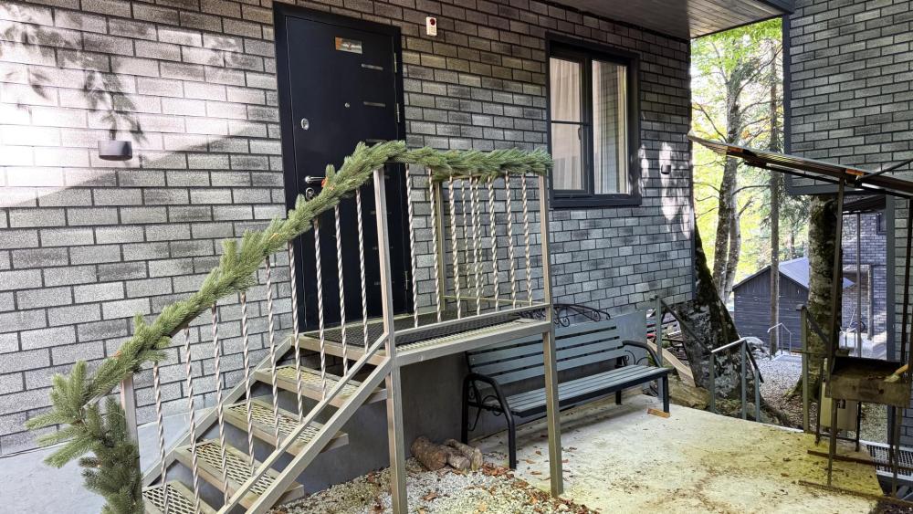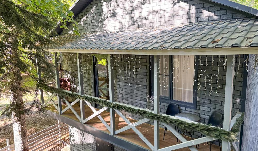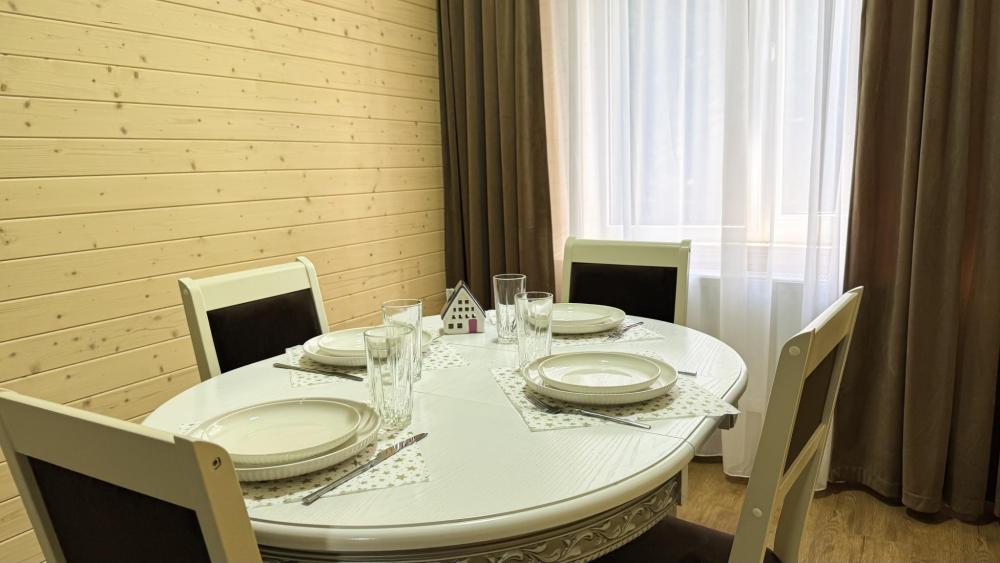 Двухэтажный коттедж состоит из 4 спален, оборудованной кухни –гостиной, прихожей и двух санузлов на каждом этаже. На втором этаже имеется просторный балкон с уличной мебелью. Спальни оснащены двуспальной кроватью, комодами или шкафом, ТВ, прикроватными тумбами и лампами. В одной из спален дополнительно установлено кресло-кровать. Кухня-гостиная оборудована всем необходимым: кухонный гарнитур, плита, раковина, набор посуды и столового инвентаря, холодильник, чайник, СВЧ-печь. Диван-кровать и ТВ, большой стол и стулья по количеству проживающих лиц. Отопление автономное. Сейф. Площадь коттеджа – 99 кв.м.