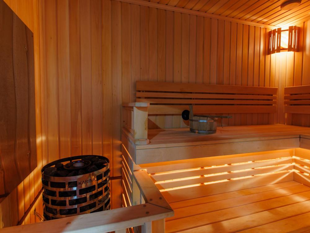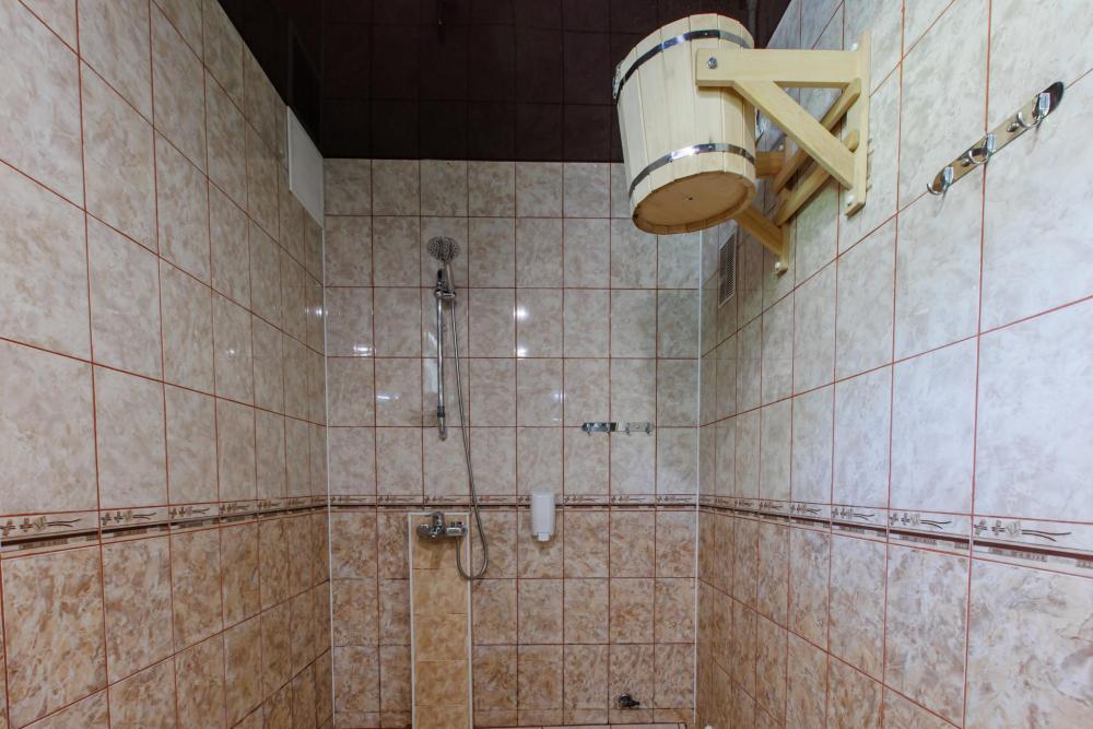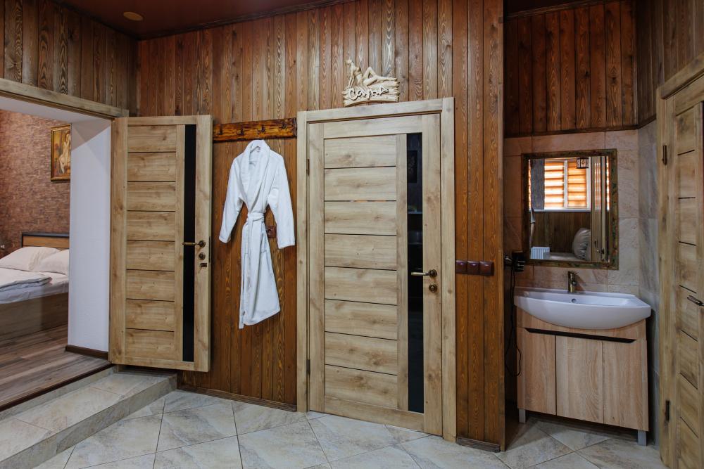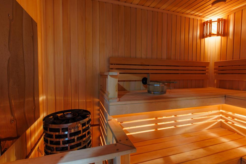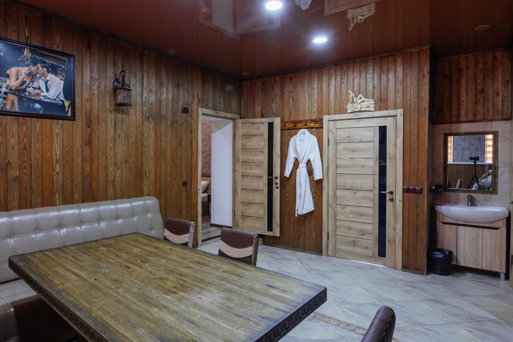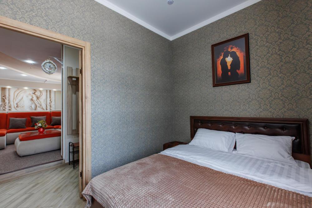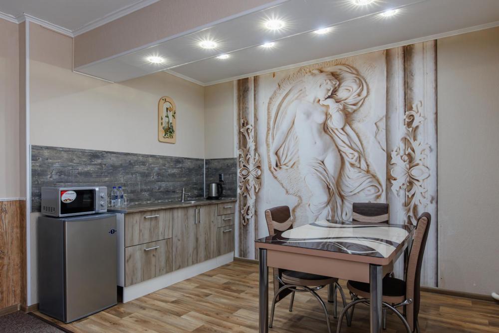 Номер люкс с кухней общей площадью 80 кв.м. для размещения до 4-х гостей (с учетом дополнительного места). Оснащение номера: двухспальная кровать, прикроватные тумбочки, кондиционер, диван, телевизор, холодильник, чайник, обеденная зона, столовые приборы, микроволновая печь, ванная комната с душем, сауна (за дополнительную плату), фен, туалетно-гигиенические принадлежности.