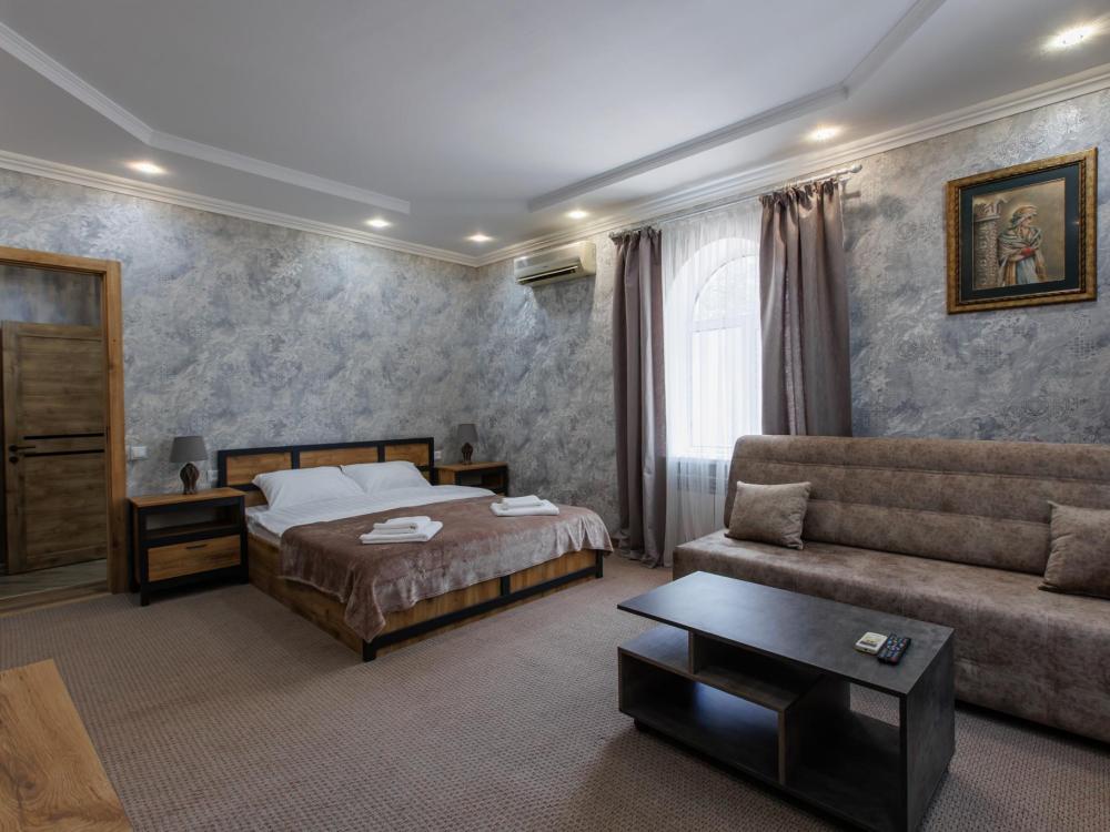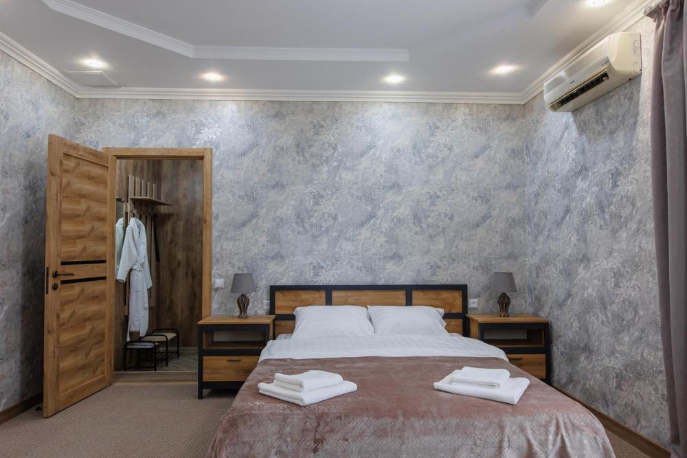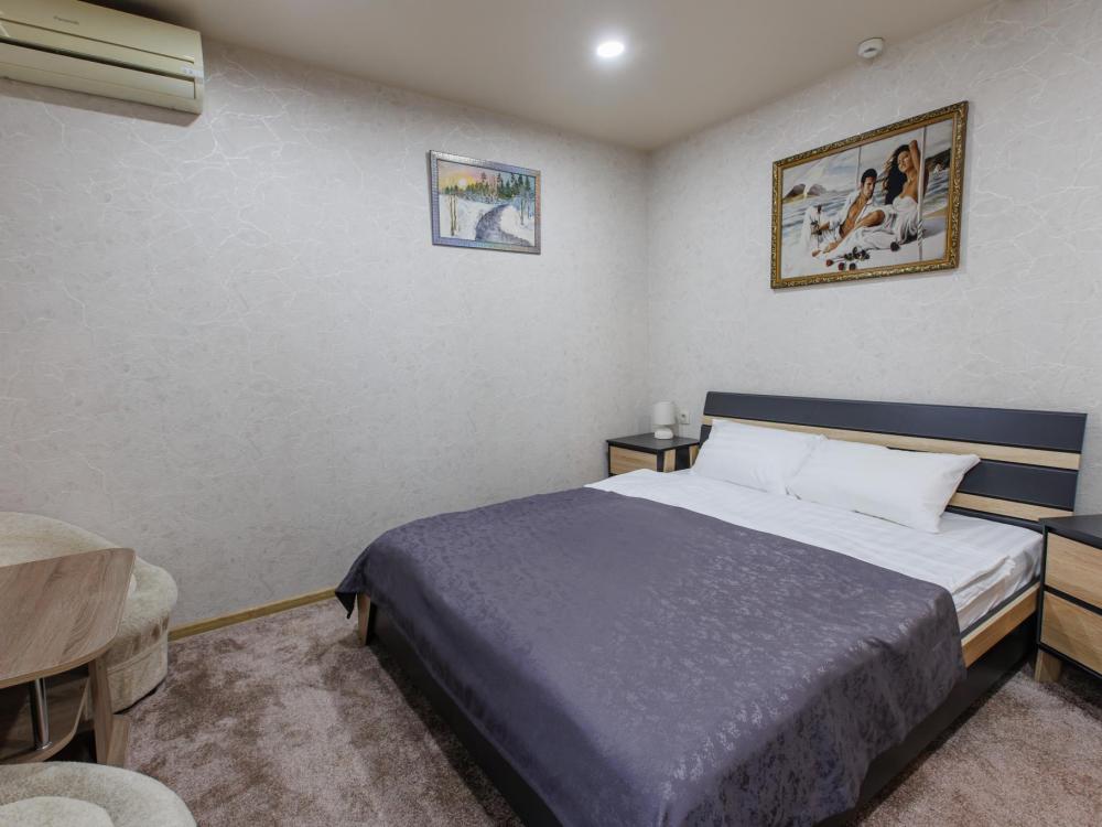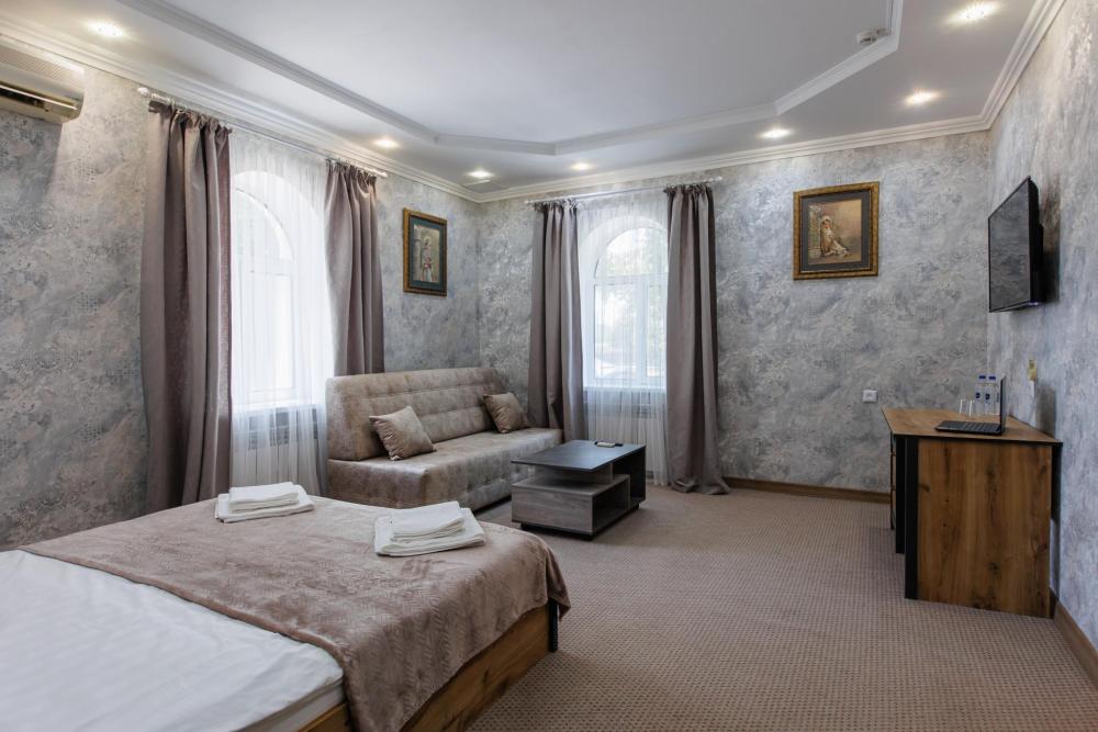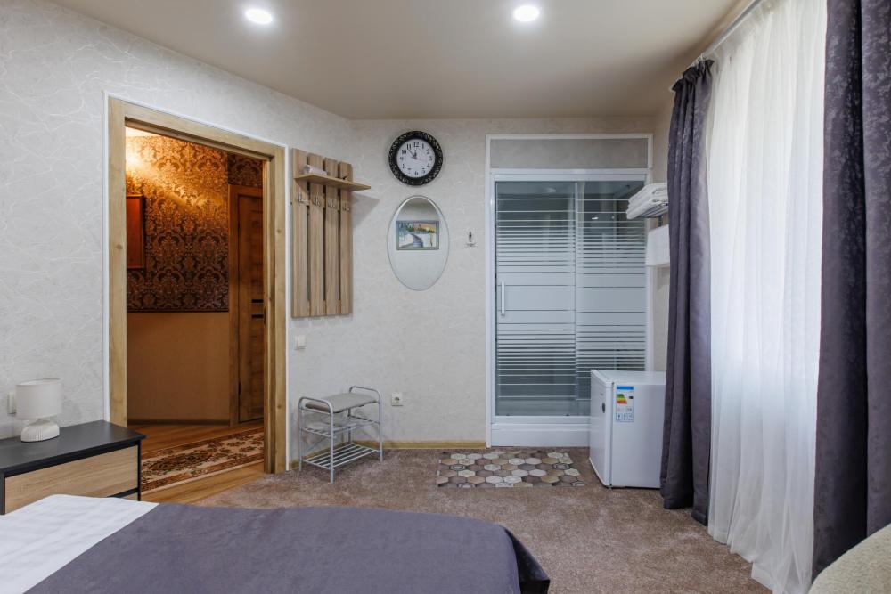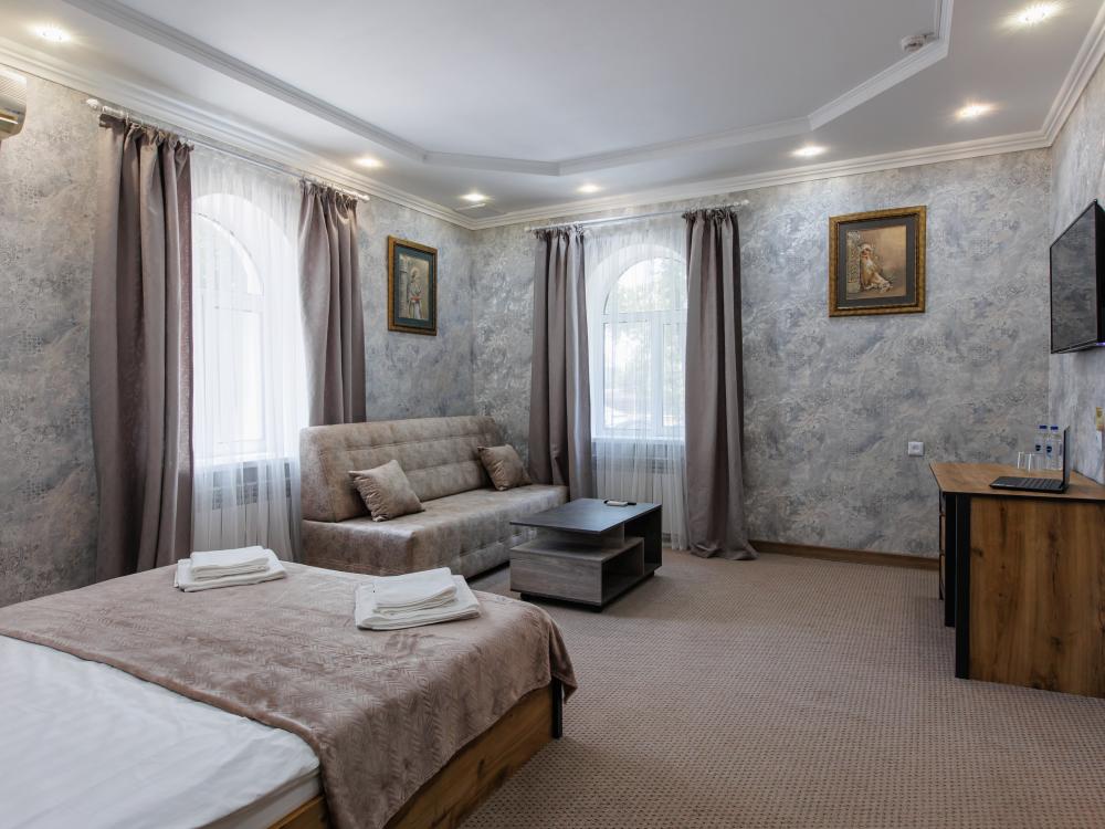 Номер стандарт с двухспальной кроватью общей площадью 40 кв.м. для размещения до 4-х гостей (с учетом дополнительного места). Оснащение номера: двухспальная кровать, прикроватные тумбочки, диван, кондиционер, телевизор, холодильник, ванная комната с душем, фен, туалетно-гигиенические принадлежности.