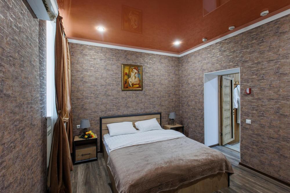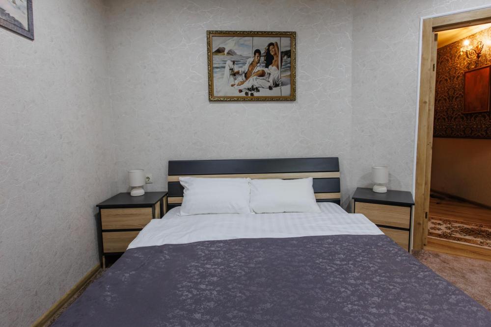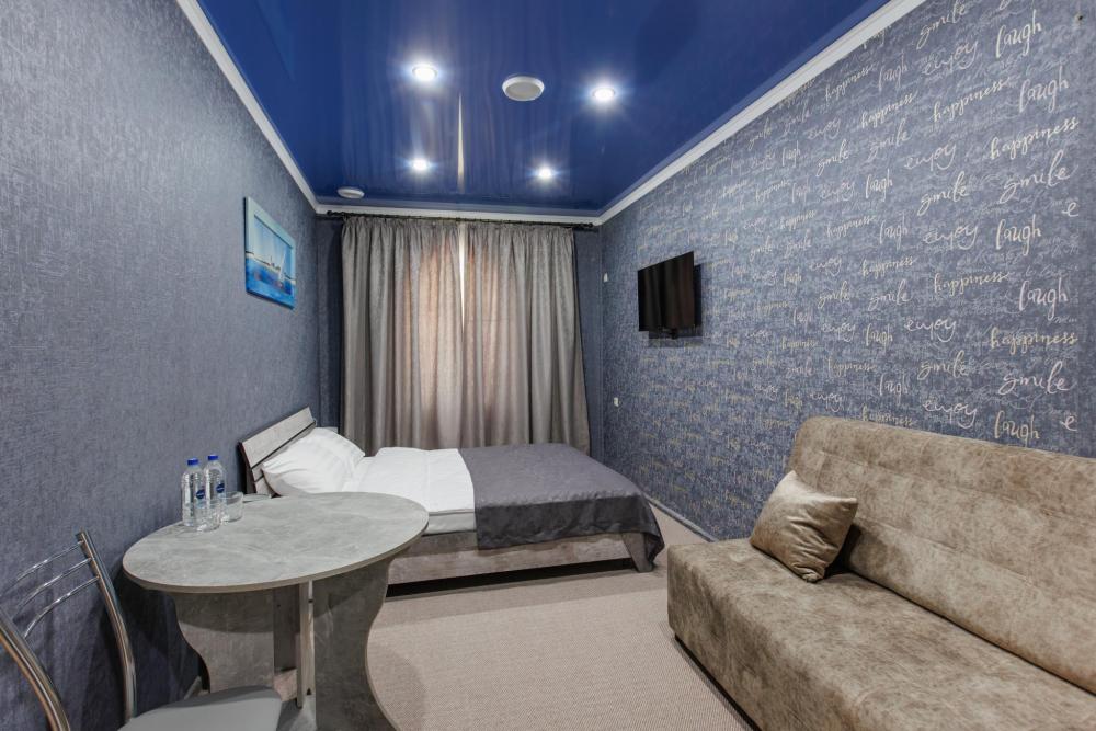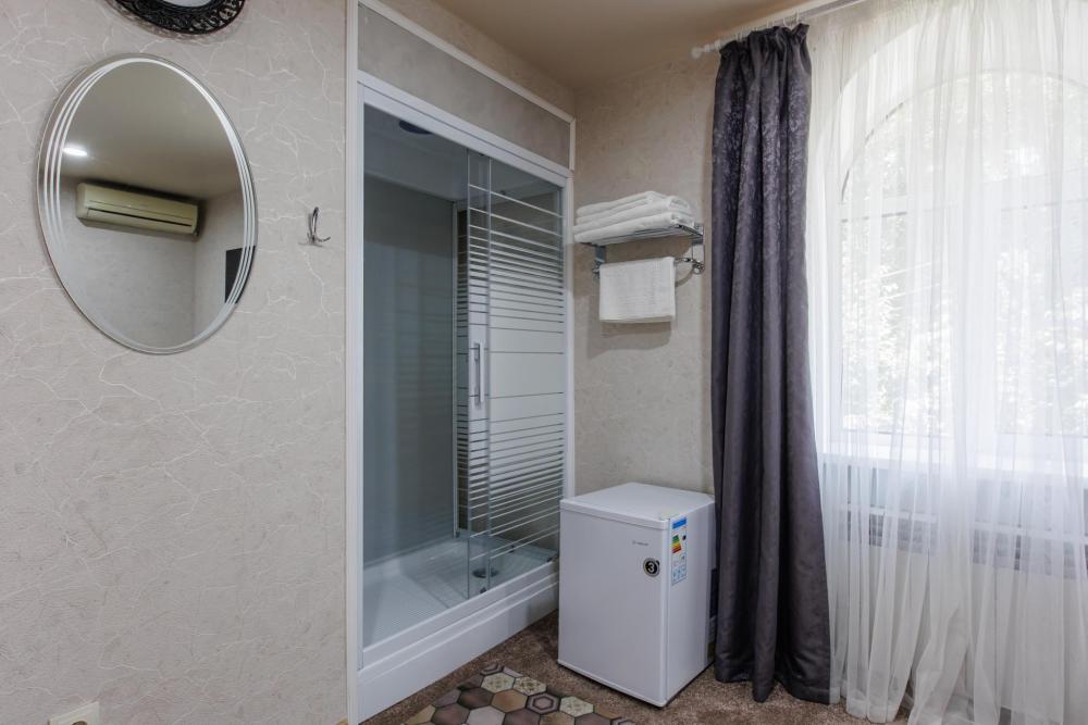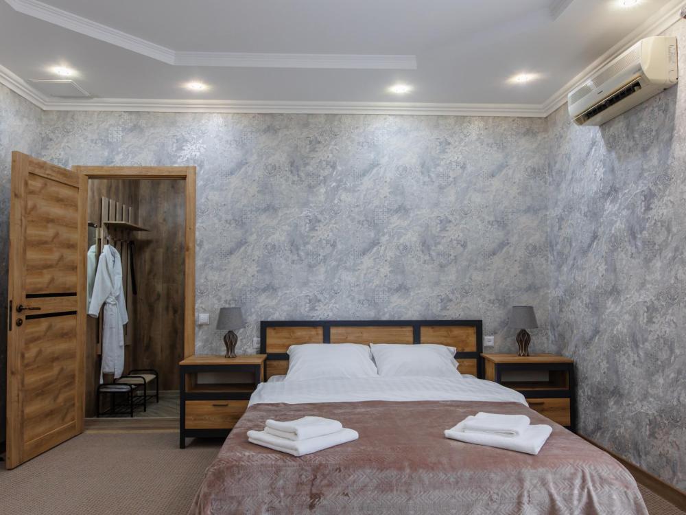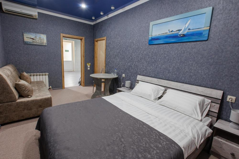 Номер стандарт с двухспальной кроватью общей площадью 40 кв.м. для размещения до 4-х гостей (с учетом дополнительного места). Оснащение номера: двухспальная кровать, прикроватные тумбочки, диван, кондиционер, телевизор, холодильник, ванная комната с душем, фен, туалетно-гигиенические принадлежности.