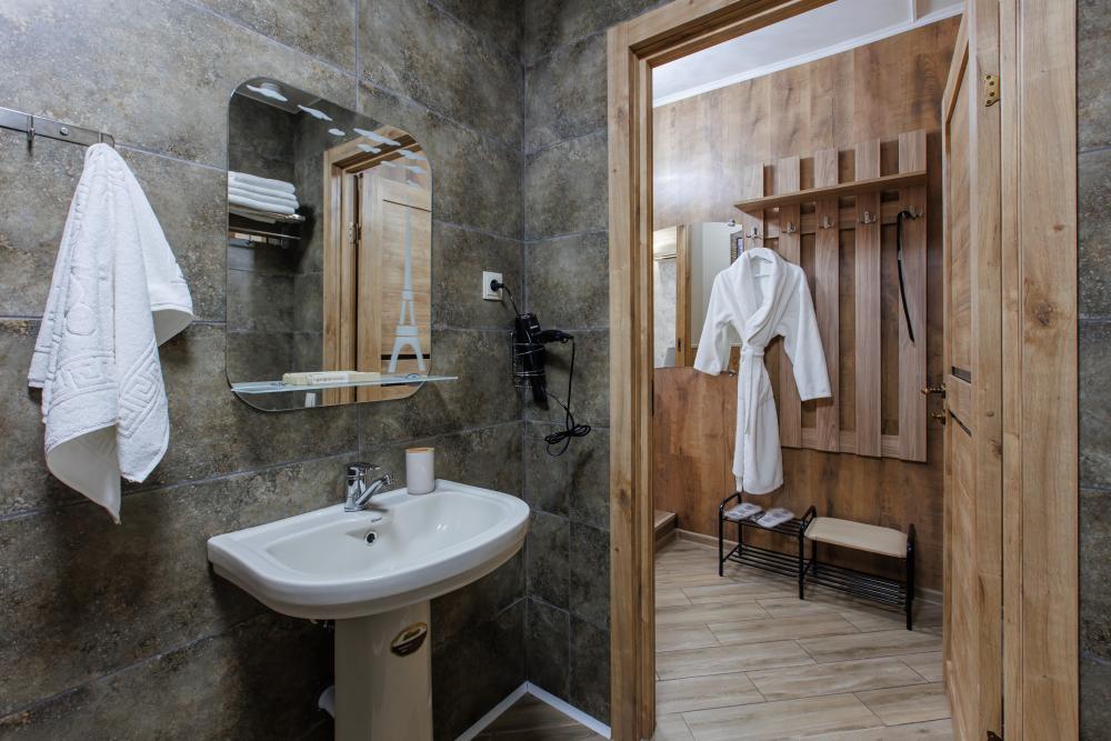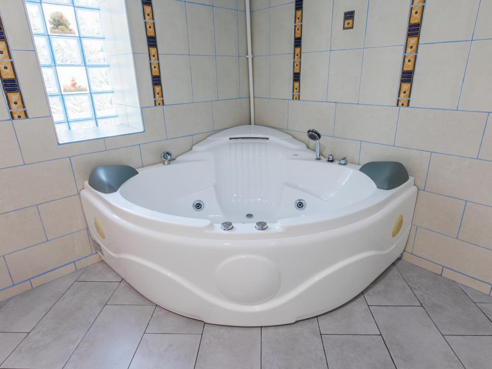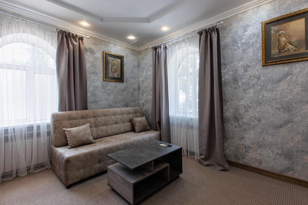 Номер стандарт с гидромассажной ванной общей площадью 60 кв.м. для размещения до 2-х гостей. Оснащение номера: двухспальная кровать, прикроватные тумбочки, диван, кондиционер, телевизор, холодильник, ванная комната с гидромассажной ванной, душ, фен, туалетно-гигиенические принадлежности.