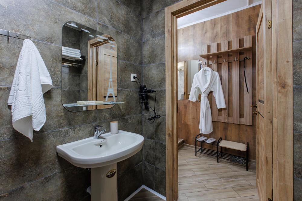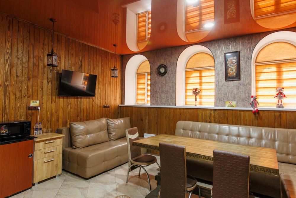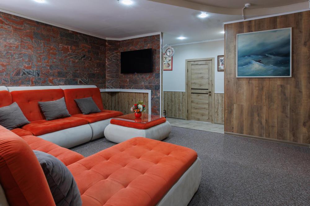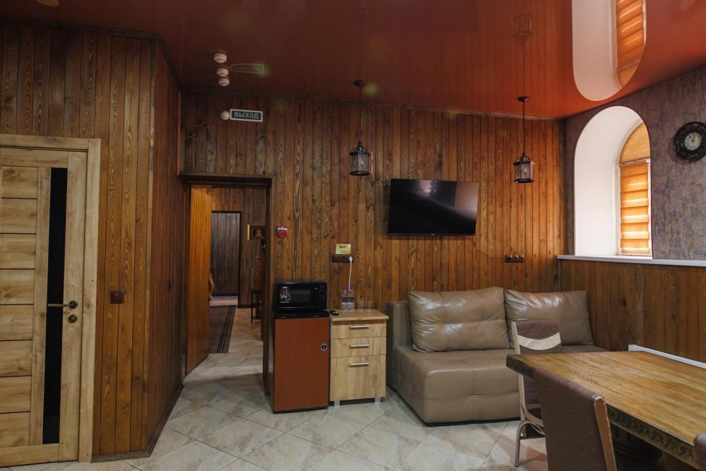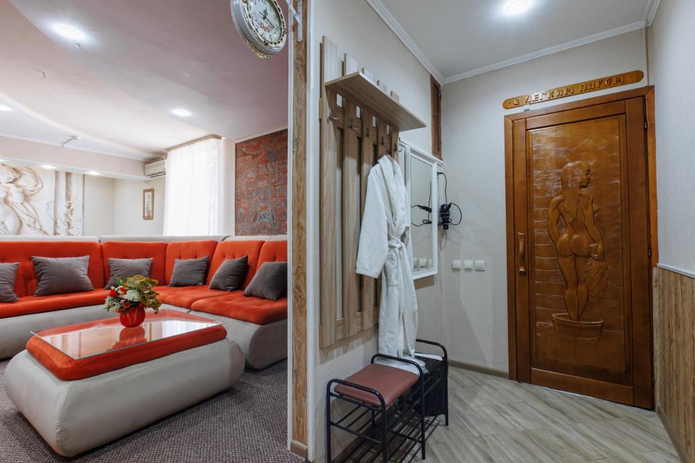 Номер полулюкс семейный общей площадью 70 кв.м. для размещения до 4-х гостей (с учетом дополнительного места). Оснащение номера: двухспальная кровать, прикроватные тумбочки, кондиционер, диван, телевизор, холодильник, чайник, обеденная зона, микроволновая печь, ванная комната с душем, сауна (за дополнительную плату), фен, туалетно-гигиенические принадлежности.