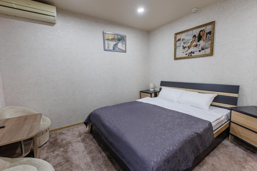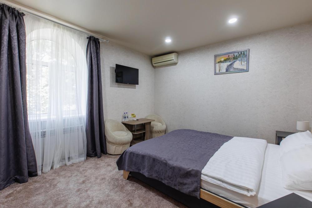 Номер эконом с двухспальной кроватью общей площадью 22 кв.м. для размещения до 2-х гостей. Оснащение номера: двухспальная кровать, прикроватные тумбочки, кондиционер, телевизор, холодильник, душ, фен, туалетно-гигиенические принадлежности, набор полотенец.