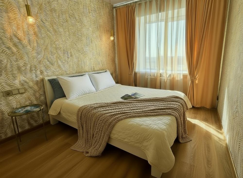 Однокомнатные апартаменты для 4 гостей. Спальные места: двуспальная кровать и диван. К услугам гостей кондиционер; беспроводной интернет и телевизор; стиральная машина; фен; утюг и гладильная доска. Кухня со всем необходимым для приготовления пищи. Предоставляется стиральный порошок, шампунь, т.бумага, жидкое мыло, ср.для мытья посуды.