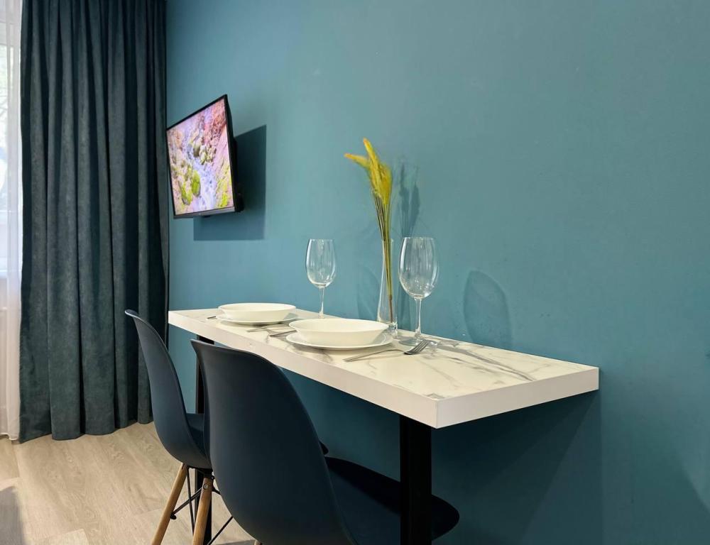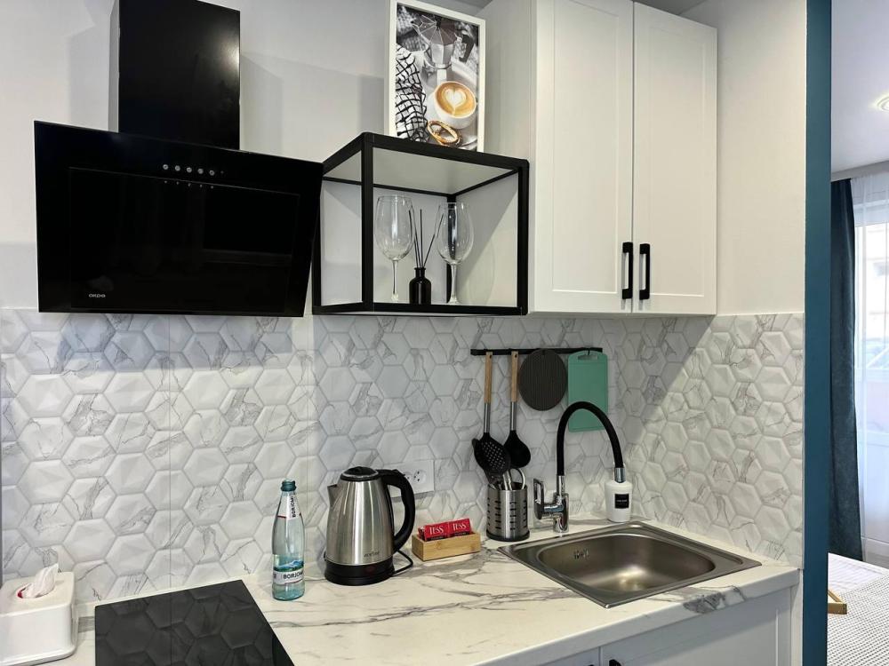 Апартаменты студия для 2гостей. Спальные места: диван. К услугам гостей постельное белье и полотенца; кондиционер; беспроводной интернет и телевизор с плоским экраном, стиральная машина, утюг и гладильная доска, фен. Кухня со всем необходимым для приготовления пищи.