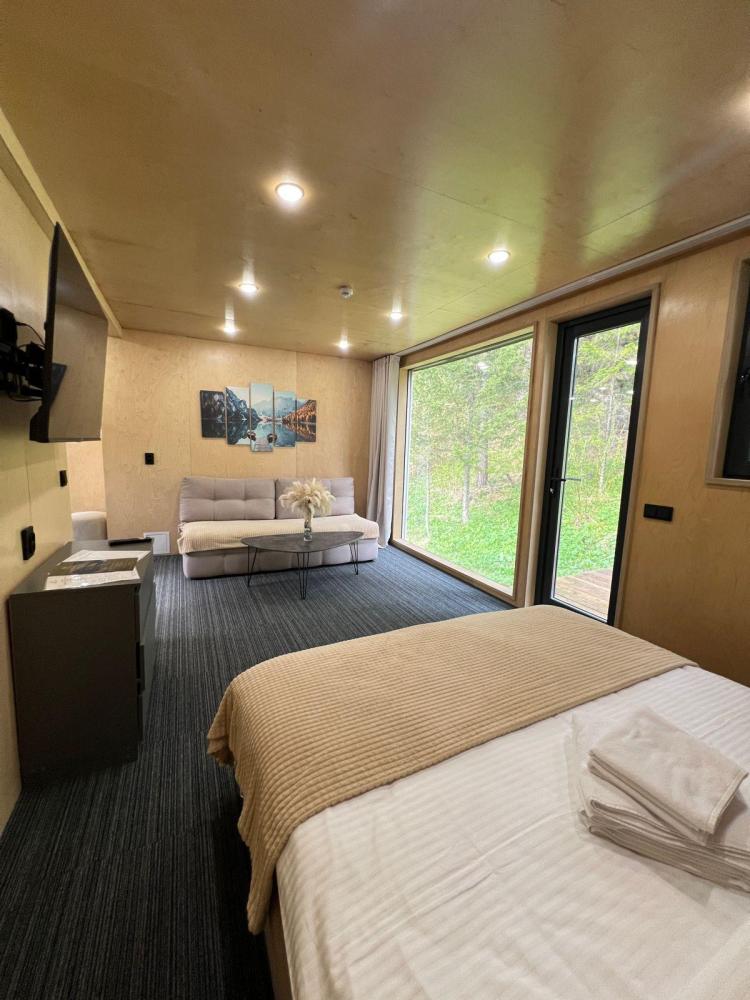 В просторной комнате - двуспальная кровать с комфортным ортопедическим матрасом с топпером, и нежным белоснежным постельным бельём. В наличии - дополнительное спальное место - раскладной удобный диван. Внутри домиков: - кухонная зона - персональная ванна , туалет, фен, белые полотенца, косметические наборы - телевизор SMART TV - холодильник - раскладной диван - комод для вещей - журнальный столик - зона прихожей (шкаф с большим зеркалом во весь рост) В Домиках - тепло и уютно, полы с подогревом (терморегулятор - для установки комфортной температуры). У каждого домика снаружи есть своя терраса с двумя креслами и столиком.