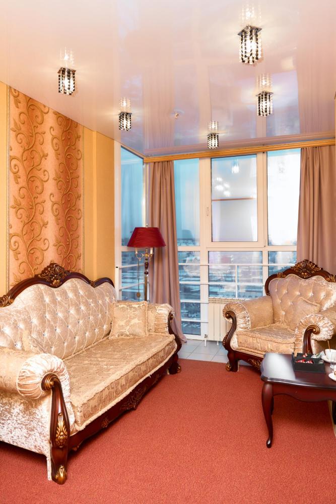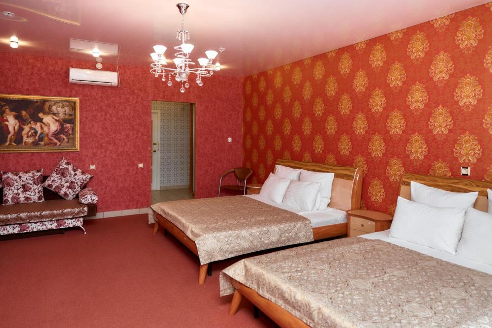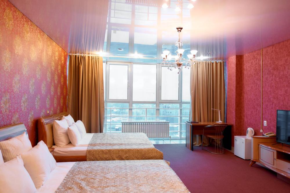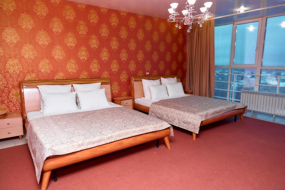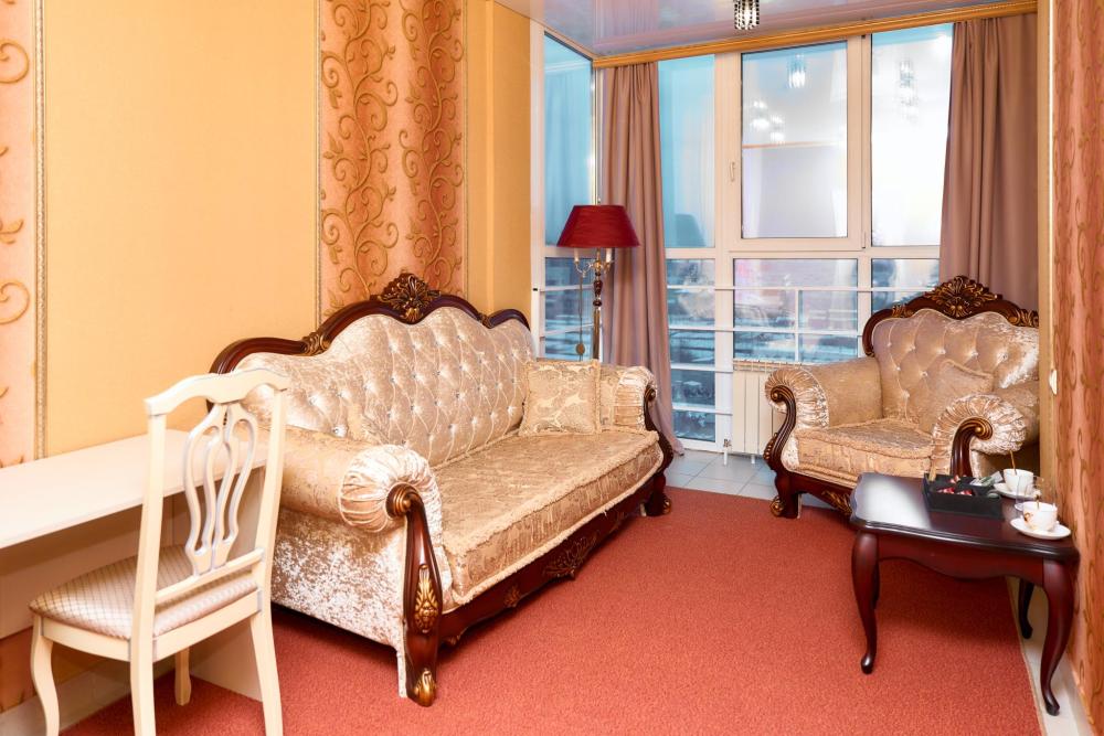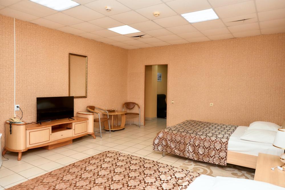 Площадь номера составляет 50 м. кв. В номере: Две 2-х спальные кровати, диван, телевизор, холодильник, телефон, чайник, кондиционер не во всех номерах, сейф, письменный стол, журнальный стол, шкаф-купе, халат, тапочки, чай кофе, сахар, чоко-пай (пополняется ежедневно). Ванная комната: ванная с душем, унитаз, фен, предметы личной гигиены, набор полотенец. Номеру присвоена 1 категория.