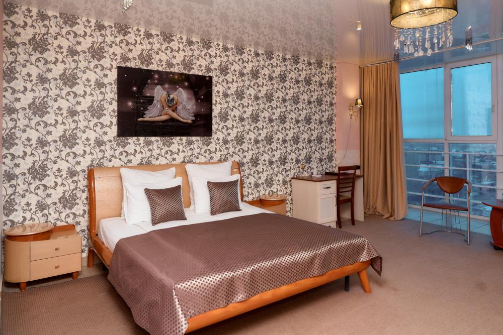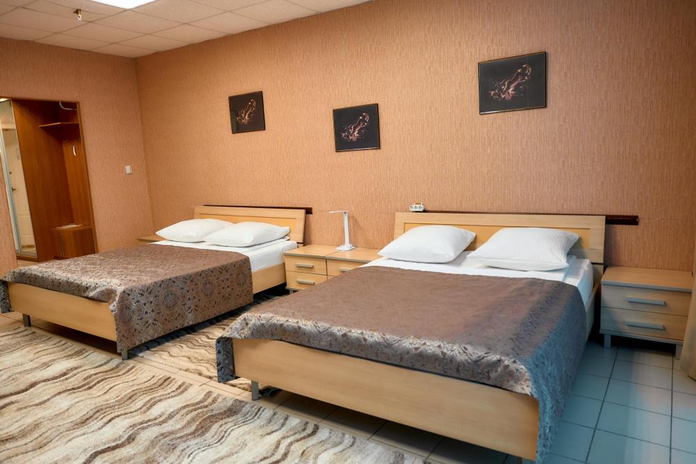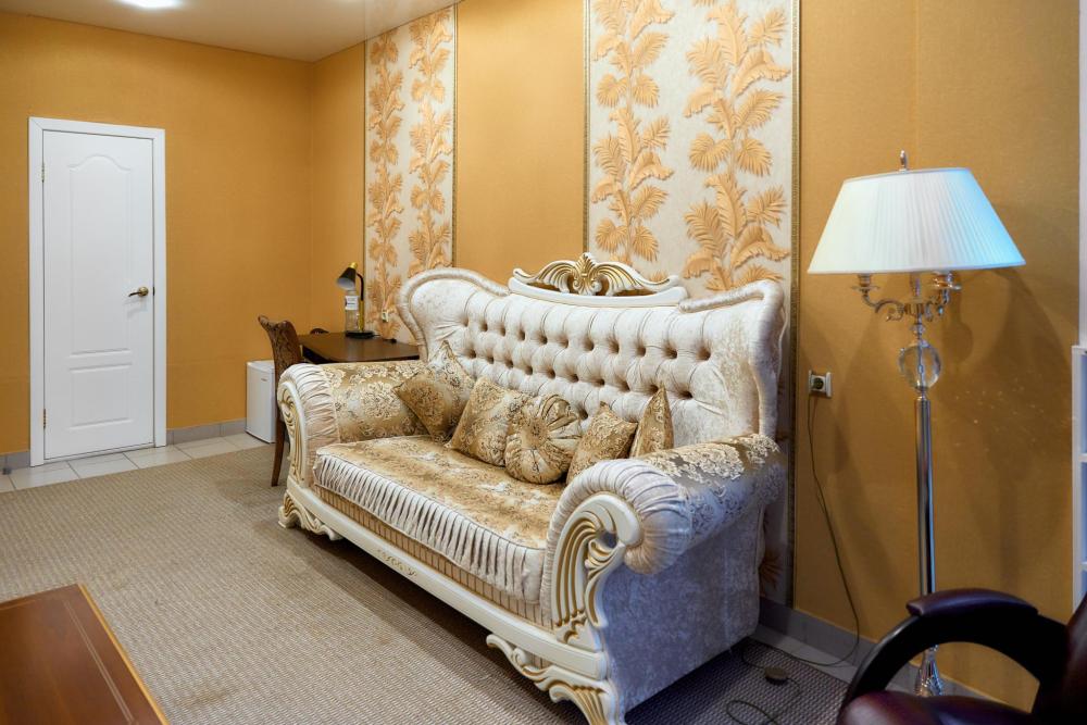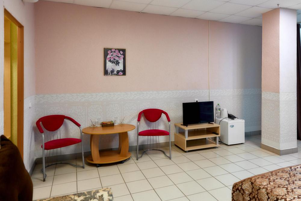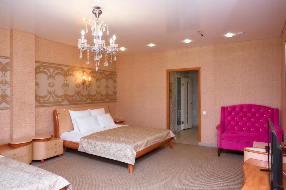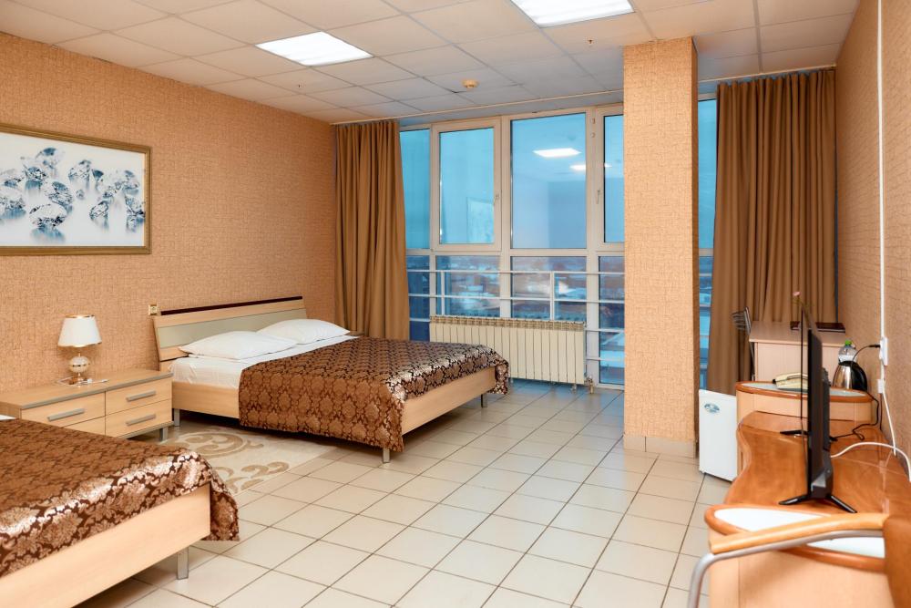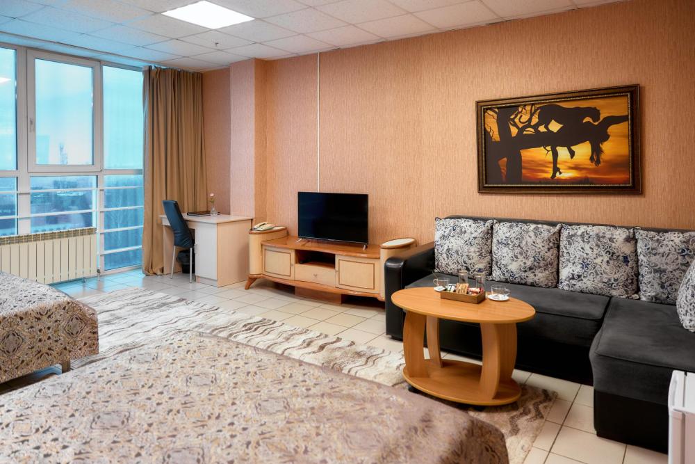 Площадь номера составляет 50 м. кв. В номере: Две 2-х спальные кровати, диван, телевизор, холодильник, телефон, чайник, кондиционер не во всех номерах, сейф, письменный стол, журнальный стол, шкаф-купе, халат, тапочки, чай кофе, сахар, чоко-пай (пополняется ежедневно). Ванная комната: ванная с душем, унитаз, фен, предметы личной гигиены, набор полотенец. Номеру присвоена 1 категория.