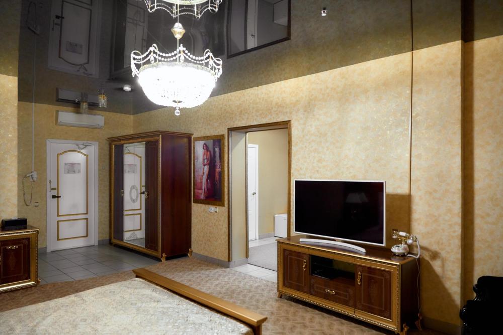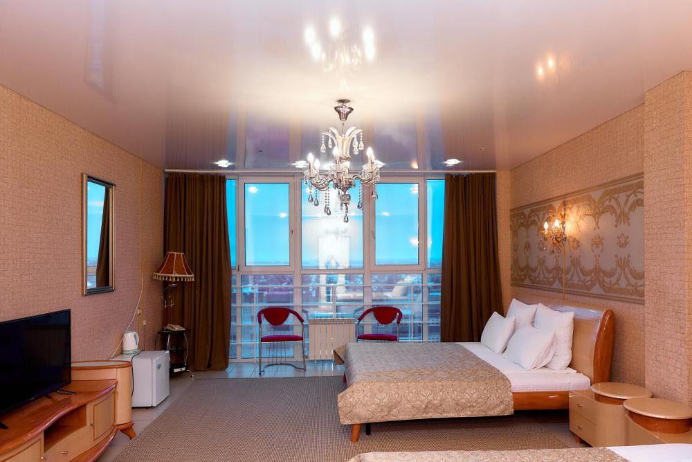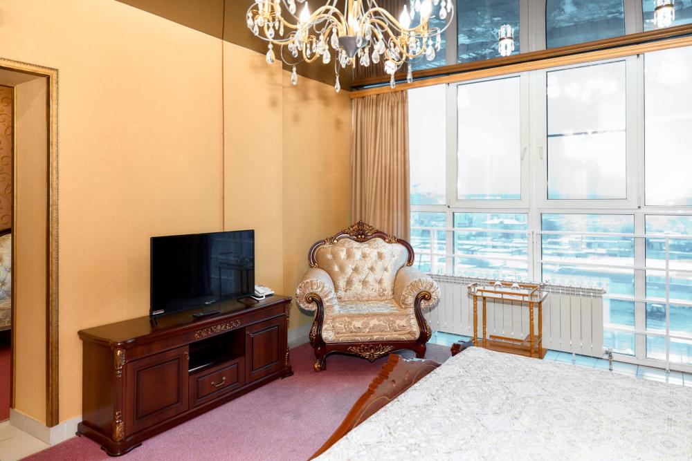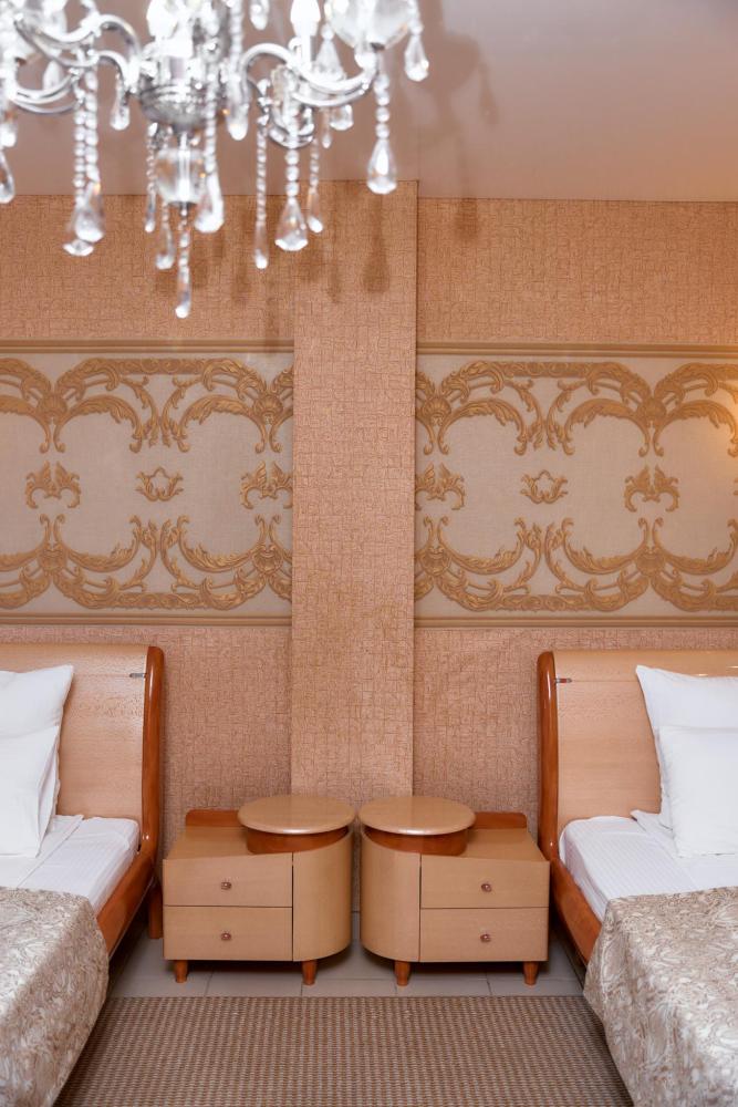 Площадь номера составляет 55 м.кв. В номере: Две 2-х спальные кровати, диван, телевизор, холодильник, телефон, кондиционер не во всех номерах, сейф, письменный стол, журнальный стол, шкаф-купе, халат, тапочки, чайник ,чай ,кофе, сахар, чоко-пай . Ванная комната:ванная с душем, унитаз, фен, предметы личной гигиены, набор полотенец.