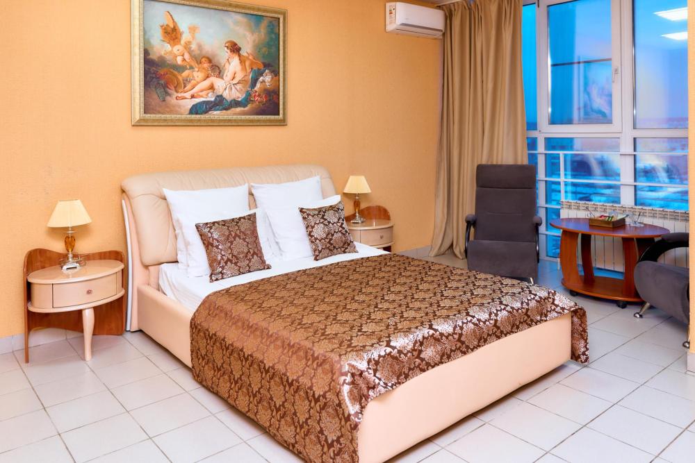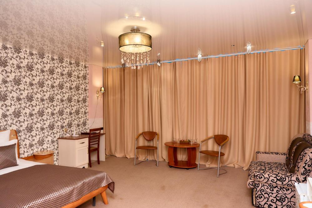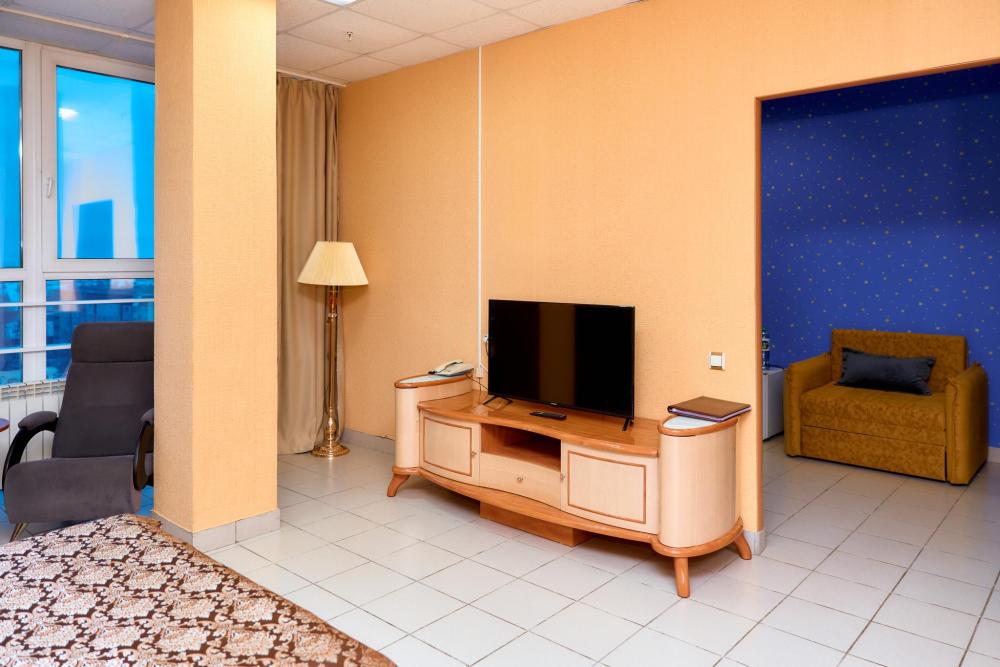 Площадь номера составляет 37 м.кв. В номере: 2-х спальная кровать, диван, телевизор, холодильник,чайник, телефон, кондиционер, сейф, письменный стол, шкаф-купе, халат, тапочки, чайная церемония (чай,кофе,сахар,чоко-пай)пополняется ежедневно. Ванная комната: Ванная с душем,унитаз, фен, предметы личной гигиены, полотенце банное,лицевое,ножное. Номеру присвоена 1 категория.