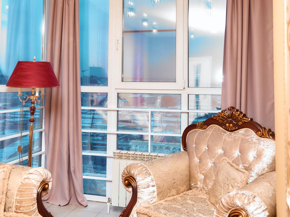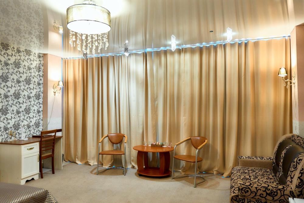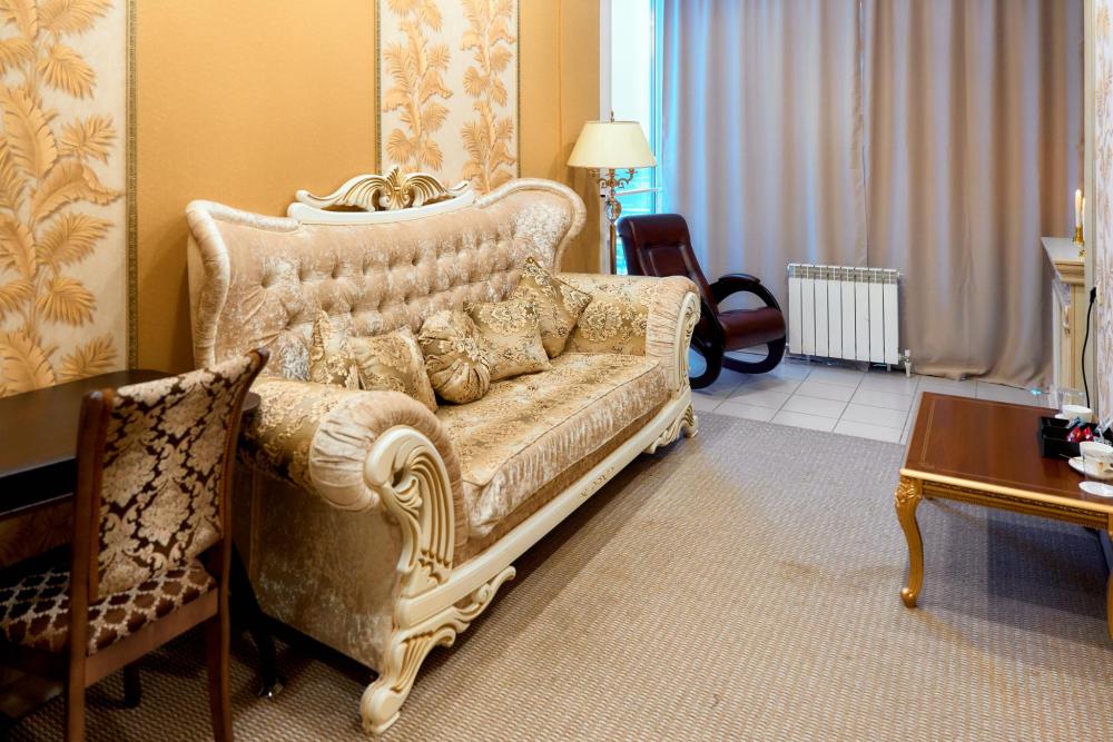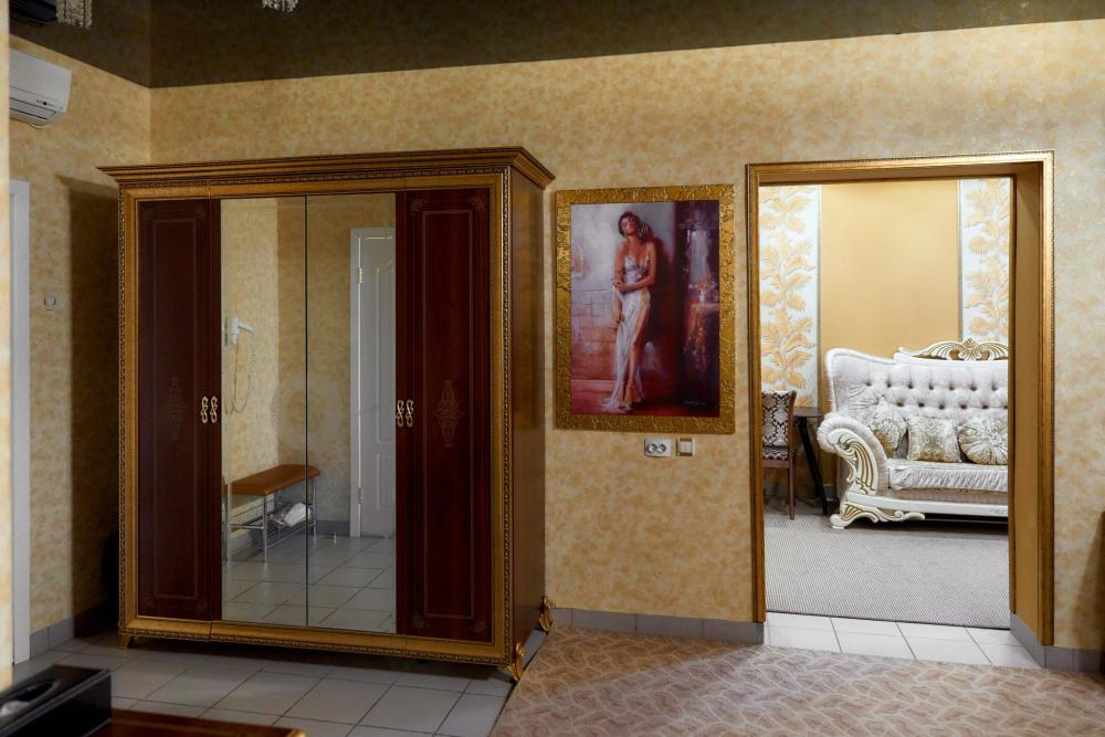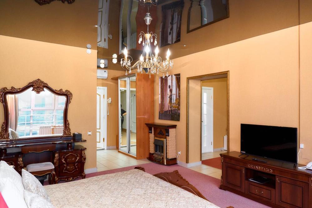 Президентский номер гостиницы состоит из 2 комнат, общей площади 60 кв.м. В номере: Сейф, Телевизор, Кондиционер,Телефон, 2-х спальная кровать, диван, кресло-качалка, камин, туалетный столик с зеркалом, холодильник, журнальный столик, сервировочный столик, шкаф-купе, халат(мужской женский), тапочки, чайник, чайный набор, мини-бар (пополняемый ежедневно). Ванная комната: Душевая кабина, унитаз, фен, косметика премиум класса,набор полотенец. Номеру присвоена категория люкс.