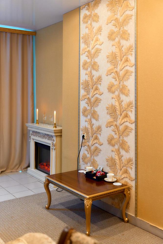 Площадь номера составляет 55м.кв. В номере: 2-х спальная кровать, диван, телевизор, камин, холодильник, телефон , кондиционер не во всех номерах, сейф, письменный стол, журнальный стол, обеденный столик сервированный посудой, шкаф-купе, халат, тапочки, чай кофе, мини-бар. Ванная комната: душевая кабина, унитаз, фен. косметика Премиум класса,набор полотенец. Номеру присвоена 1 категория.